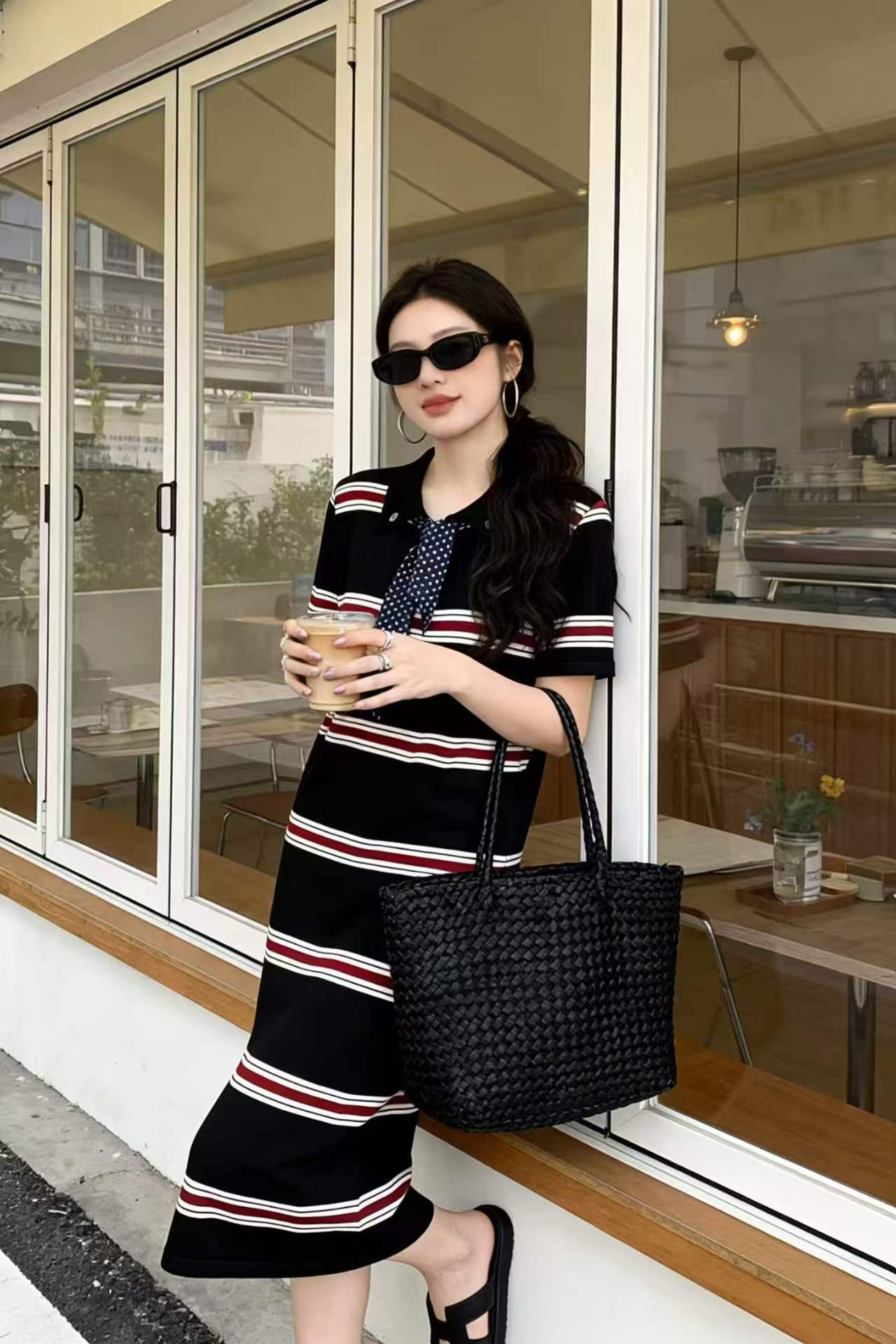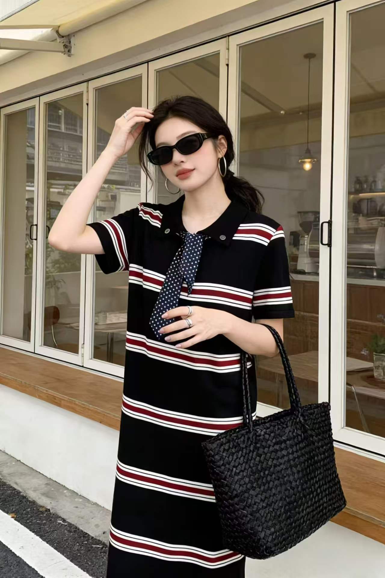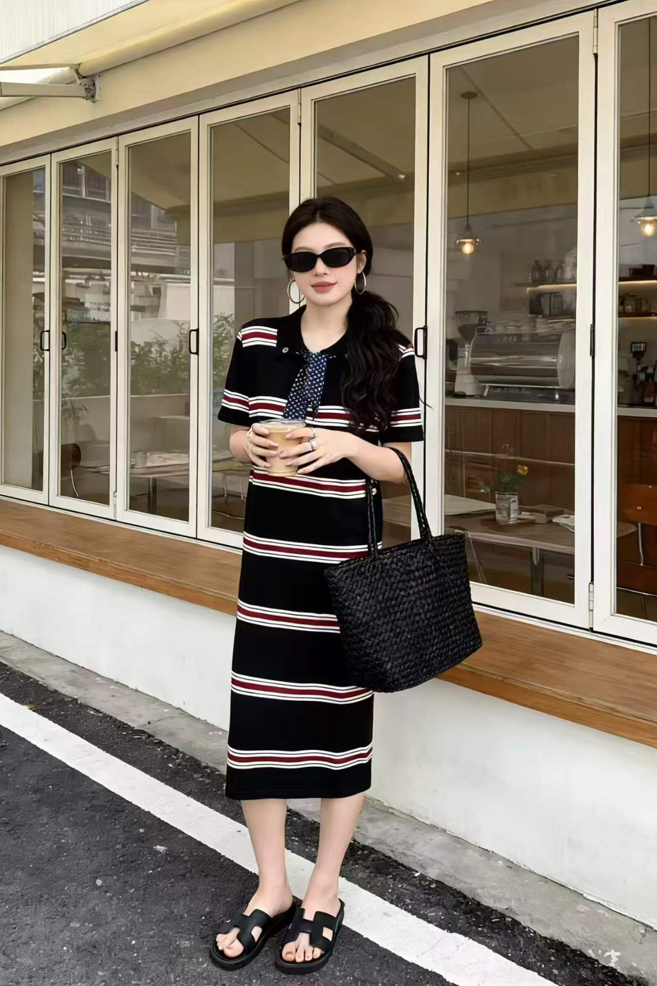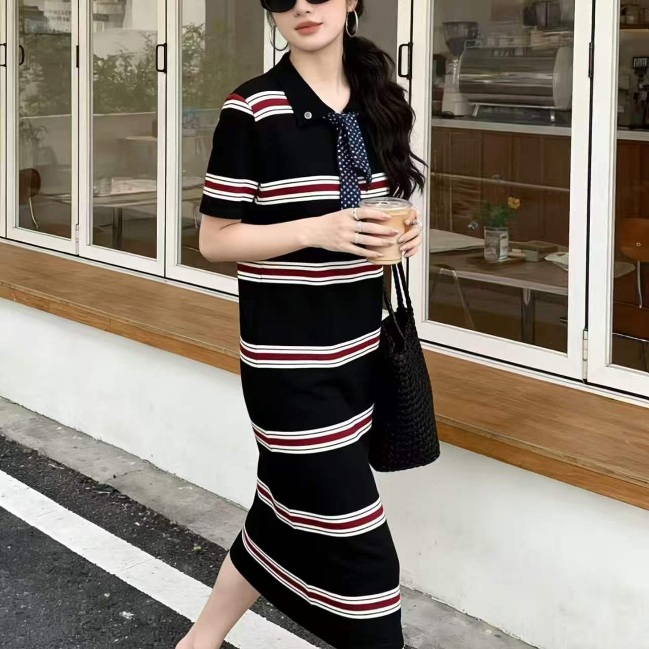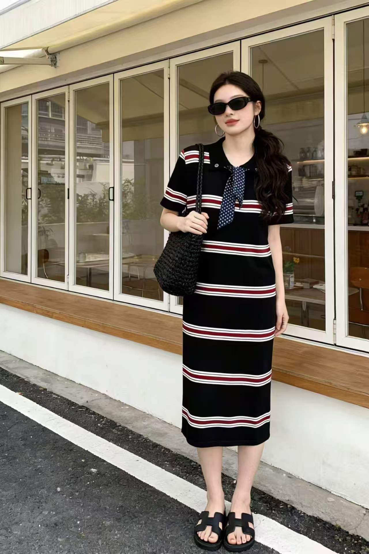 임산부 드레스 스트라이프 니트 POLO 칼라 납 축제 롱 스커트 임산부