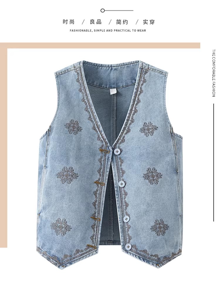 유럽 역 고급 센스 V넥 데님 조끼 여자 자수 싱글 줄 버튼 패션 얇은 스타일 민소매 조끼 자켓 여름