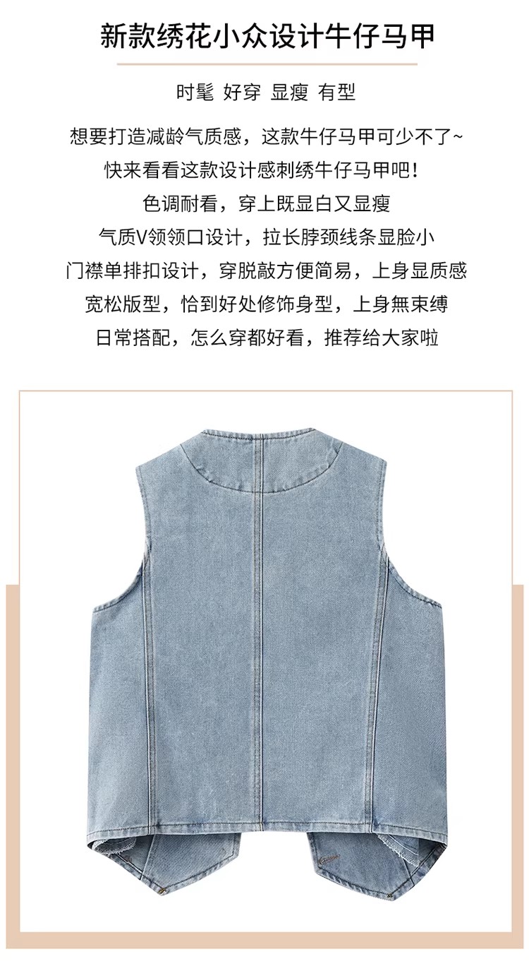 유럽 역 2026 봄 새로운 유럽 상품 여성 V넥 자수 작은 대중 디자인 다용도 쇼트 스타일 데님 조끼