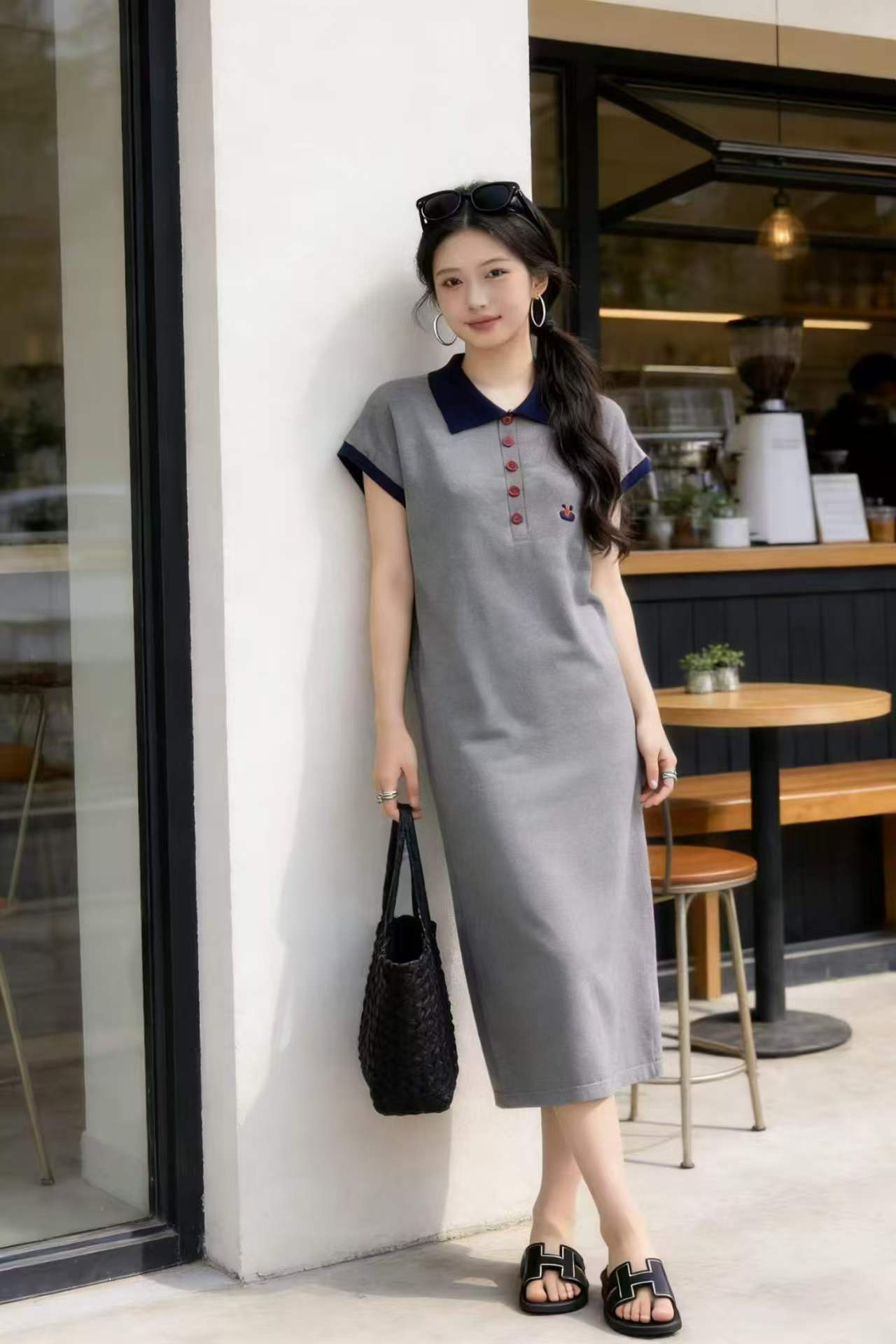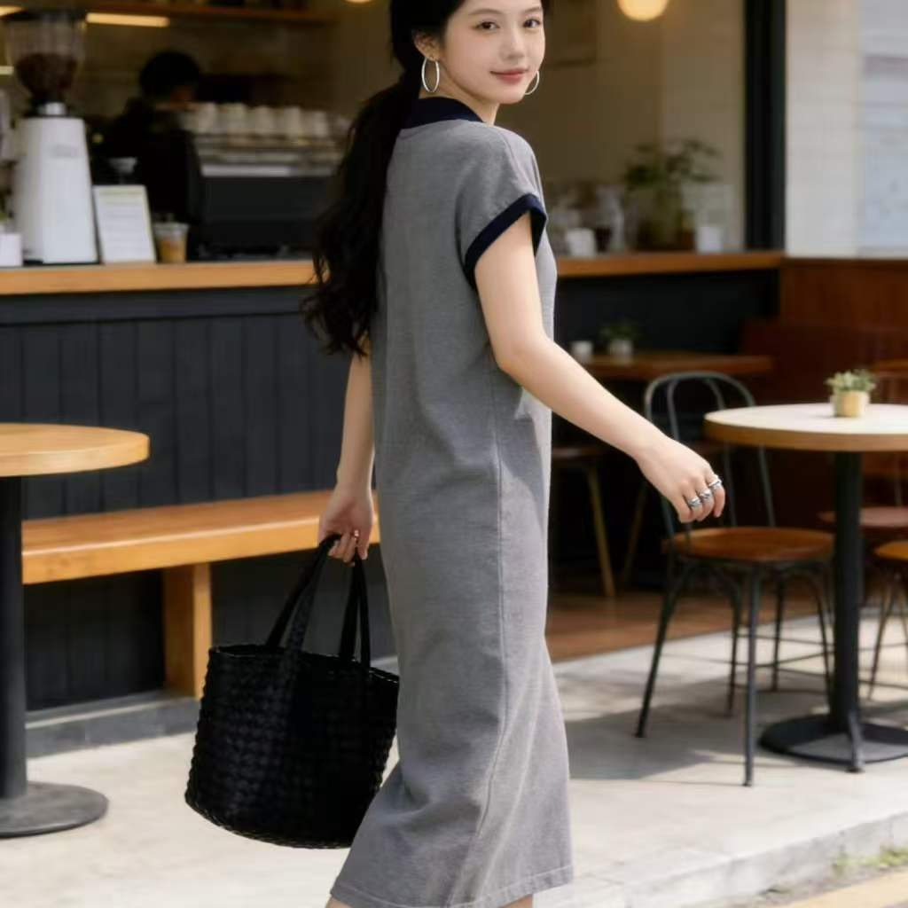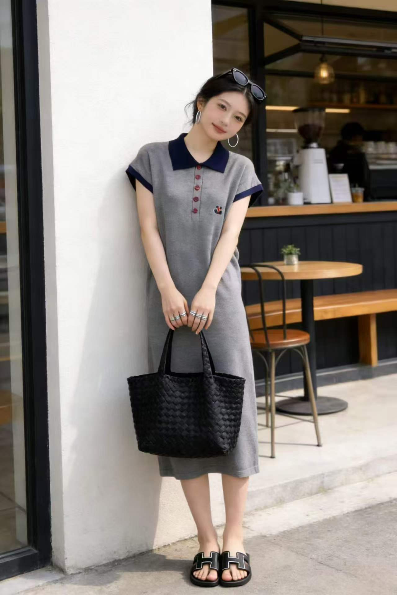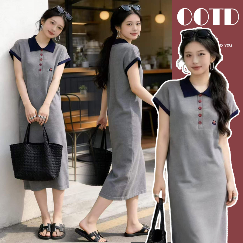 임산부 드레스 POLO 칼라 회색 니트 임산부 롱 스커트
