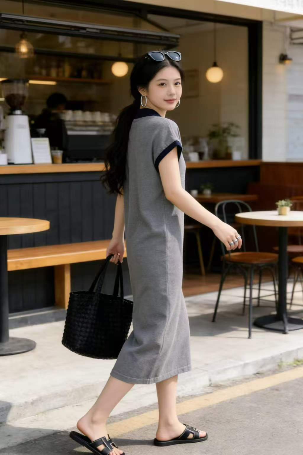 새로운 해군 칼라 출산 착용 2026 여름 새로운 루즈핏 롱 코트 임산부 치마 드레스