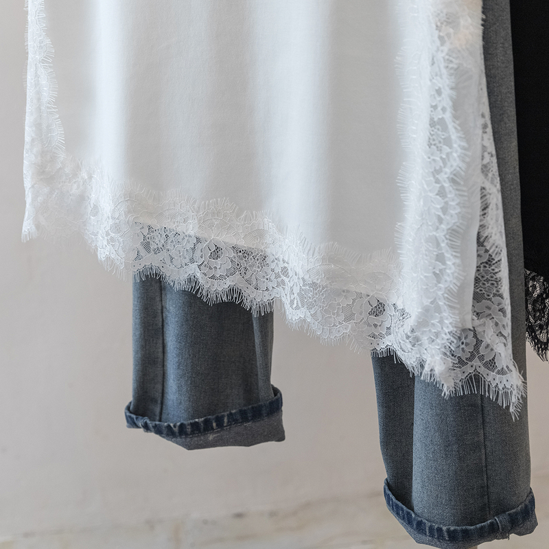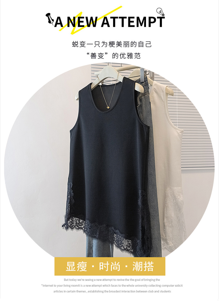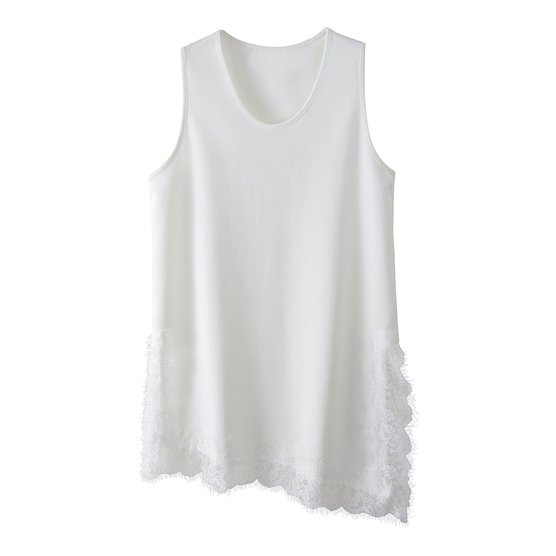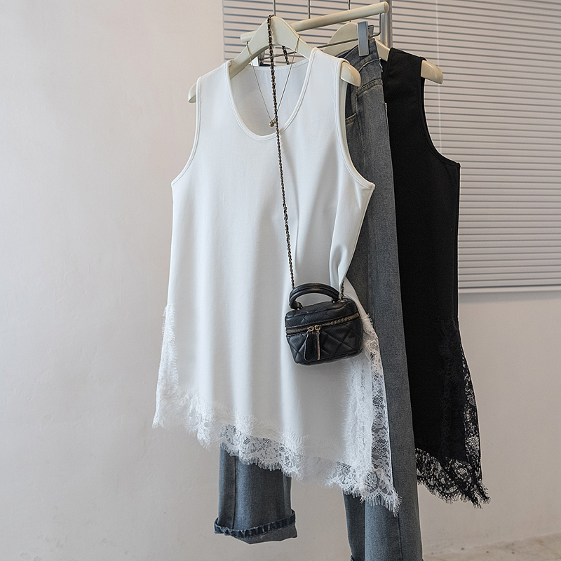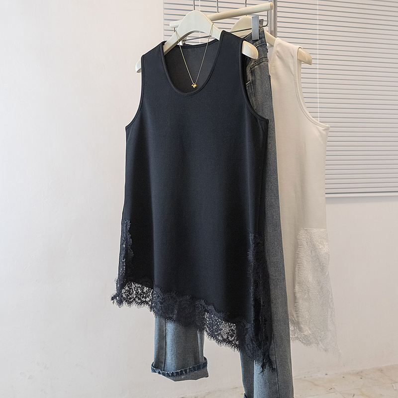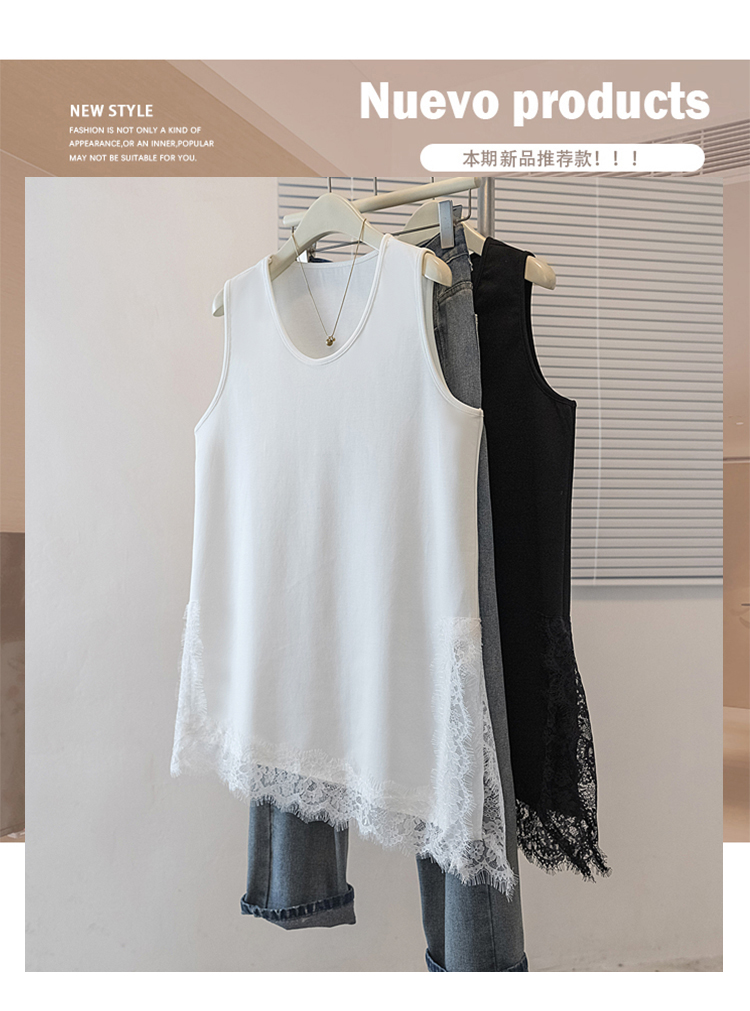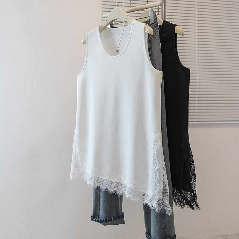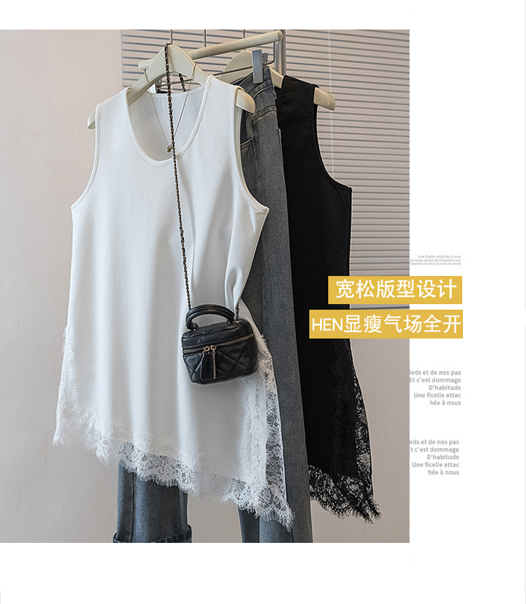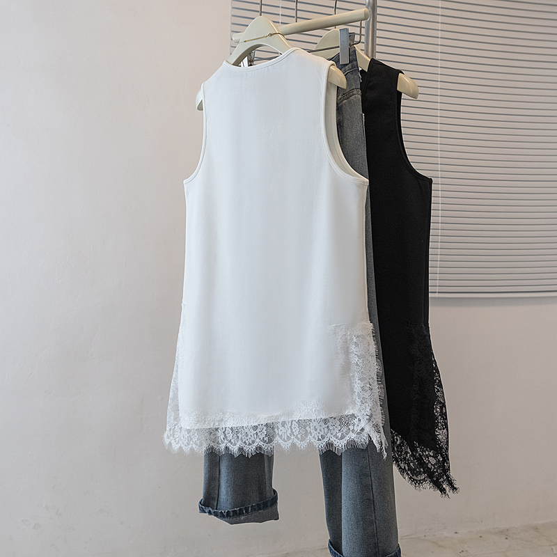실사 여름 새로운 V넥 민소매 맨위 패치워크 레이스 맨위 불규칙 빅 사이즈 여성 의류