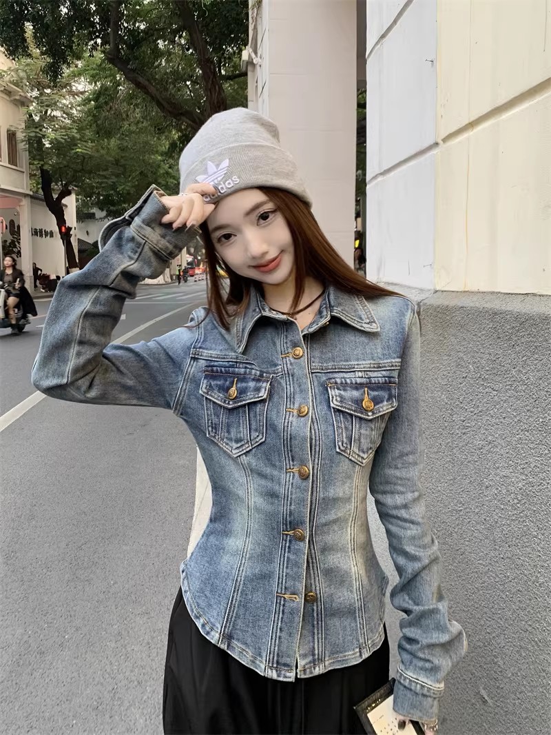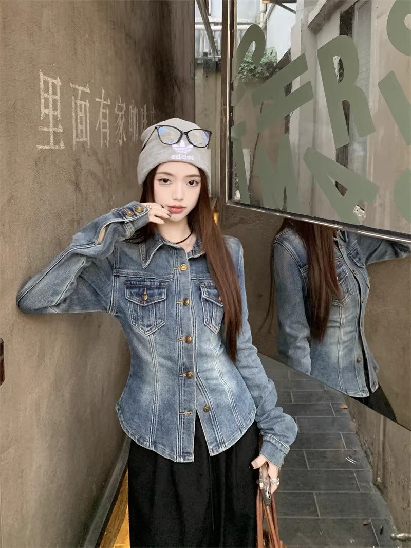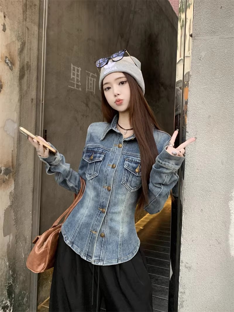 고급 센스 항구 바람 레트로 마 오래된 데님 셔츠 POLO 칼라 허리 수축 슬림해 보이는 조기 봄 한국 스타일 슬림해 보이는 여성 셔츠