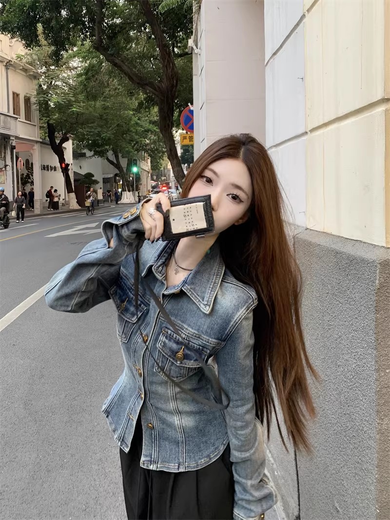 프랑스식 레트로 항구 바람 어깨 패드 디자인 센스 쇼트 스타일 데님 여성 코트 가을 겨울 외국 가스 다용도 슬림해 보이는 재킷 맨위