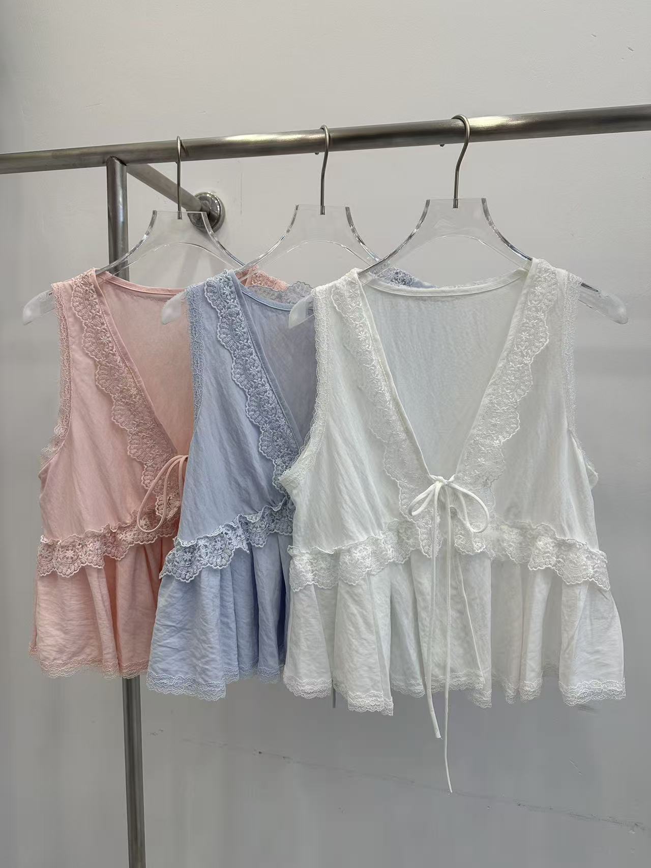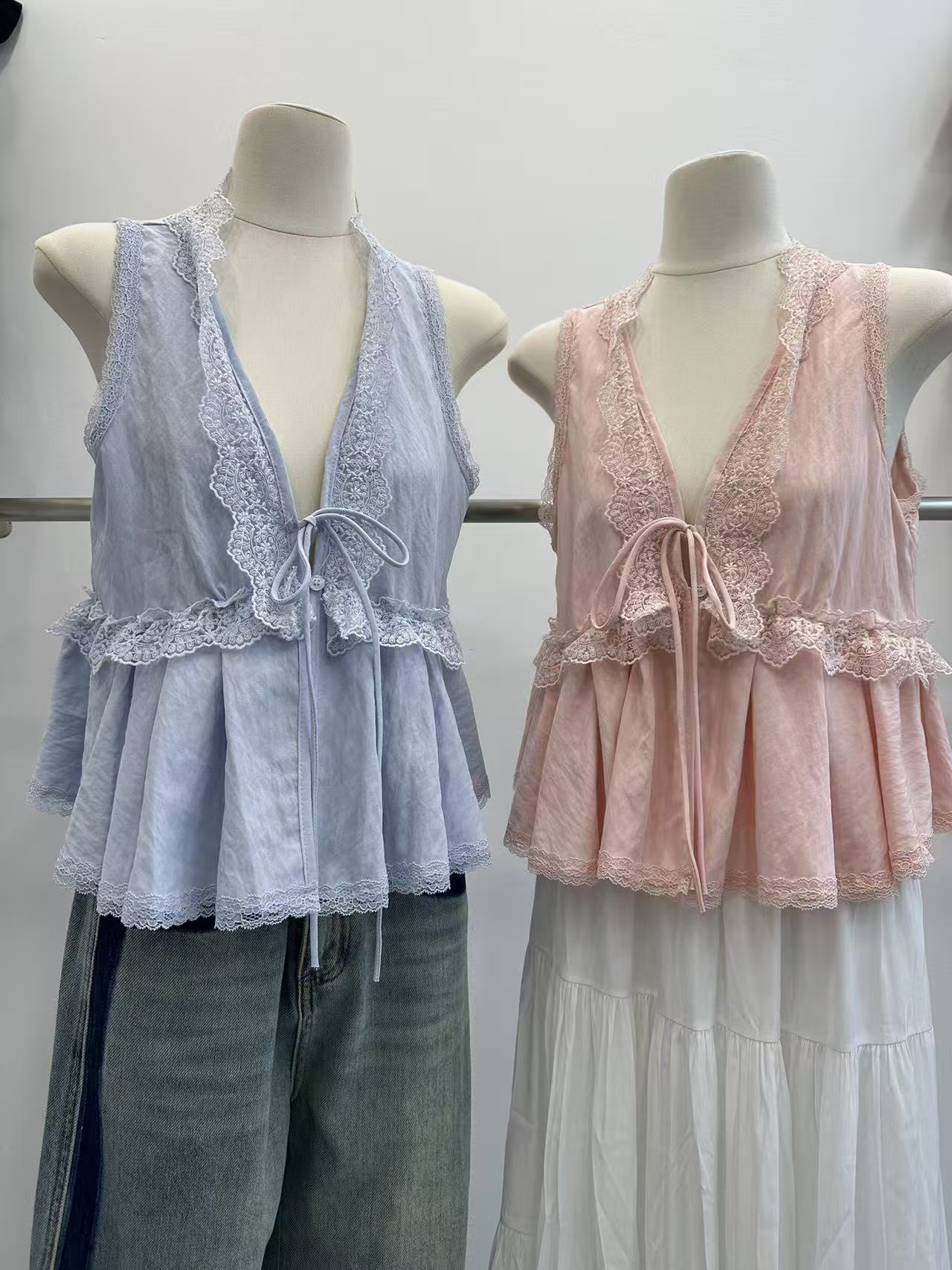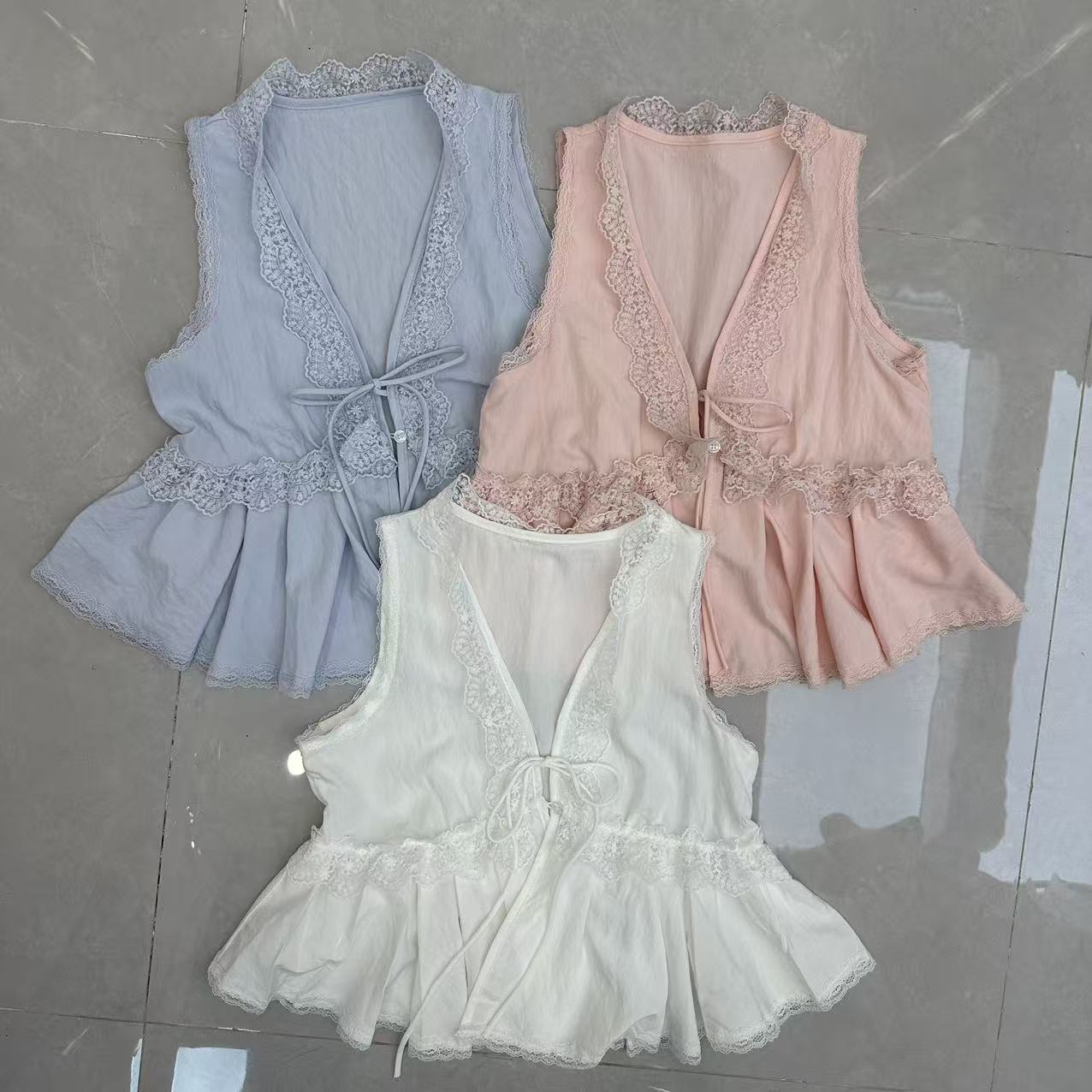 달콤한 스타일 깊은 v 레이스 행침 목 프릴 꽃밭 조끼 여성 스트랩 몸매 가꾸기 슬림해 보이는 맨위