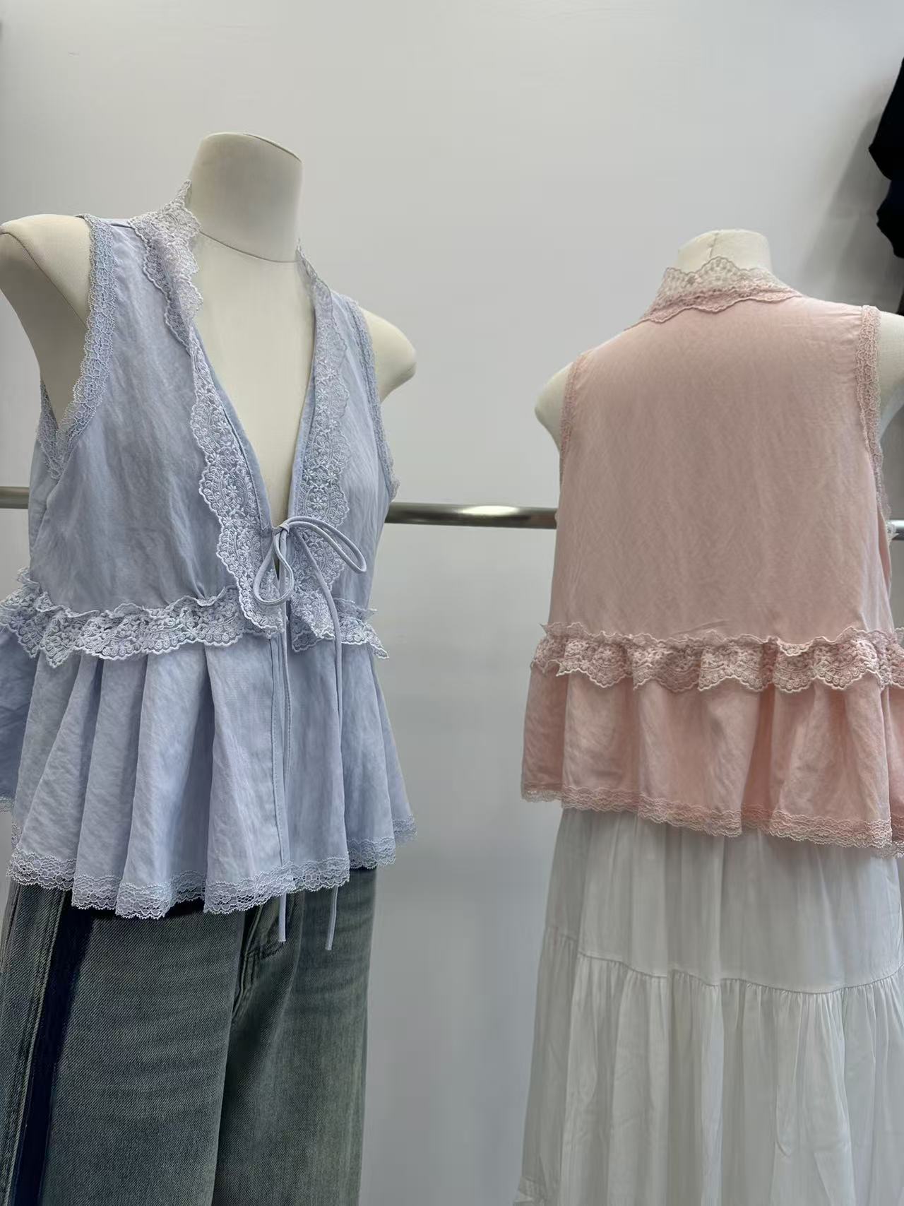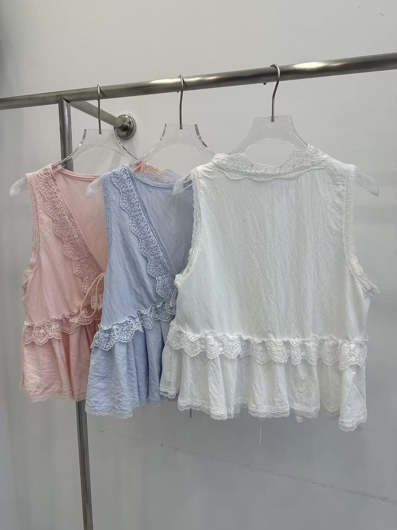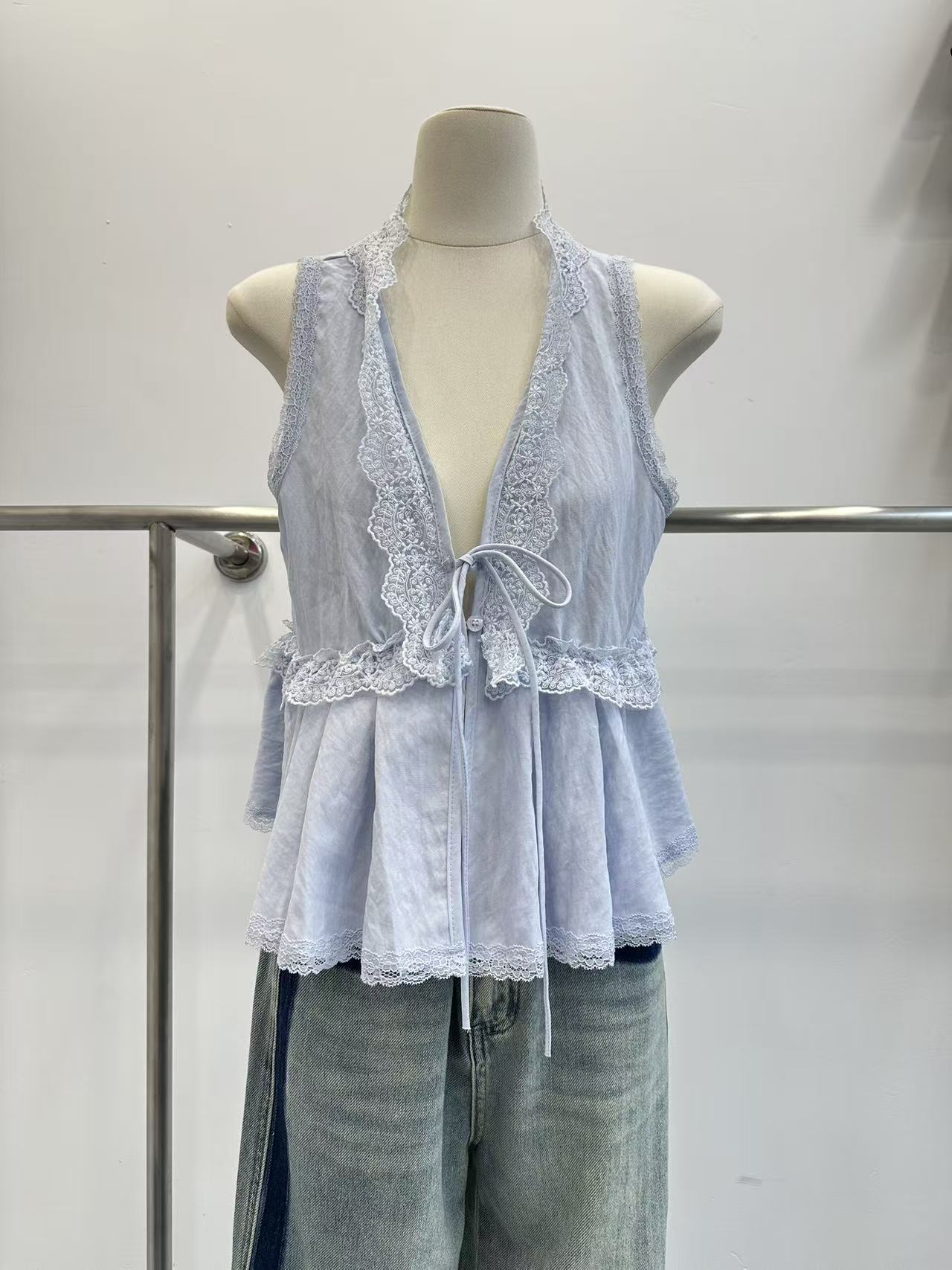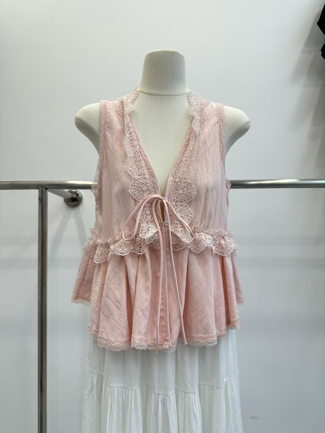 달콤한 스타일 깊은 v 레이스 행침 목 프릴 꽃밭 조끼 여성 스트랩 몸매 가꾸기 슬림해 보이는 맨위