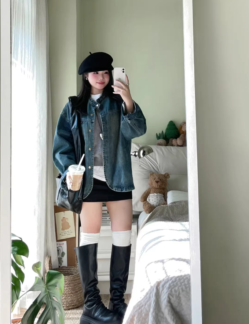 아메리칸 레트로 배색 폴로 칼라 데님 여성 코트 가을 새로운 루즈핏 다용도 캐주얼 고급 센스 재킷 맨위