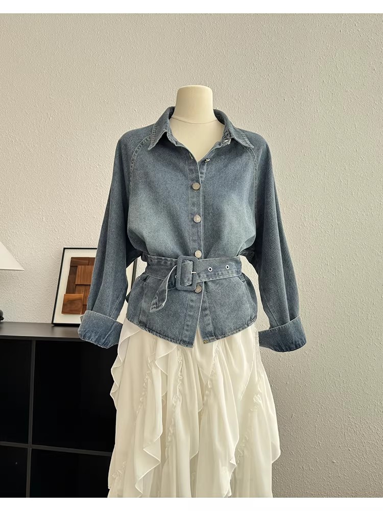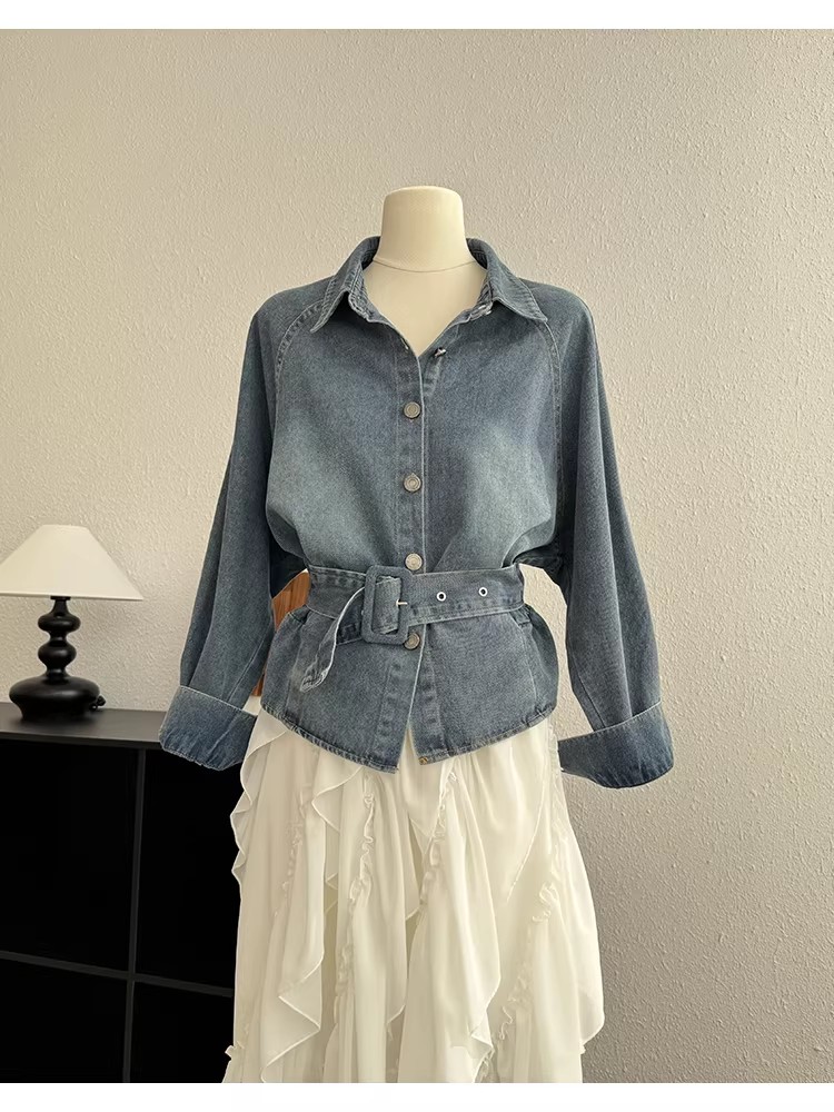 레트로 데님 여성 셔츠 허리 수축 맨위 여성 2026 이른 봄 디자인 센스 벨트 슬림해 보이는 외국 가스 캐주얼 재킷