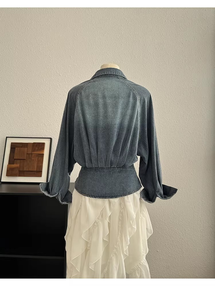 고급 센스 항구 바람 레트로 마 오래된 데님 셔츠 POLO 칼라 허리 수축 슬림해 보이는 조기 봄 한국 스타일 슬림해 보이는 여성 셔츠