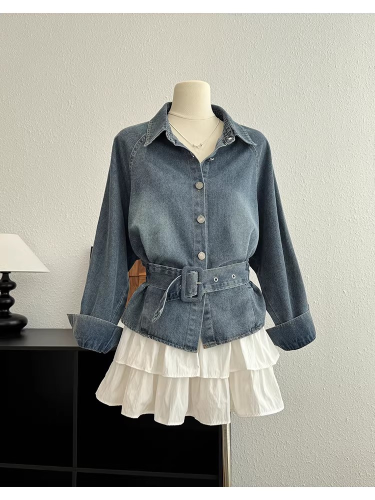항구 바람 프랑스식 분위기 센스 세트 허리 수축 데님 셔츠 재킷 롱 스커트 망사 케이크 드레스 전체 집합 이른 봄