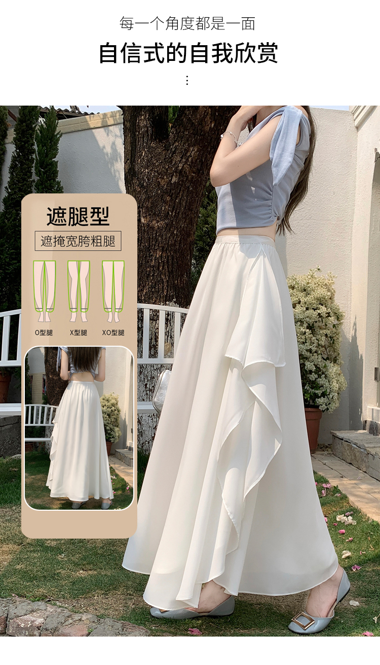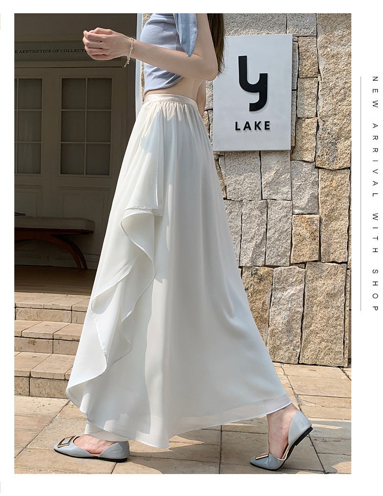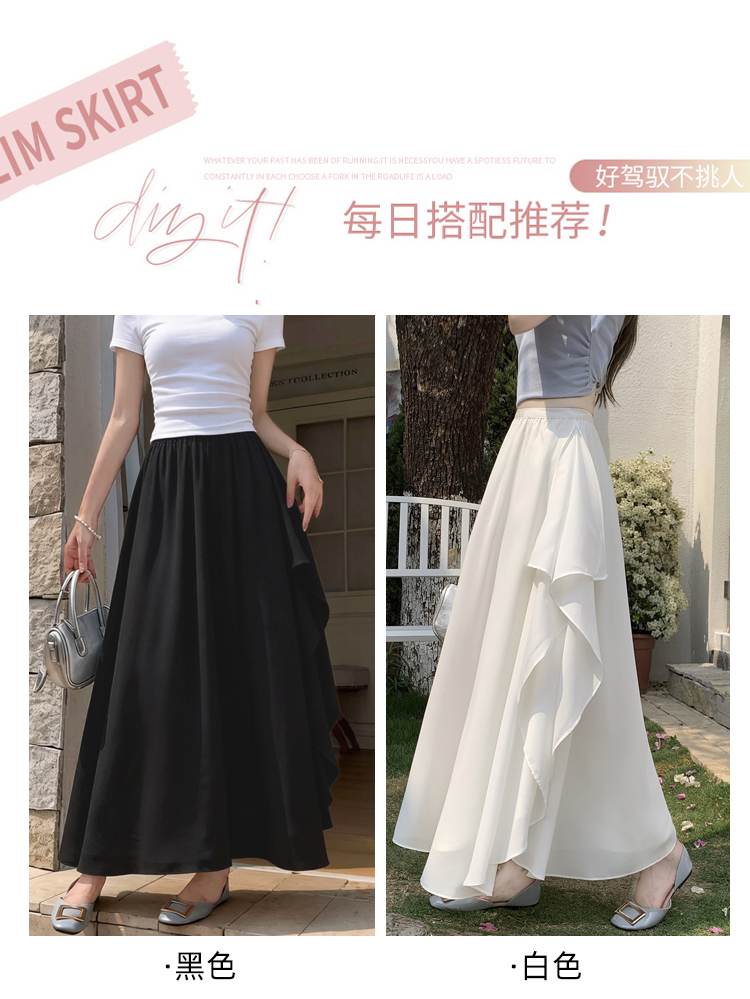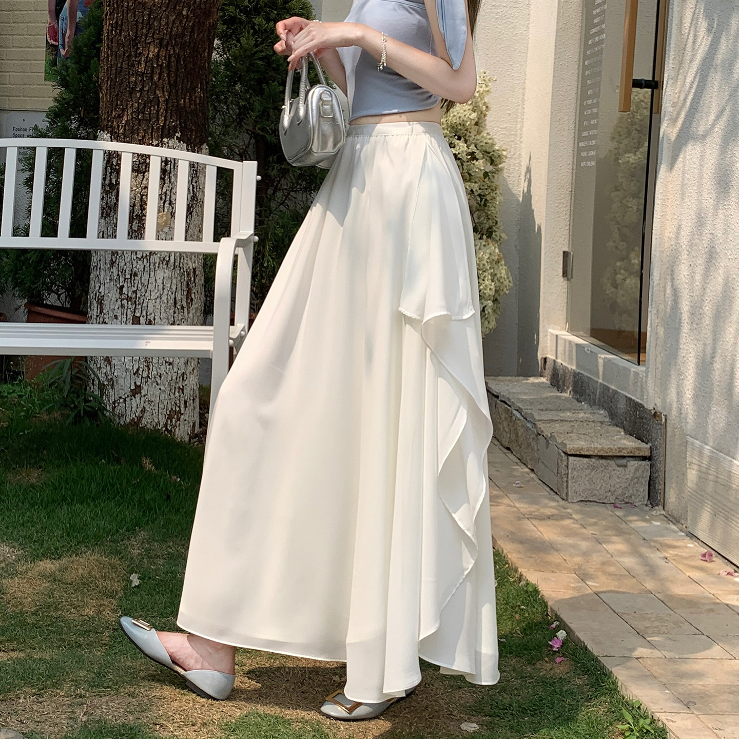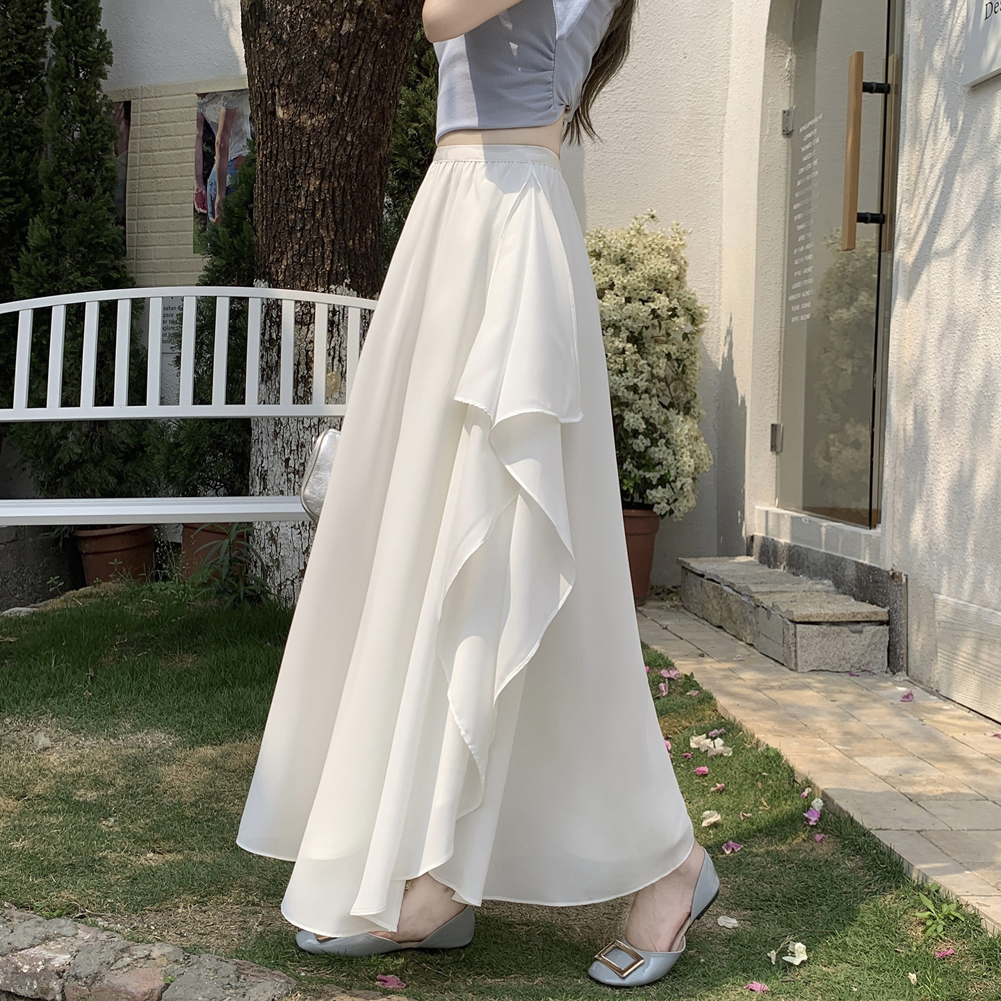 디자인 센스 화이트 롱 스커트 허리밴드 도루 가을 쉬폰 반신 스커트 프릴 측면 단색 불규칙 롱 스커트