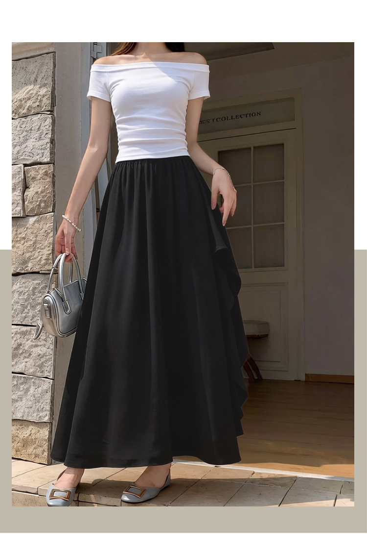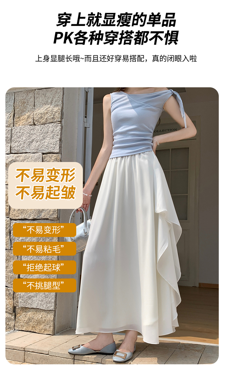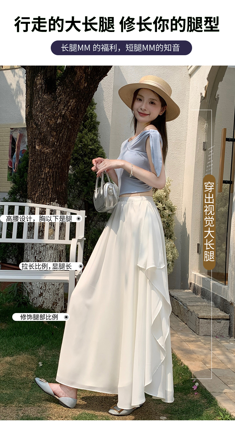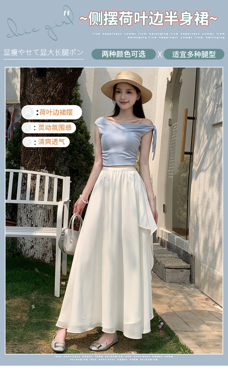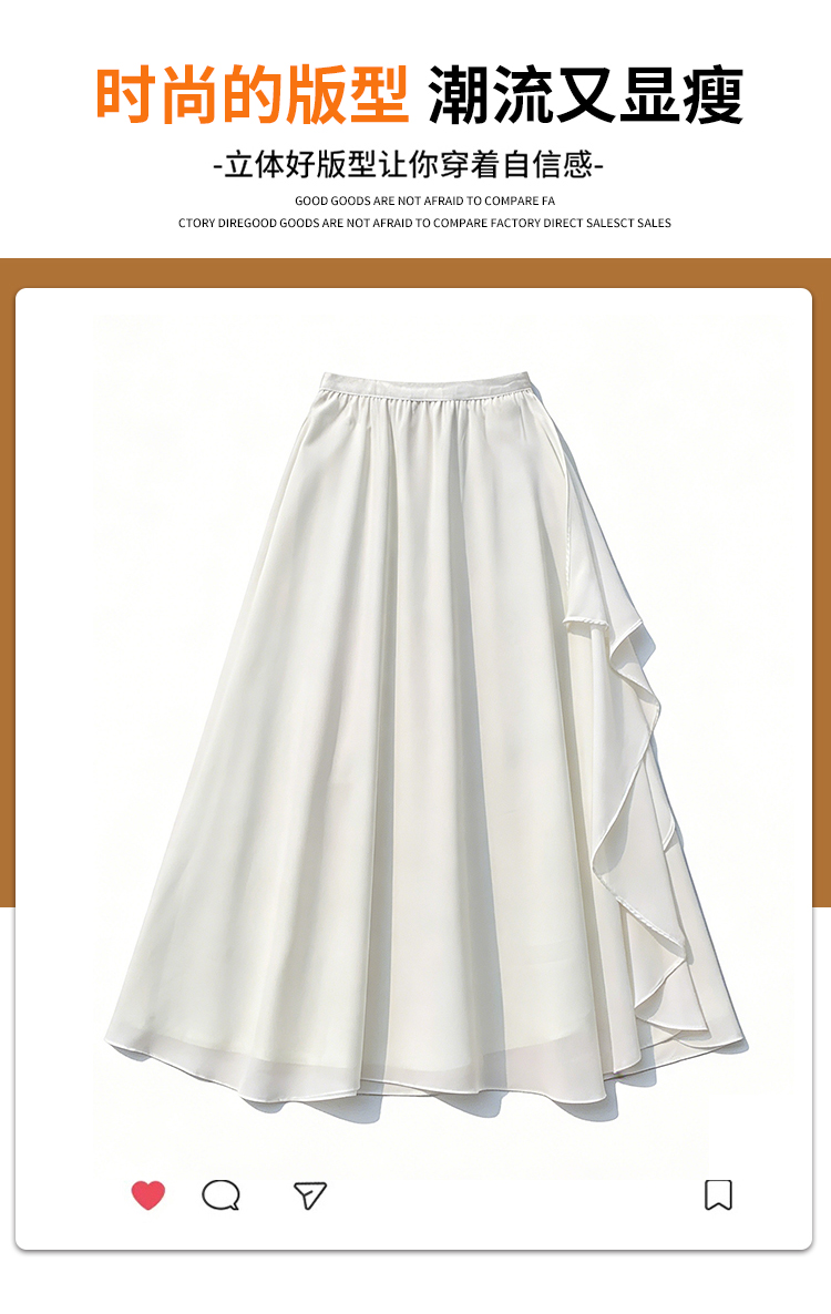 디자인 센스 화이트 롱 스커트 허리밴드 도루 가을 쉬폰 반신 스커트 프릴 측면 단색 불규칙 롱 스커트