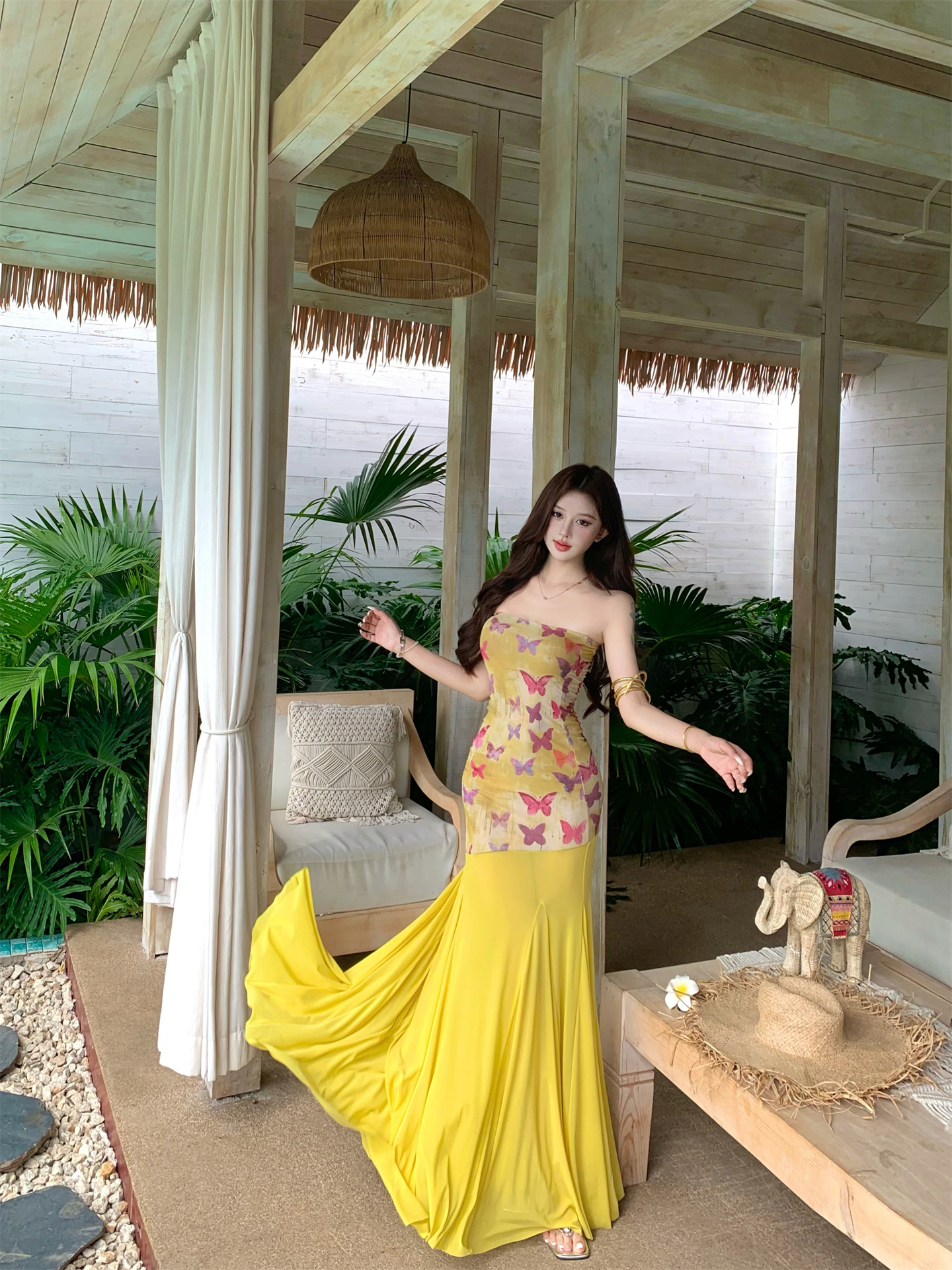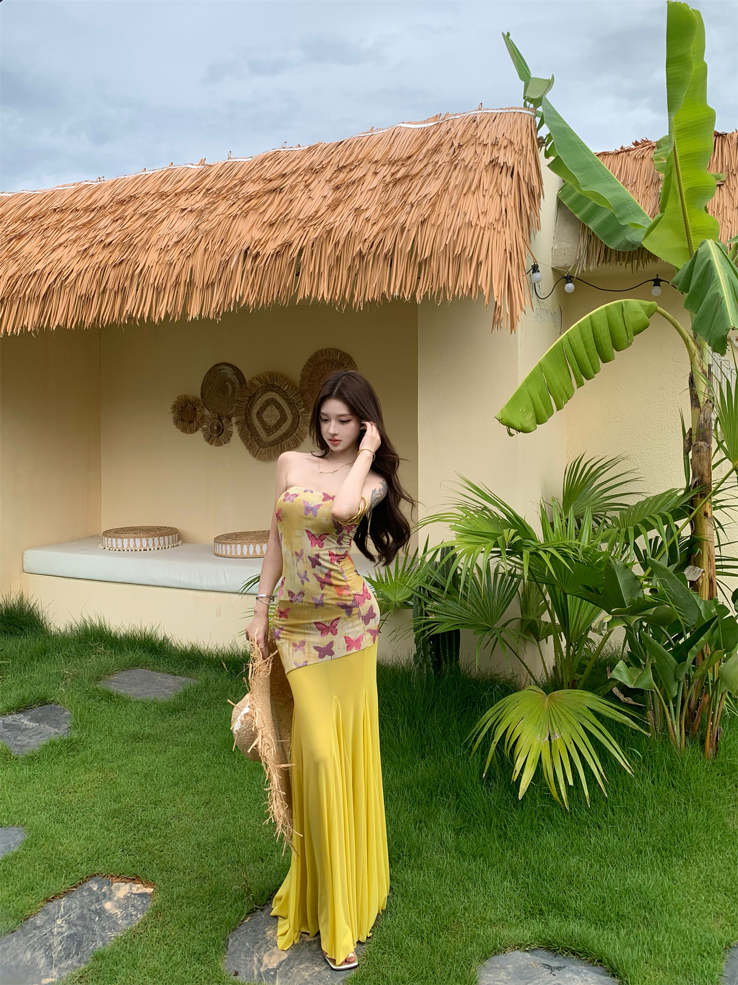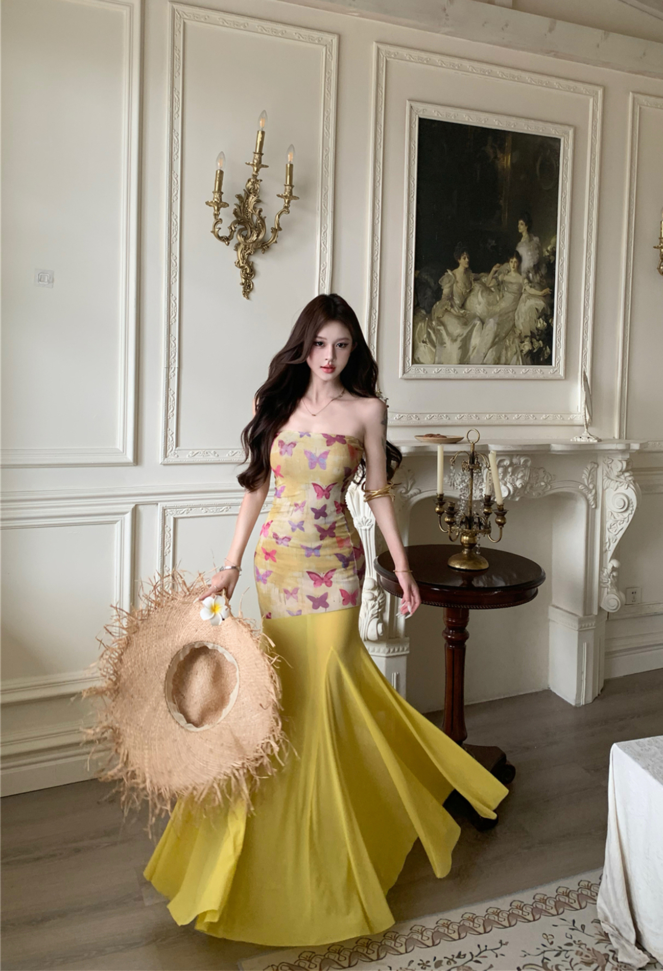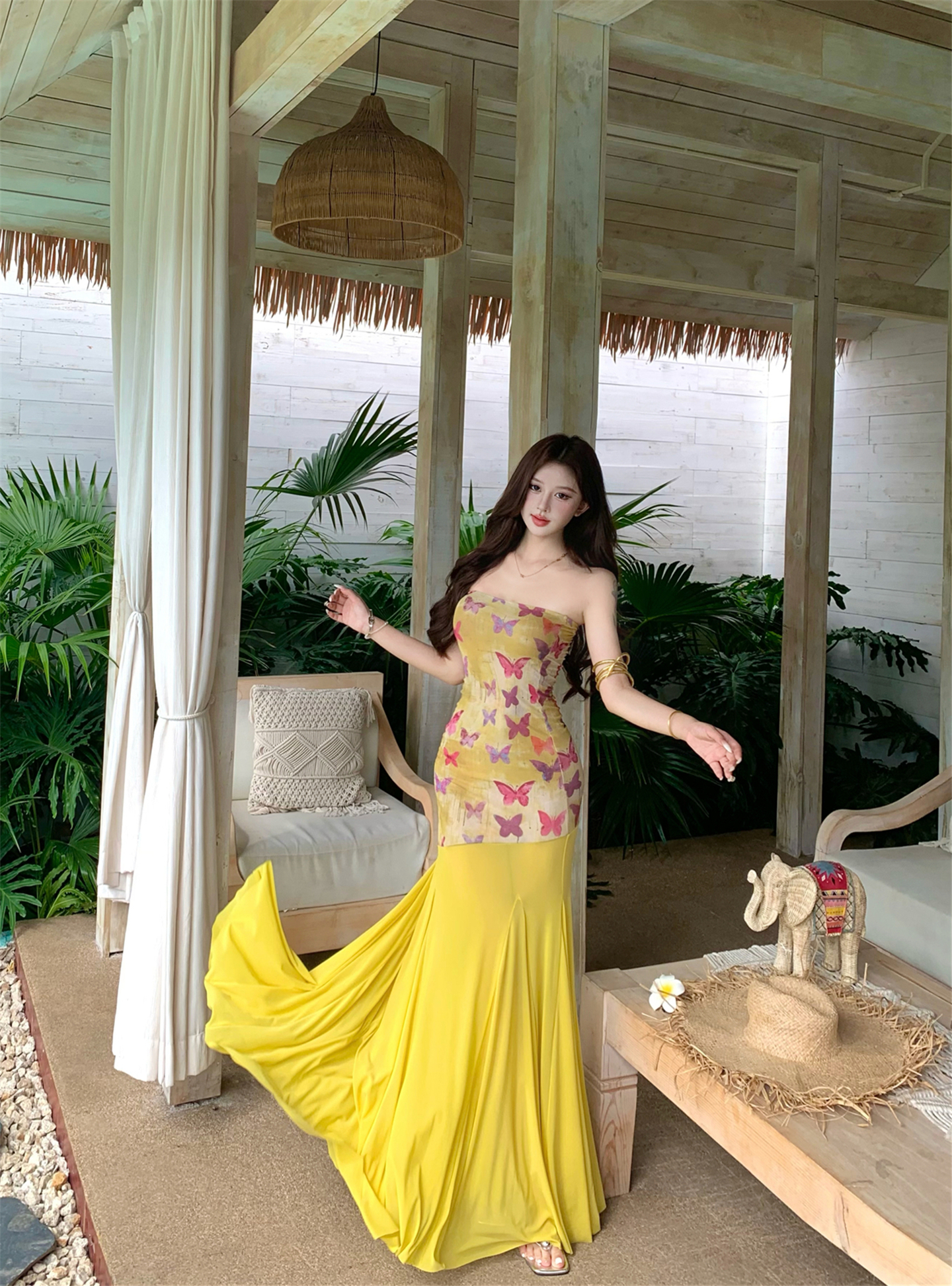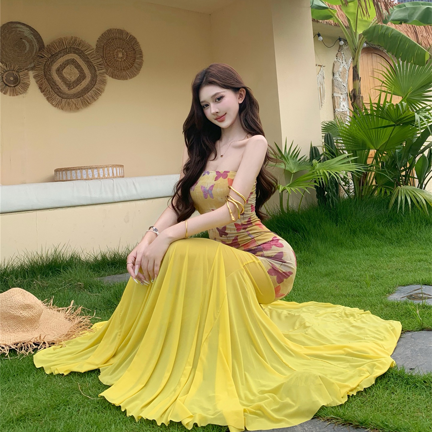 실사 비밀 나비 요정 나비 패치워크 튜브탑 여성 드레스 여름 허리 수축 타이트 스커트 오프숄더 롱 스커트