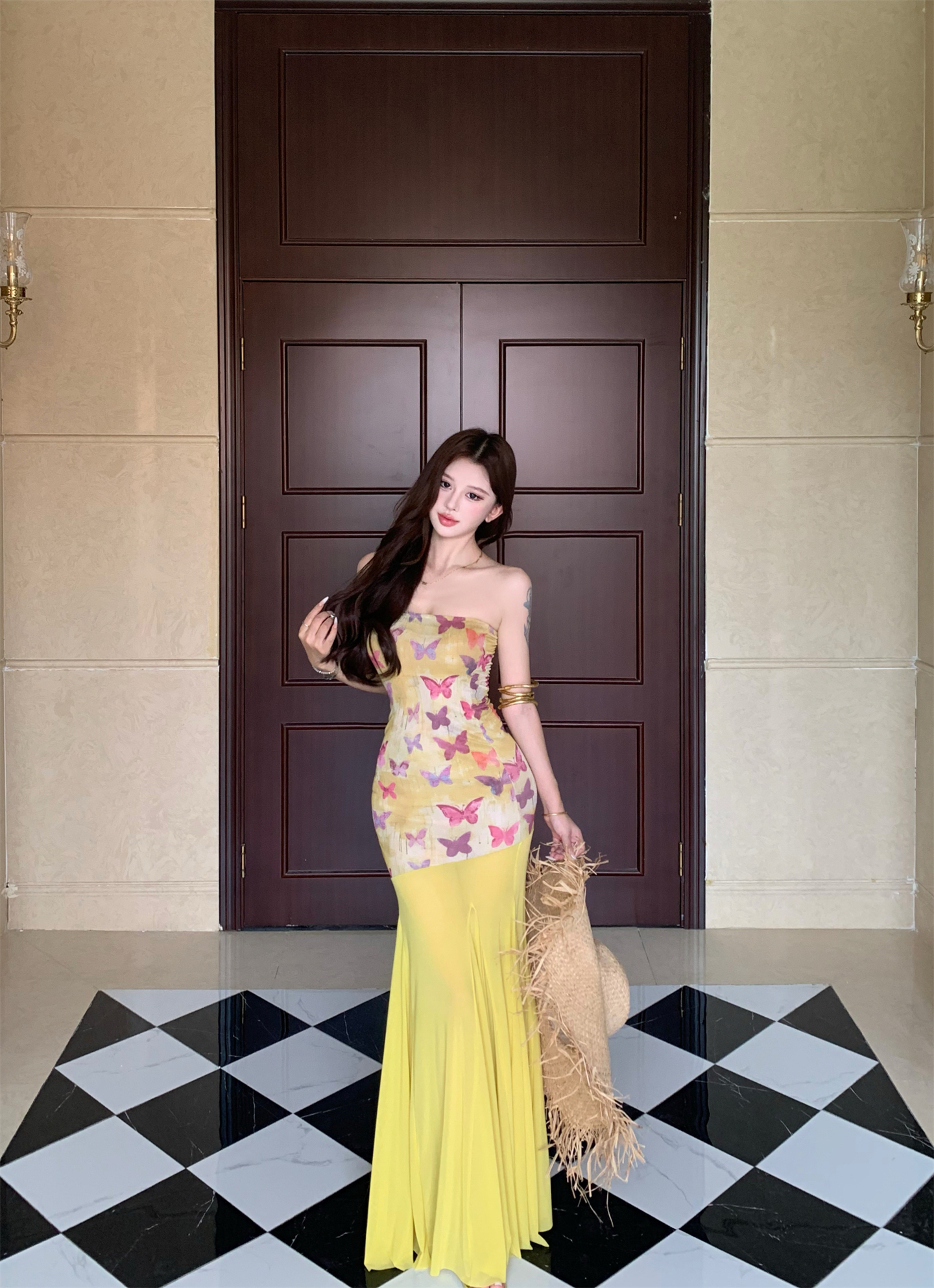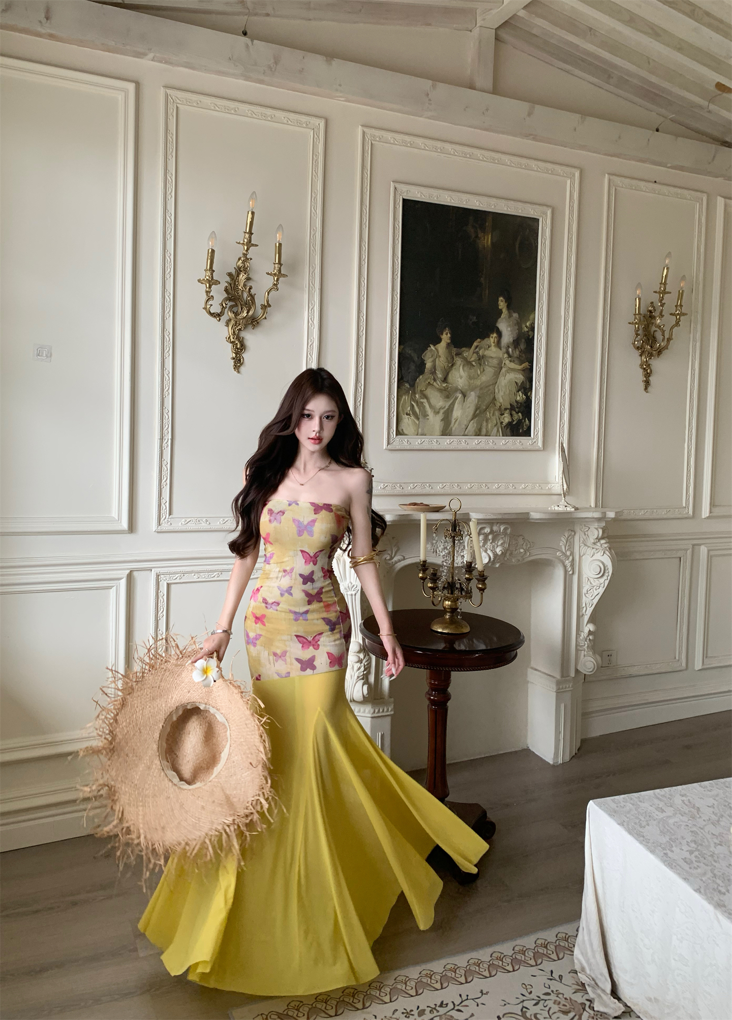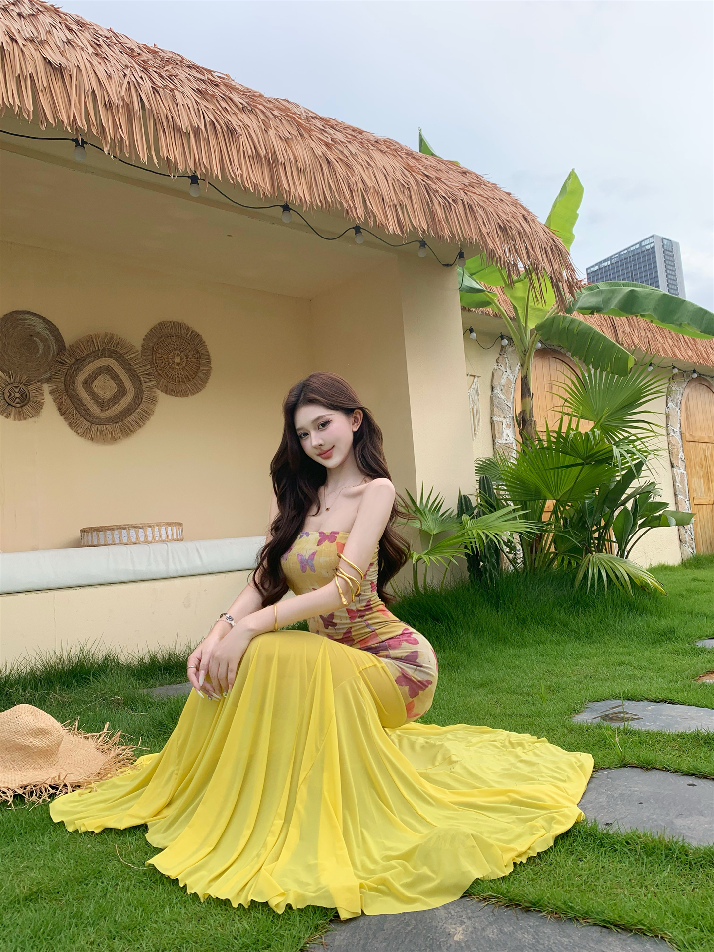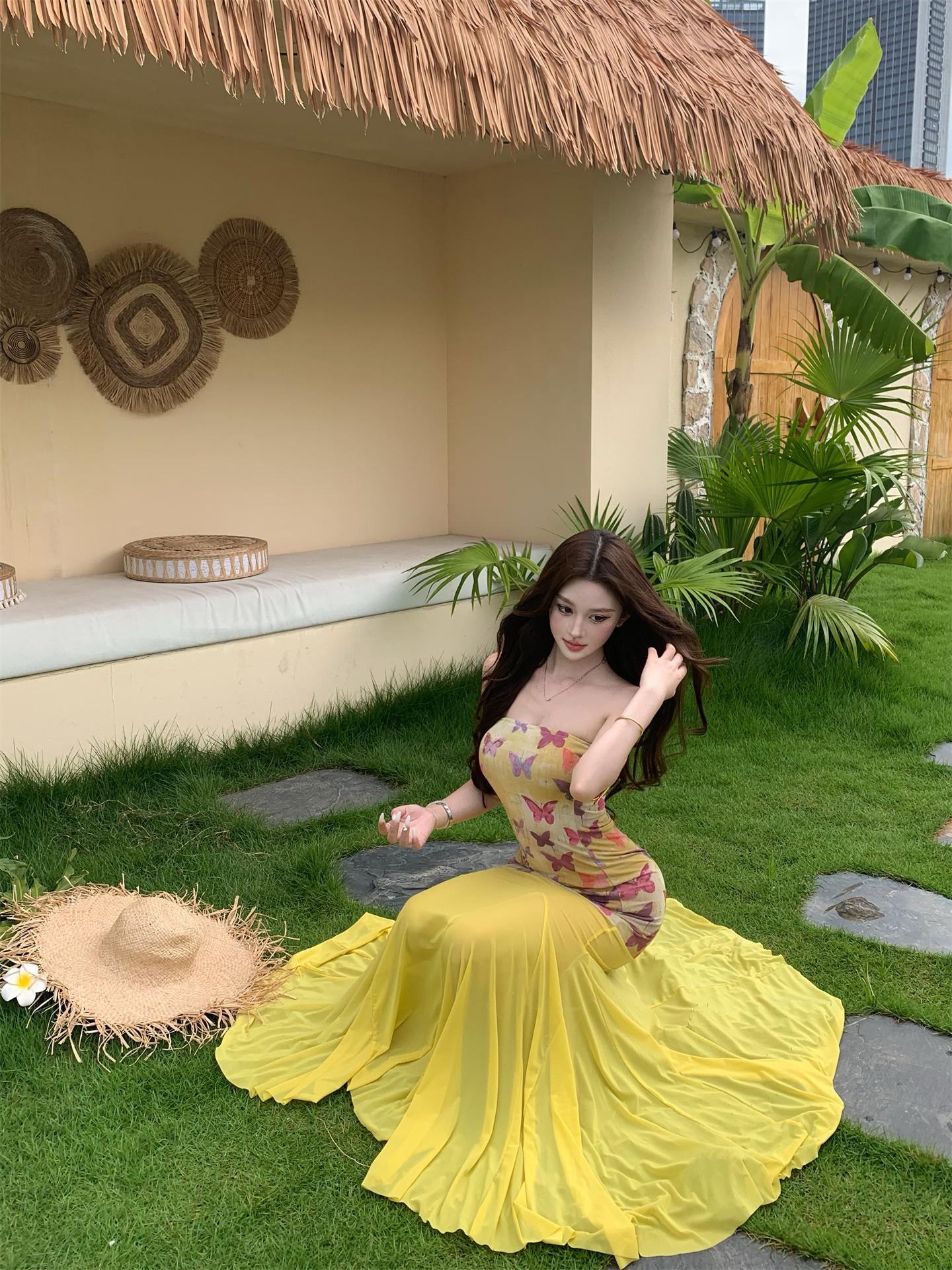 실사 비밀 나비 요정 나비 패치워크 튜브탑 여성 드레스 여름 허리 수축 타이트 스커트 오프숄더 롱 스커트