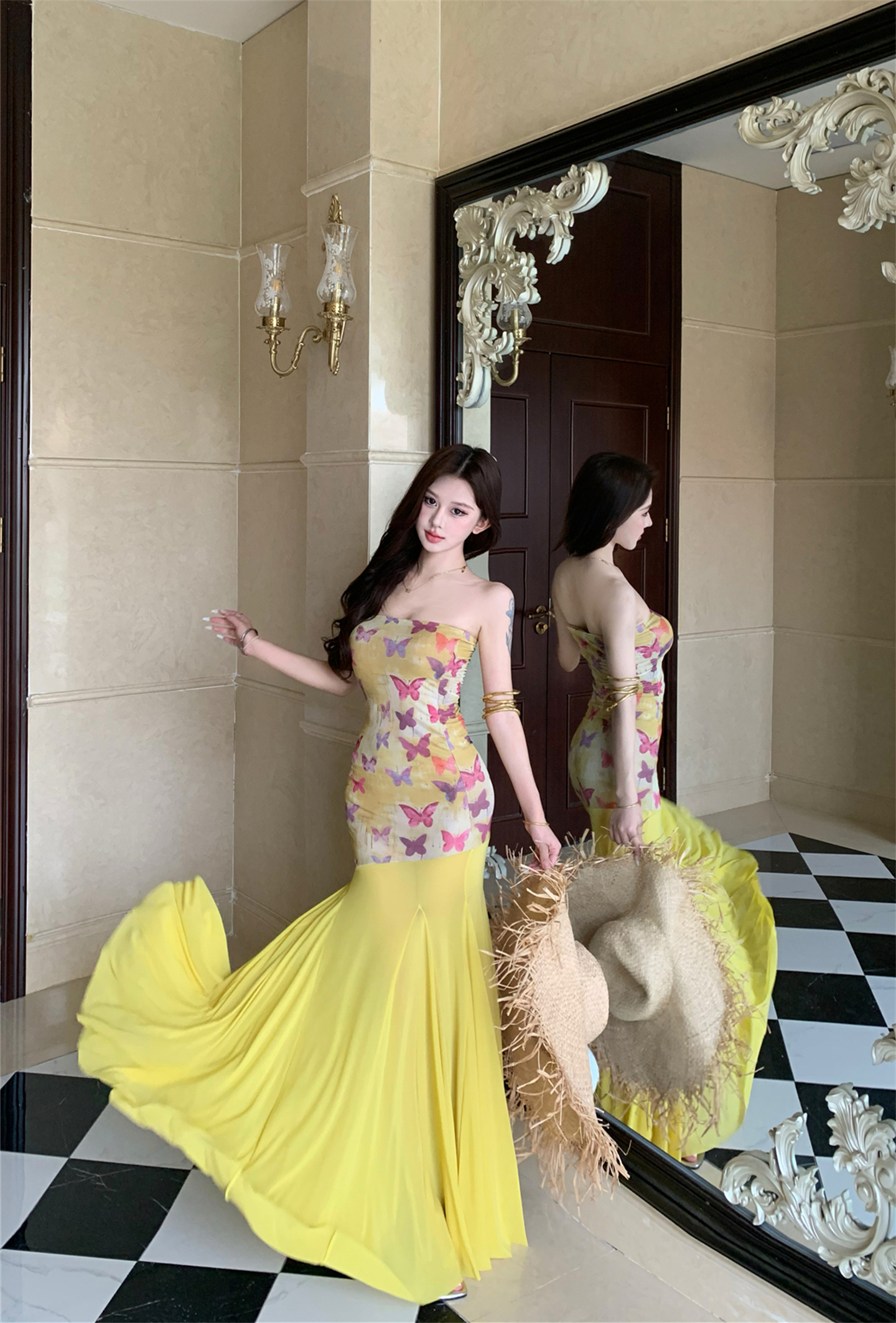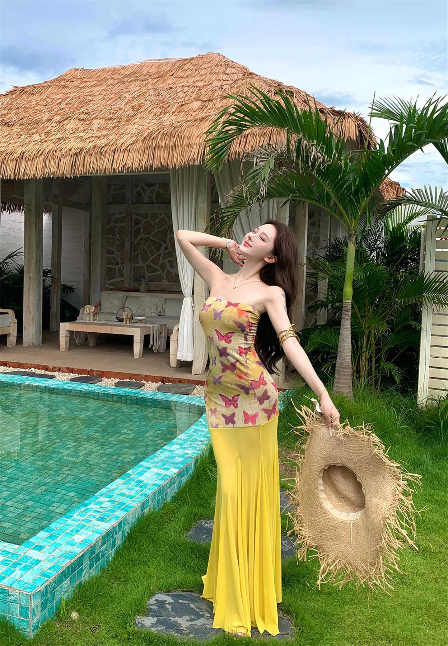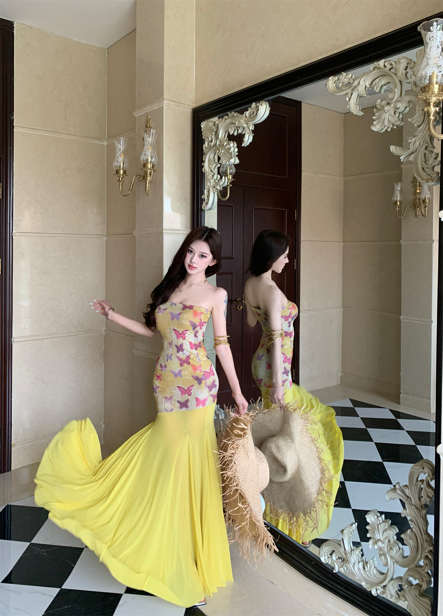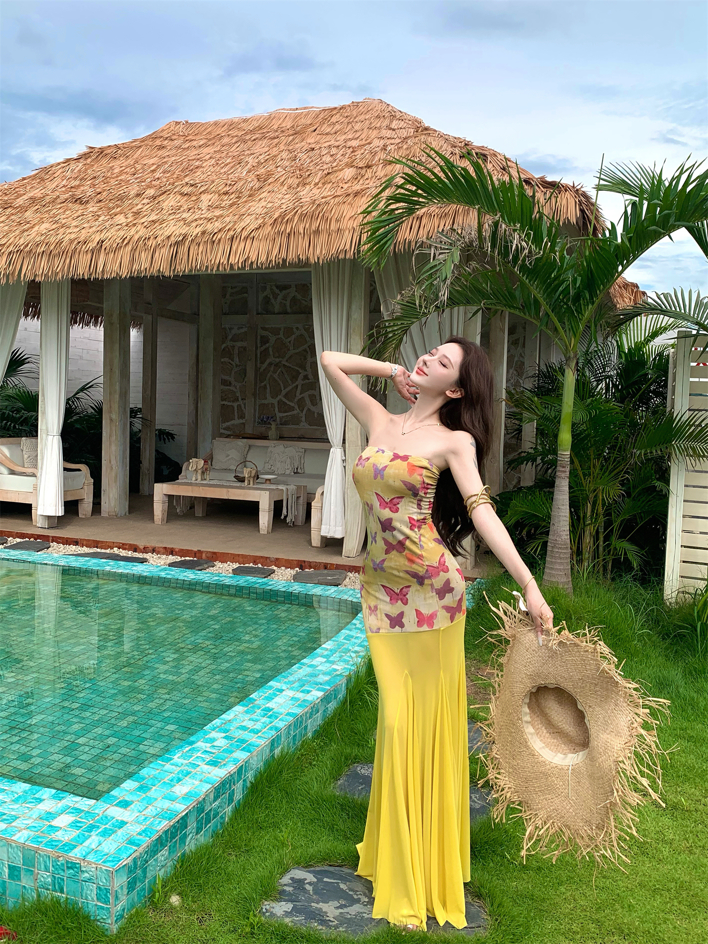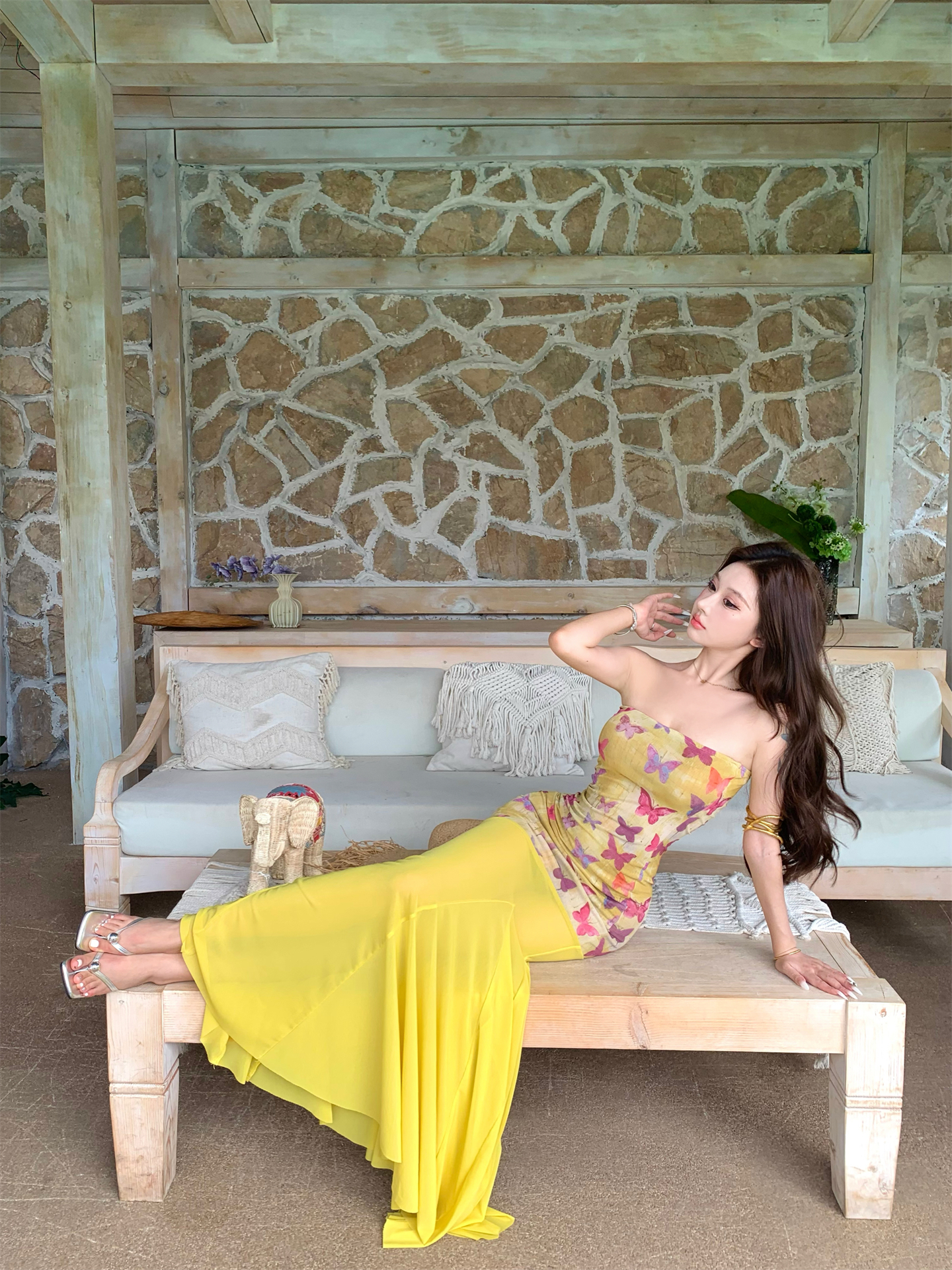 실사 비밀 나비 요정 나비 패치워크 튜브탑 여성 드레스 여름 허리 수축 타이트 스커트 오프숄더 롱 스커트