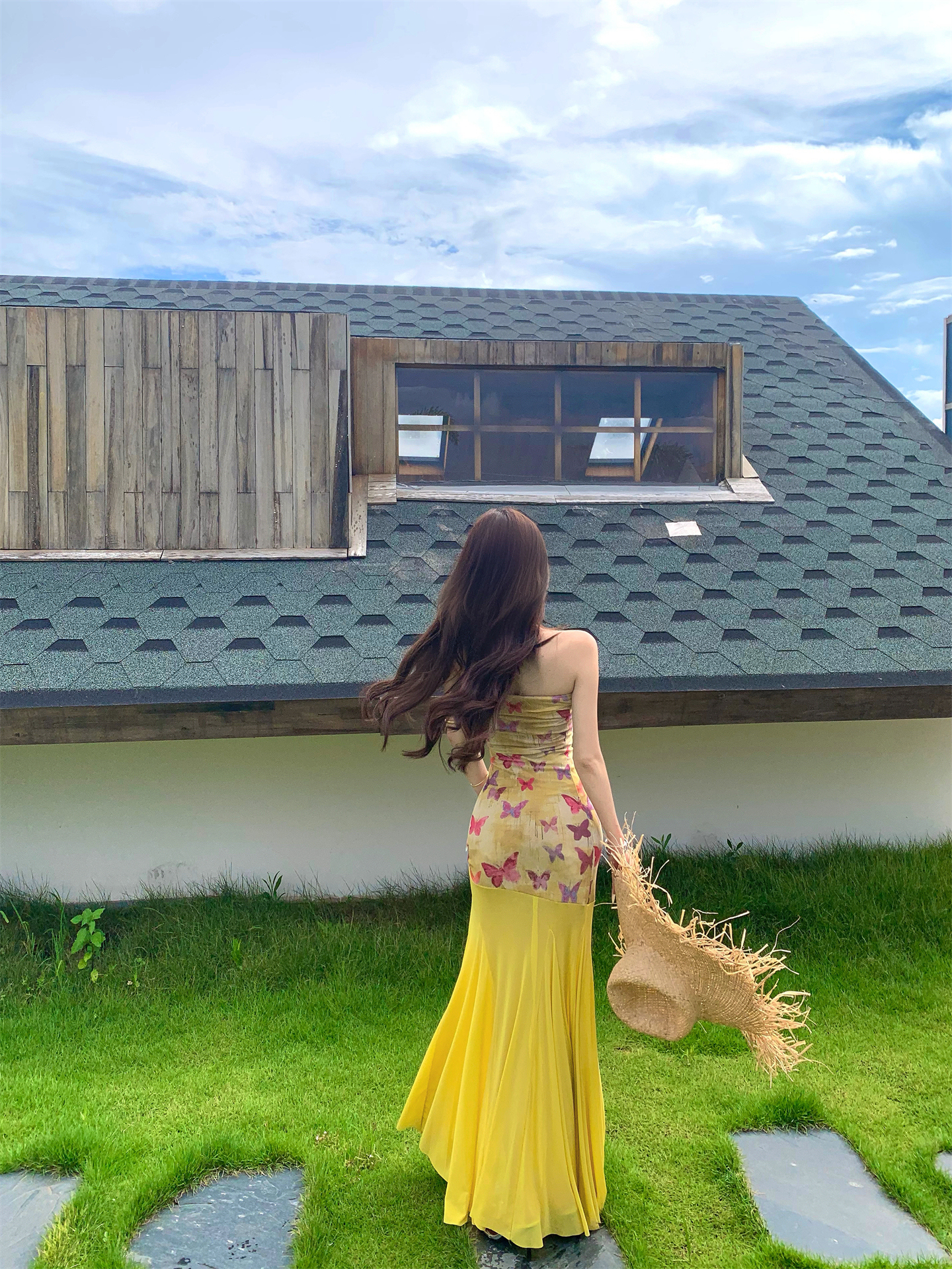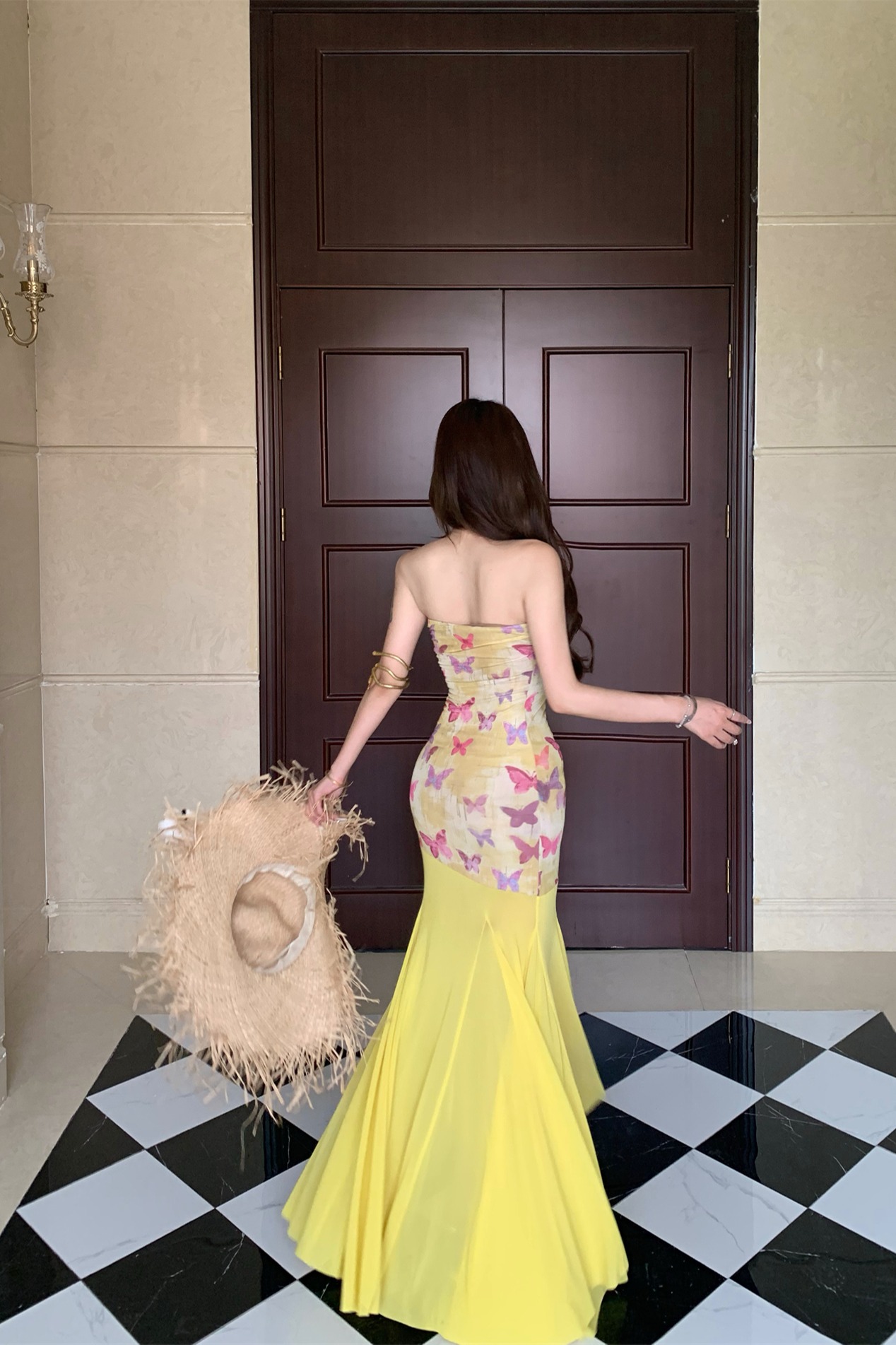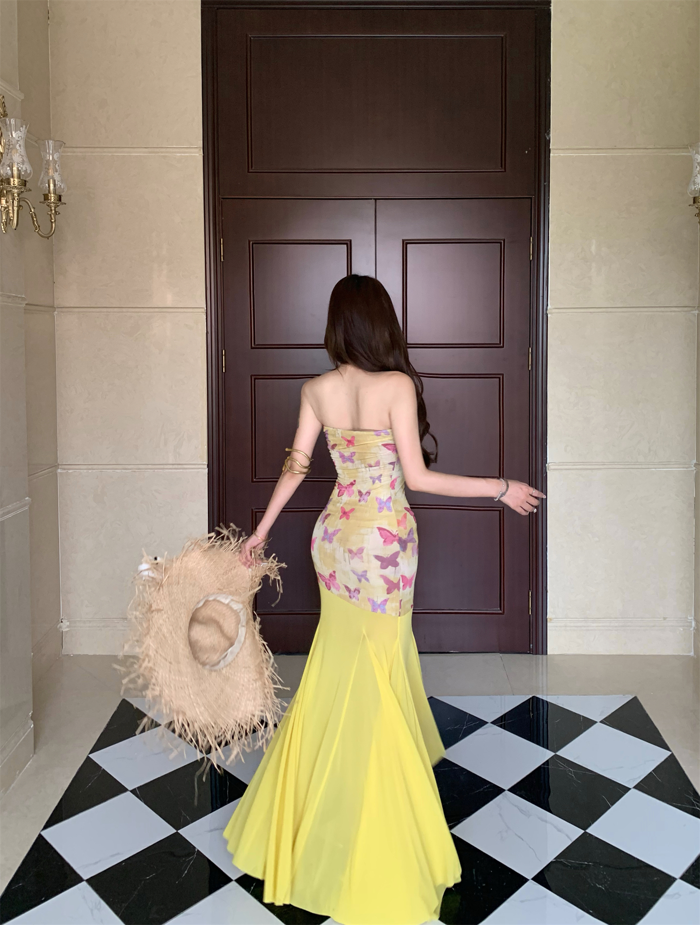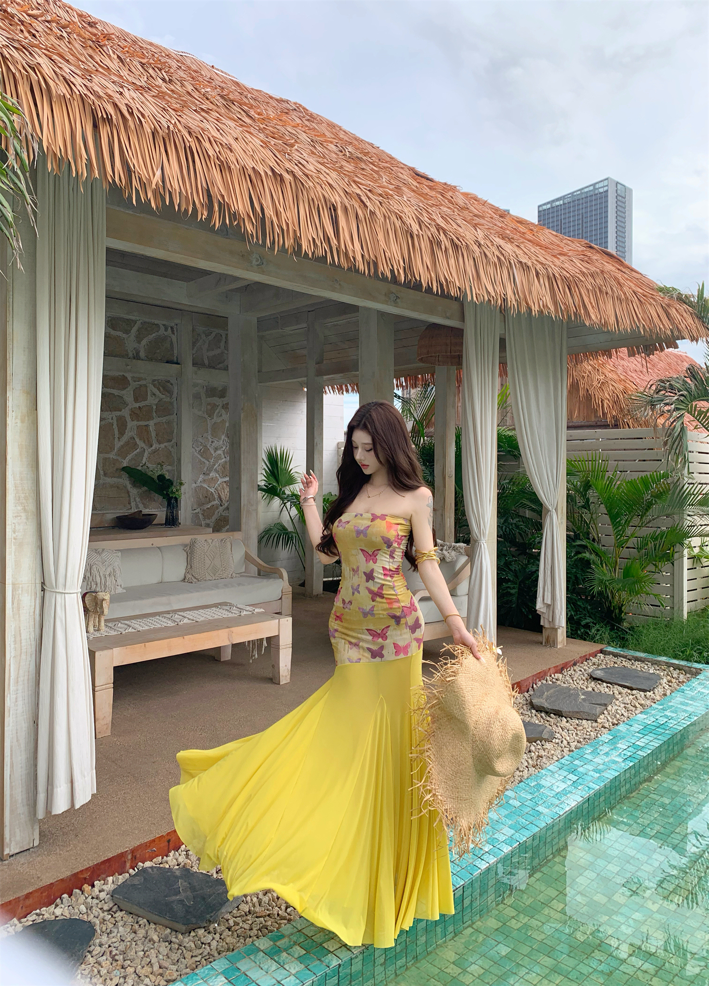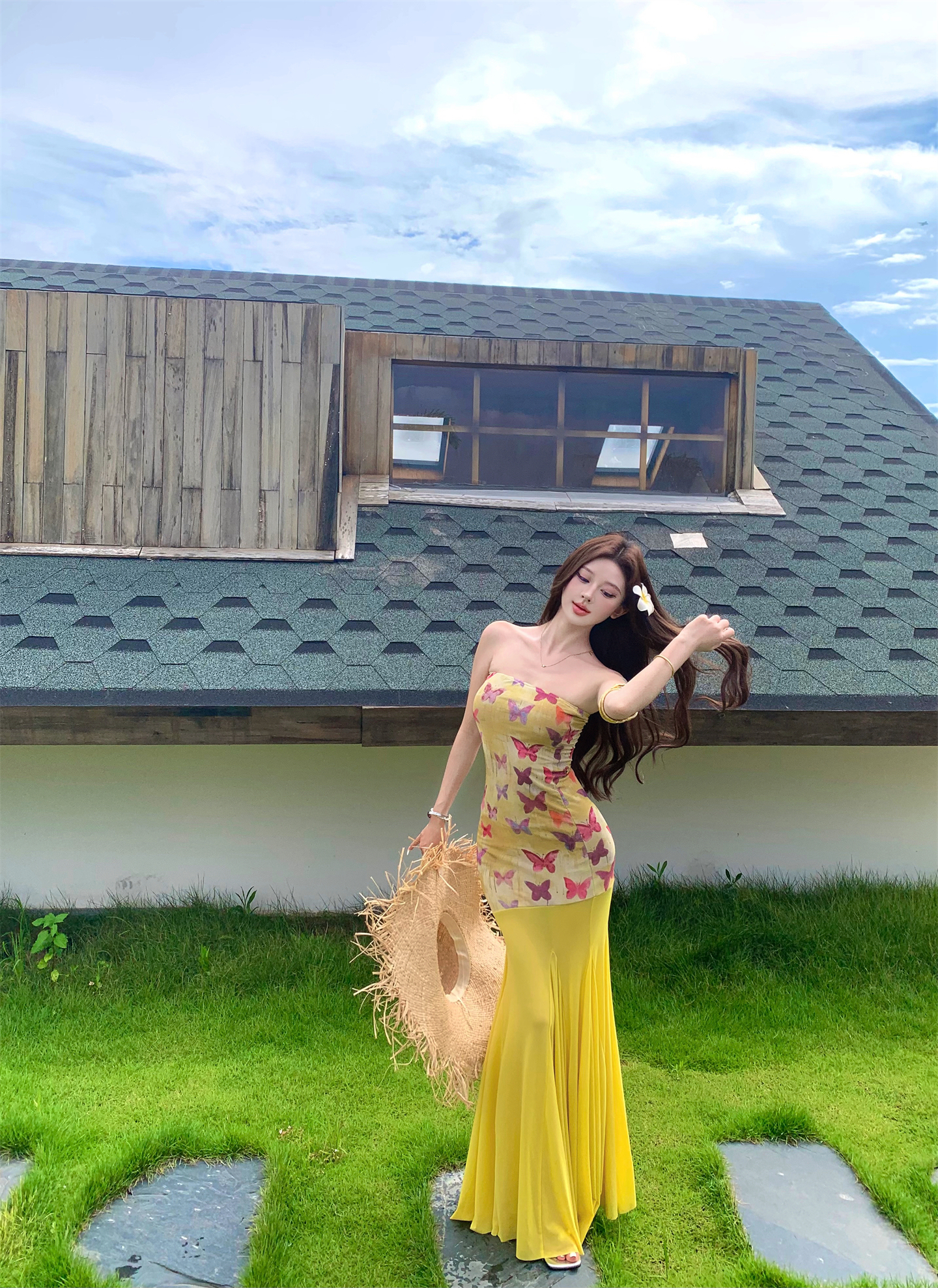 실사 비밀 나비 요정 나비 패치워크 튜브탑 여성 드레스 여름 허리 수축 타이트 스커트 오프숄더 롱 스커트