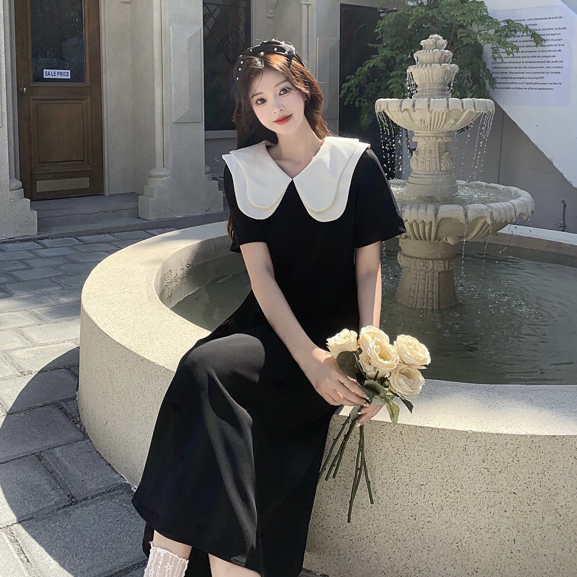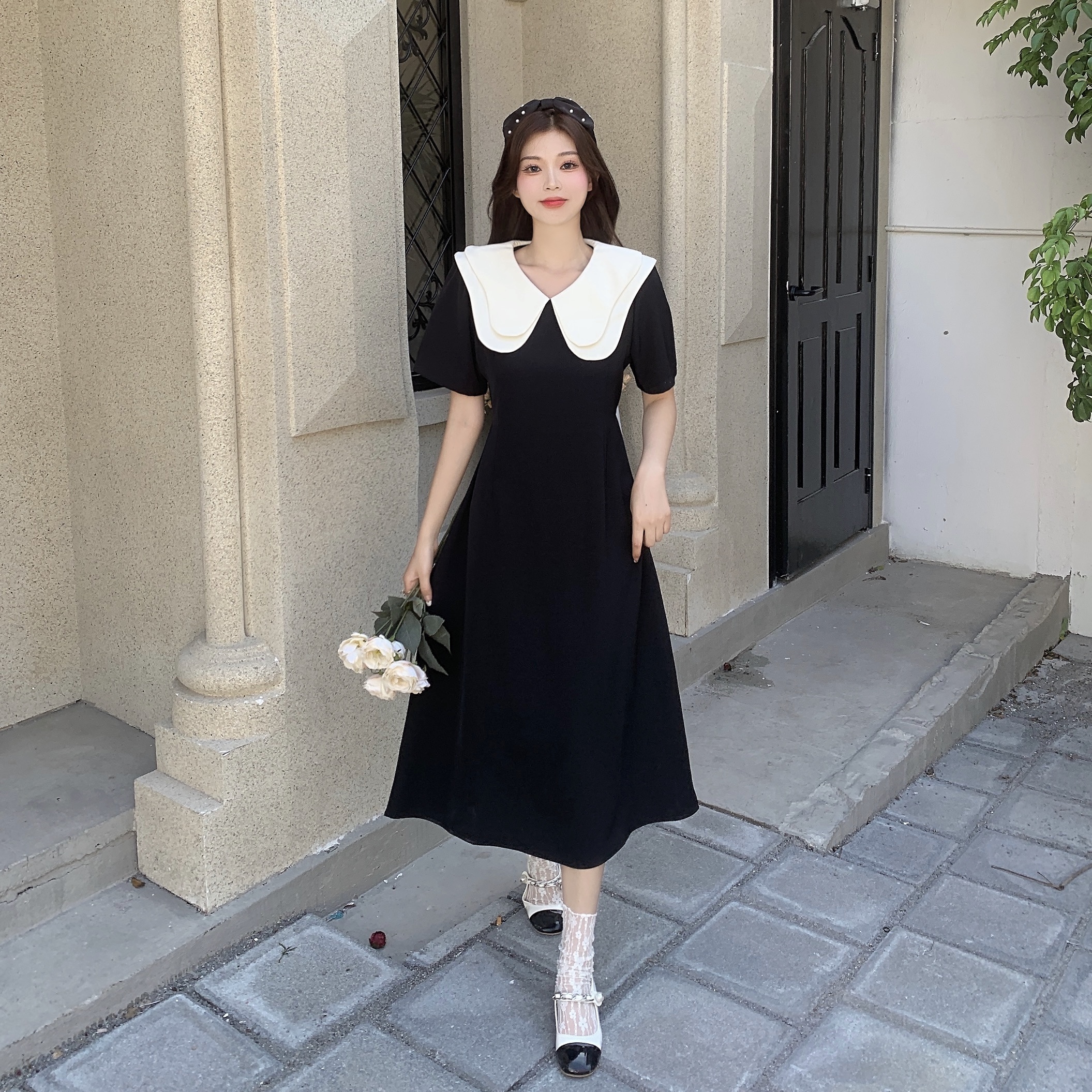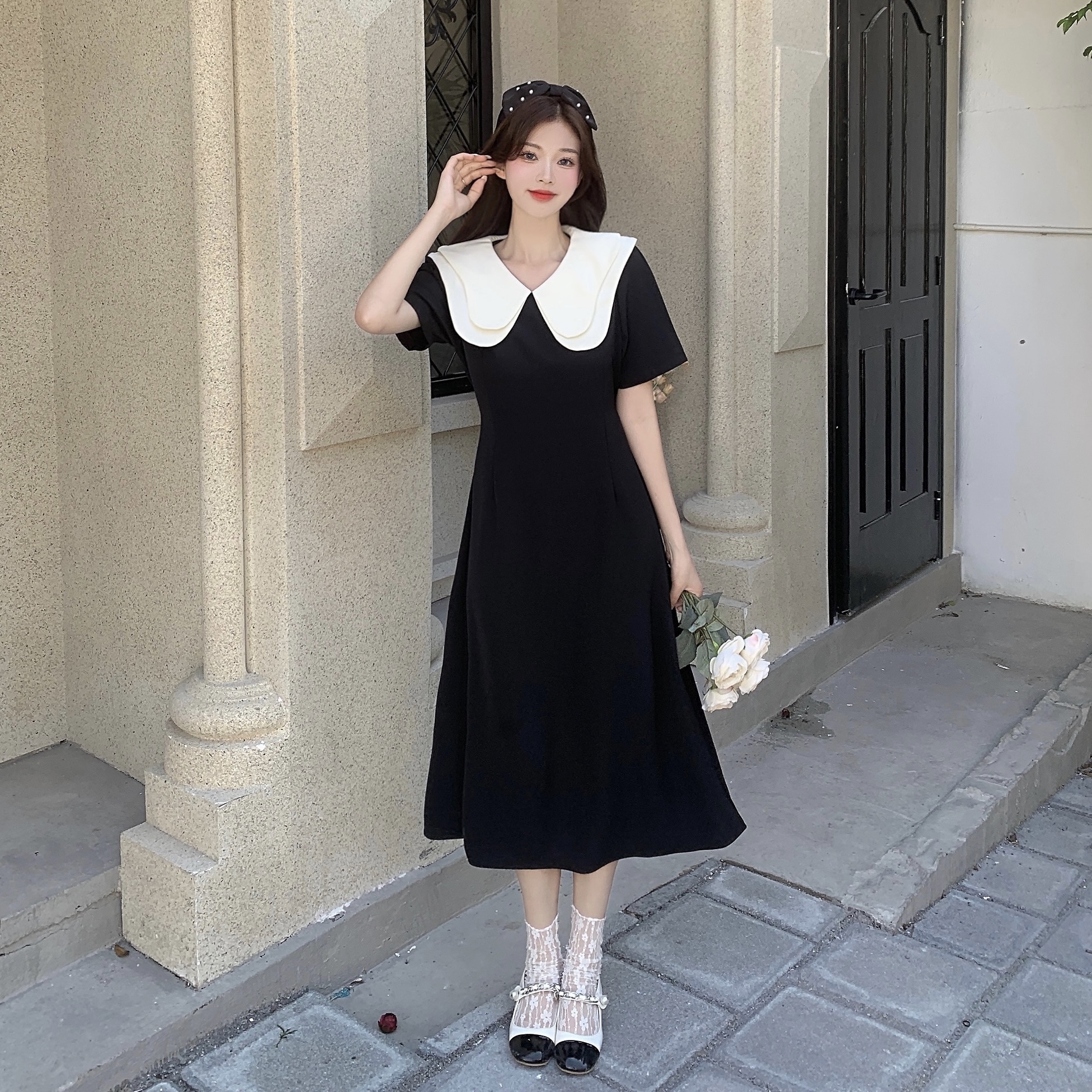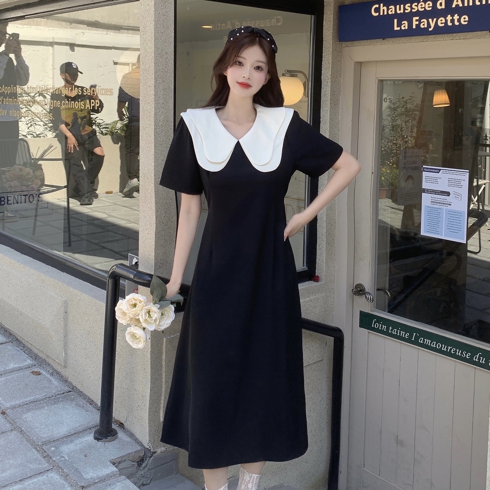 달콤함 한국 스타일 롱 코트 이중층 인형 폴로 칼라 2025 년 여성 여름 드레스 새로운 슬림해 보이는 드레스