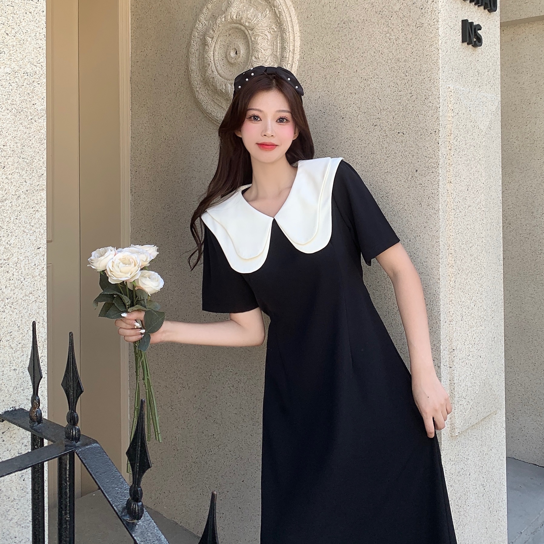 빅 사이즈 여성 의류 지방 mm 부드러운 바람 폴로 칼라 색상 버클 질감 센스 여성 드레스 여름 품격 슬림해 보이는 연령 감소 롱 스커트