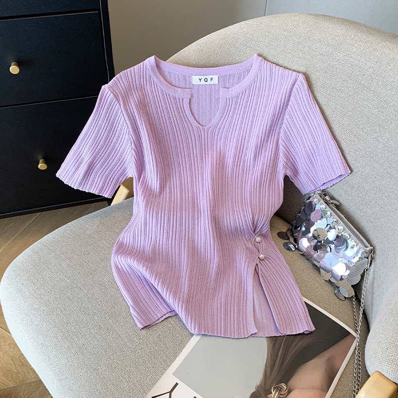 실사 대 물품 2026 여름 새로운 디자인 센스 슬림 피트 순수한 욕망 바람 반팔 티셔츠 얼음 실크 니트 스웨터 여성