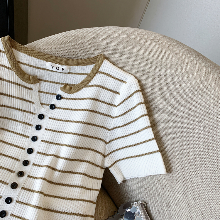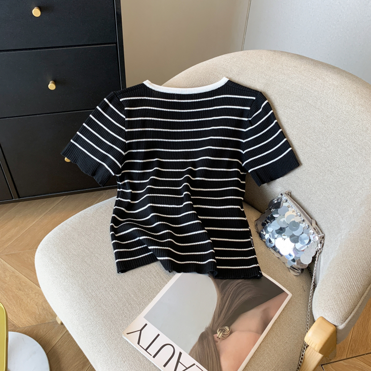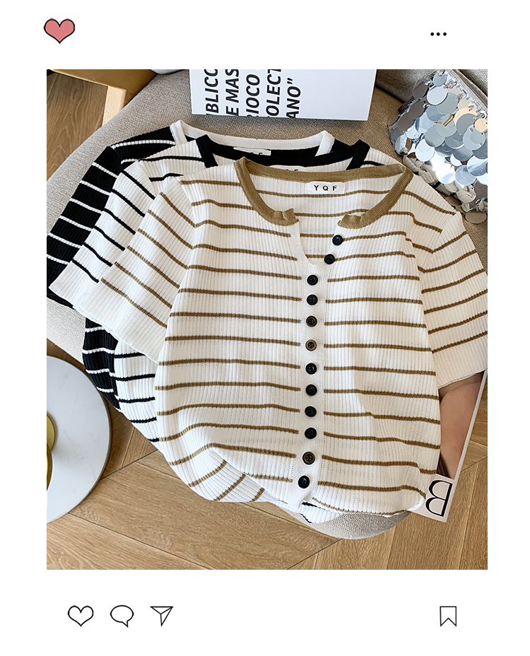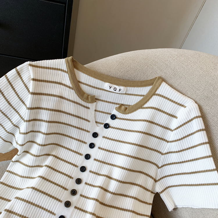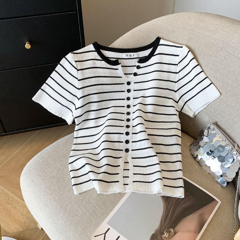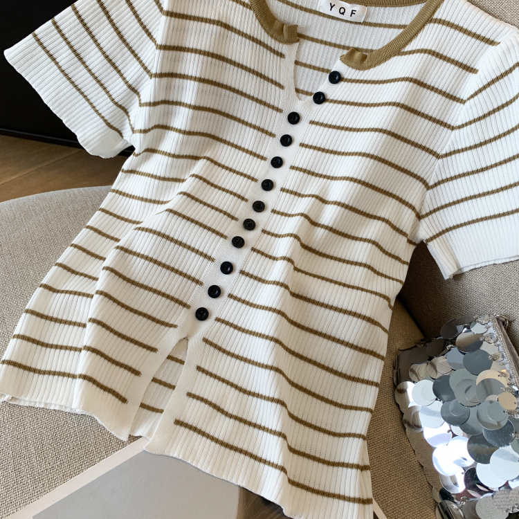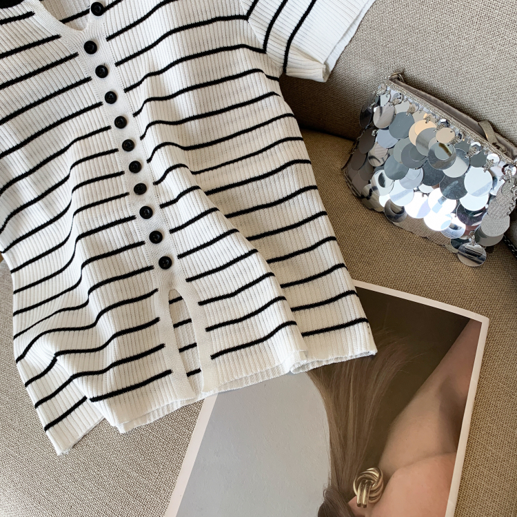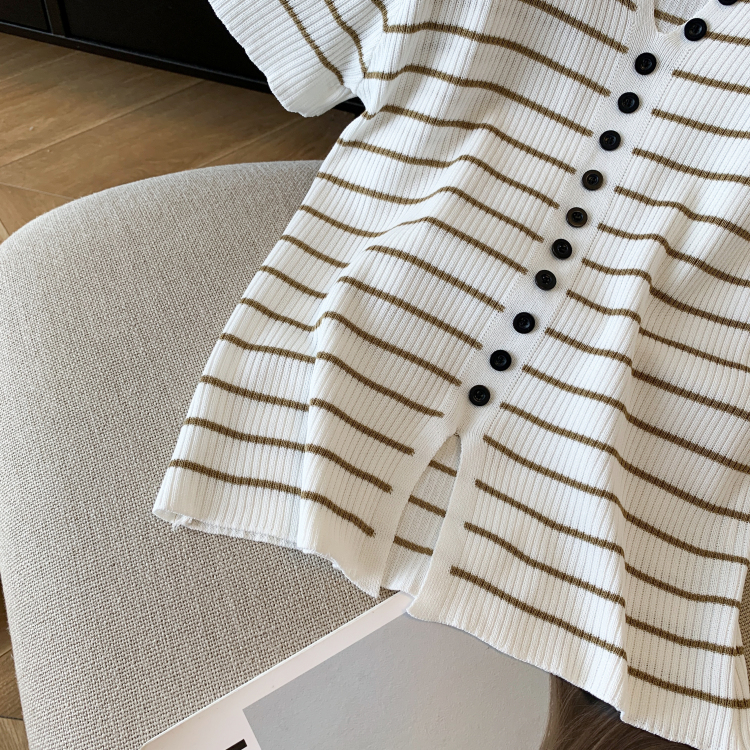 실사 대 물품 2026 여름 새로운 ins 디자인 센스 스트라이프 V넥 반팔 티셔츠 얼음 실크 니트 맨위 여성
