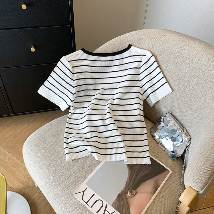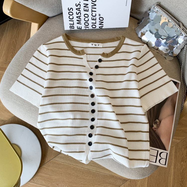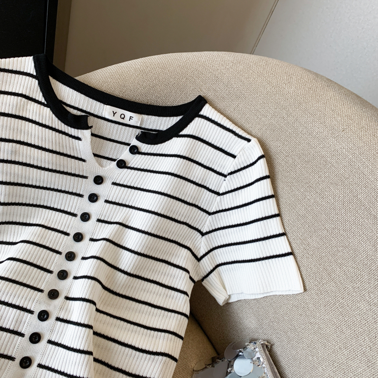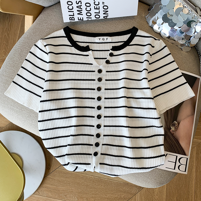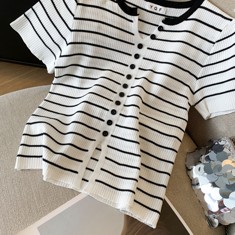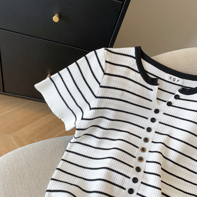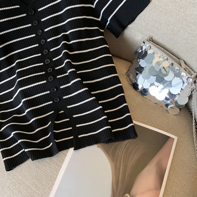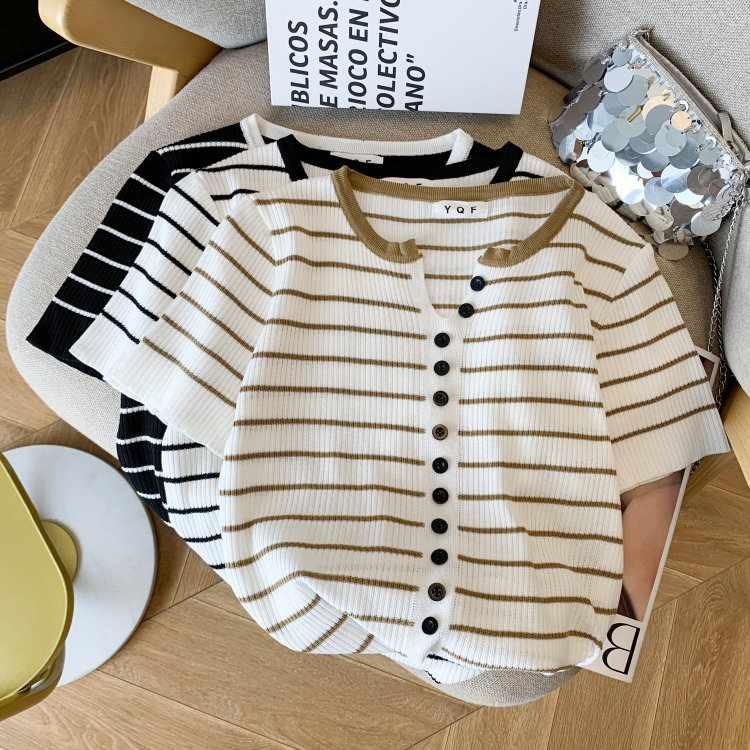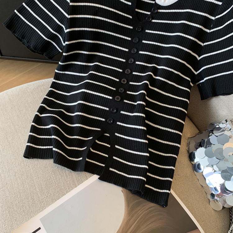 실사 대 물품 2026 여름 새로운 ins 디자인 센스 스트라이프 V넥 반팔 티셔츠 얼음 실크 니트 맨위 여성