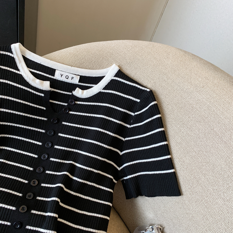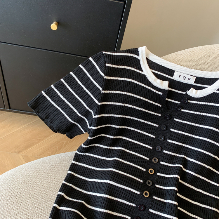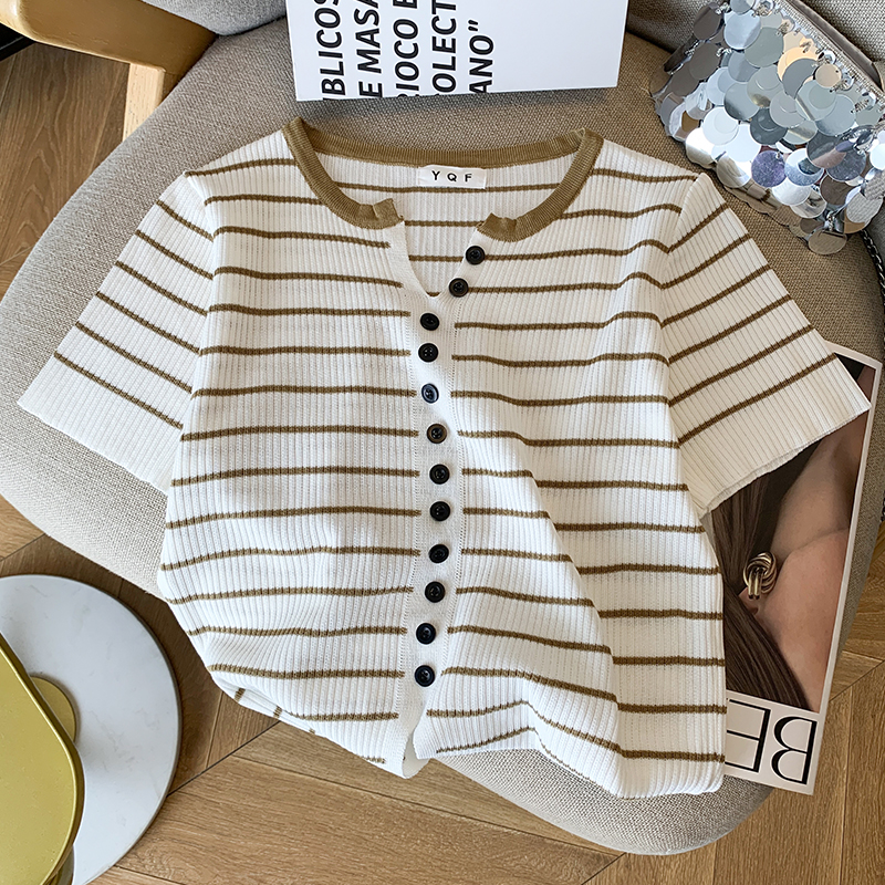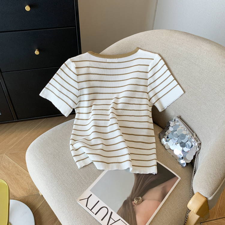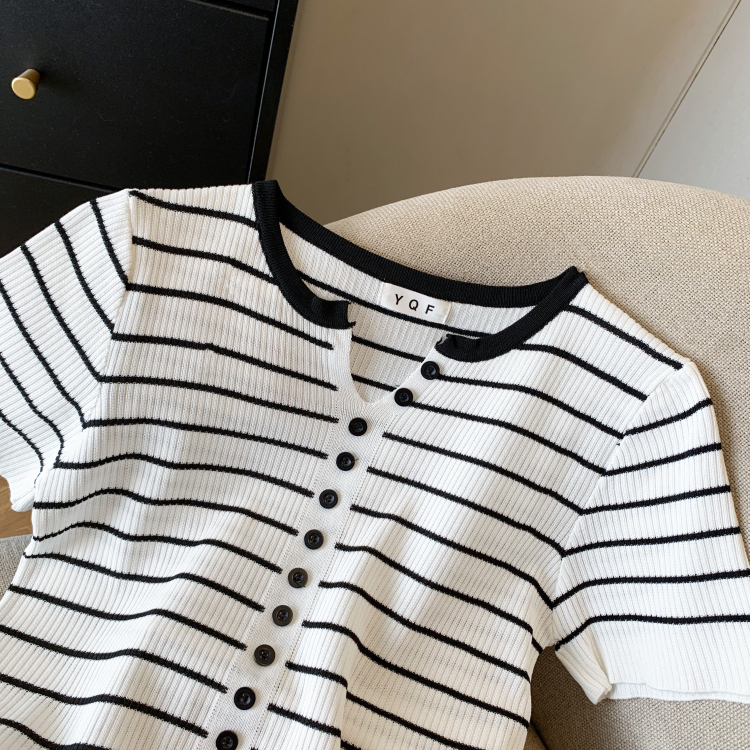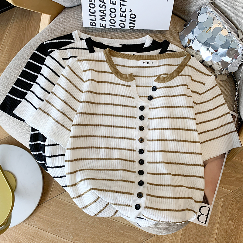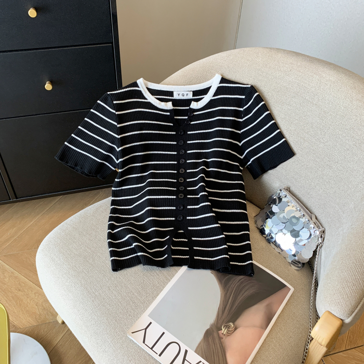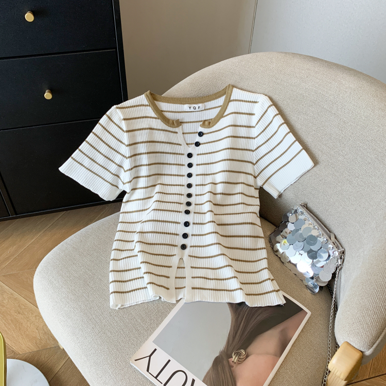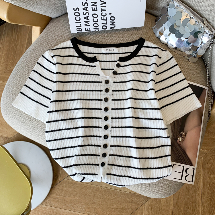 실사 대 물품 2026 여름 새로운 ins 디자인 센스 스트라이프 V넥 반팔 티셔츠 얼음 실크 니트 맨위 여성