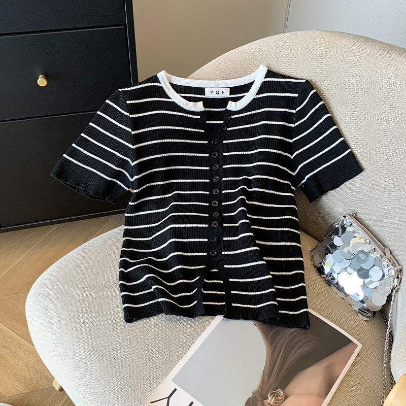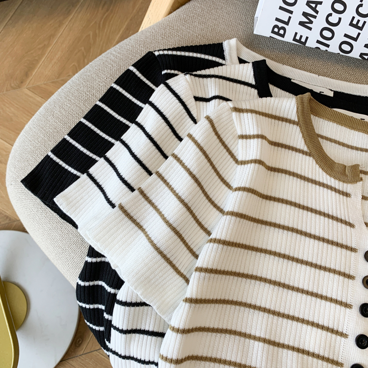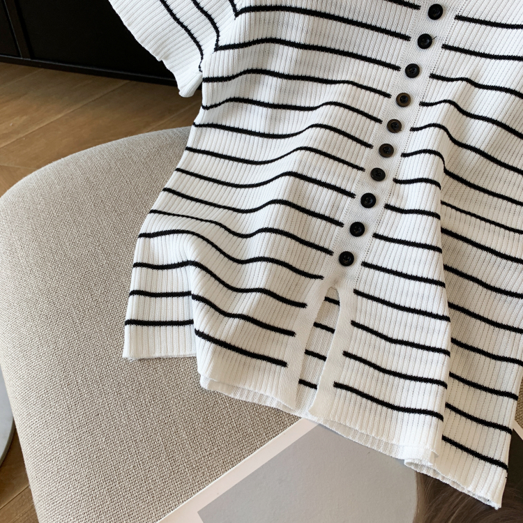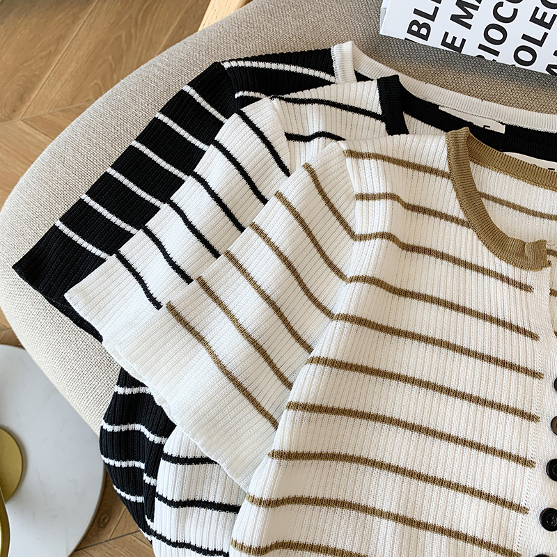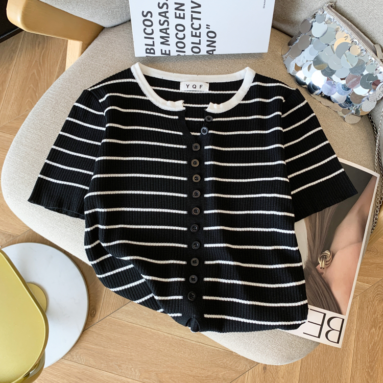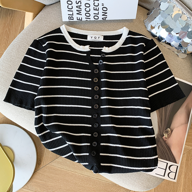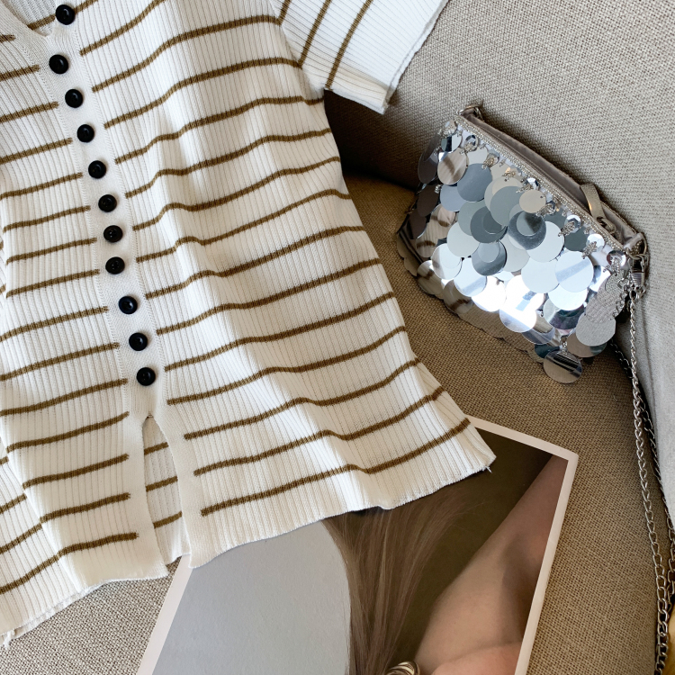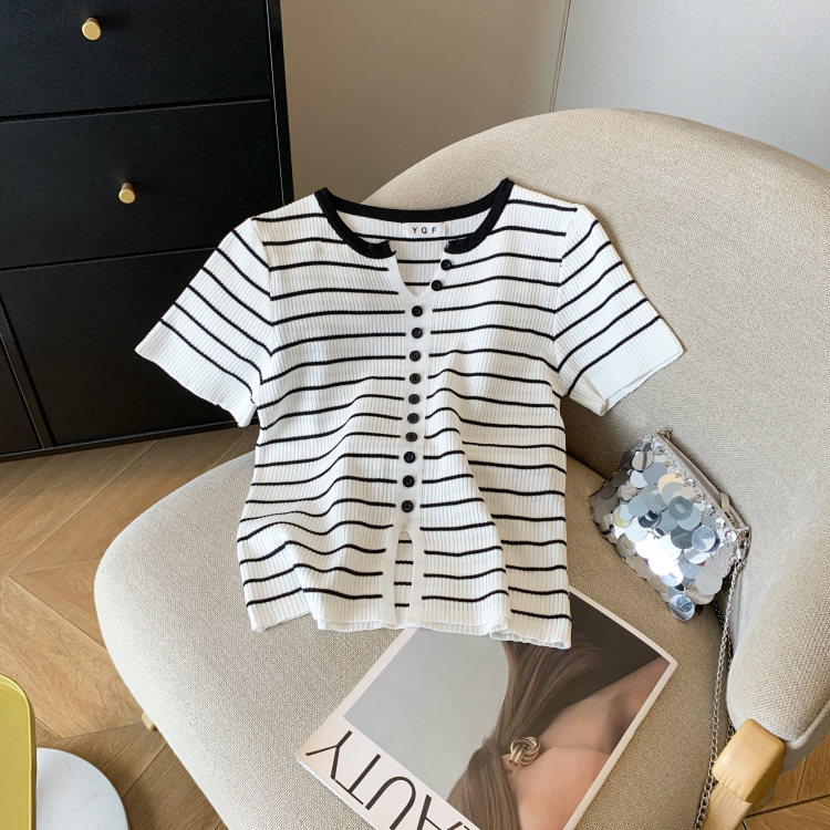 실사 대 물품 2026 여름 새로운 ins 디자인 센스 스트라이프 V넥 반팔 티셔츠 얼음 실크 니트 맨위 여성