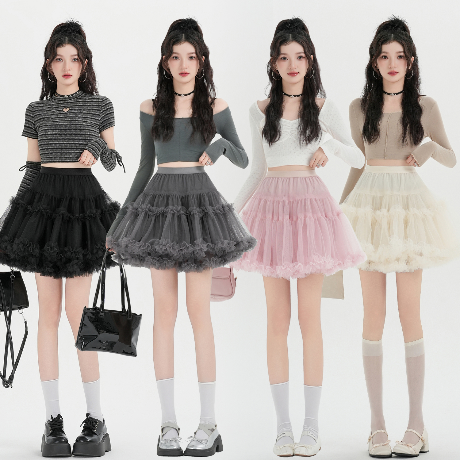 실사 2026 봄 여름 새로운 발레 바람 망사 케이크 드레스 허리밴드 퍼프 프릴 미니 스커트 A라인 스커트
