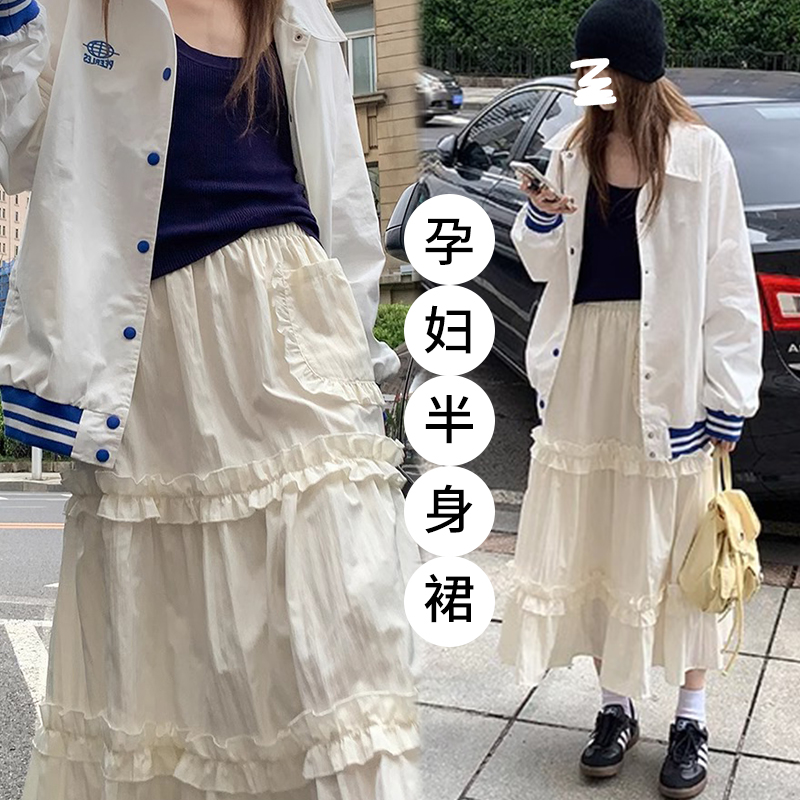 임산부 여름 없음 복부 지지 돼지 코 버클 조정 한 마디 큰 진자 롱 코트 봄 가을 퍼프 스커트 발레 케이크 반신 스커트