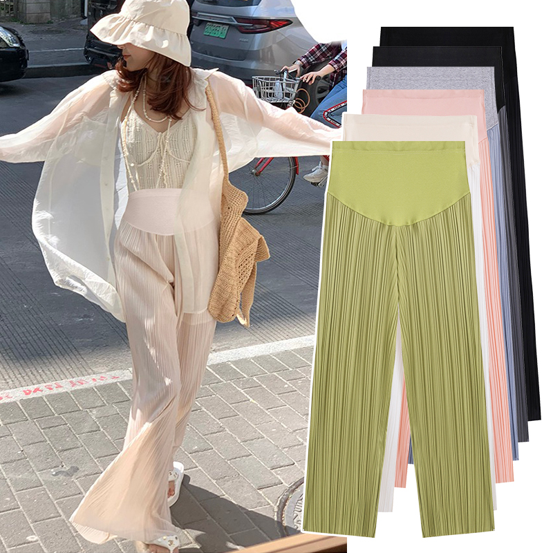 주간 고양이 품질 임산부 바지 새로운 여름 얇은 세 하우스 주름 도루 가을 센스 하이웨이스트 스트레이트 넓은 다리 바닥 청소 복부 지지 바지