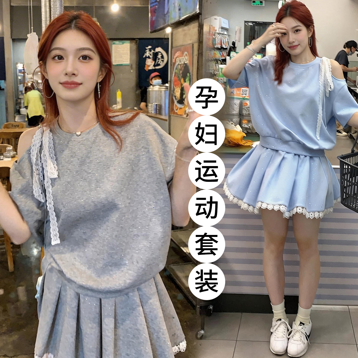 지금 임산부 여름 스팽글 레이스 레이스 한국 스타일 오프숄더 맨위 플리츠 반신 스커트 자이언트 잘 생긴 투피스 세트 세트