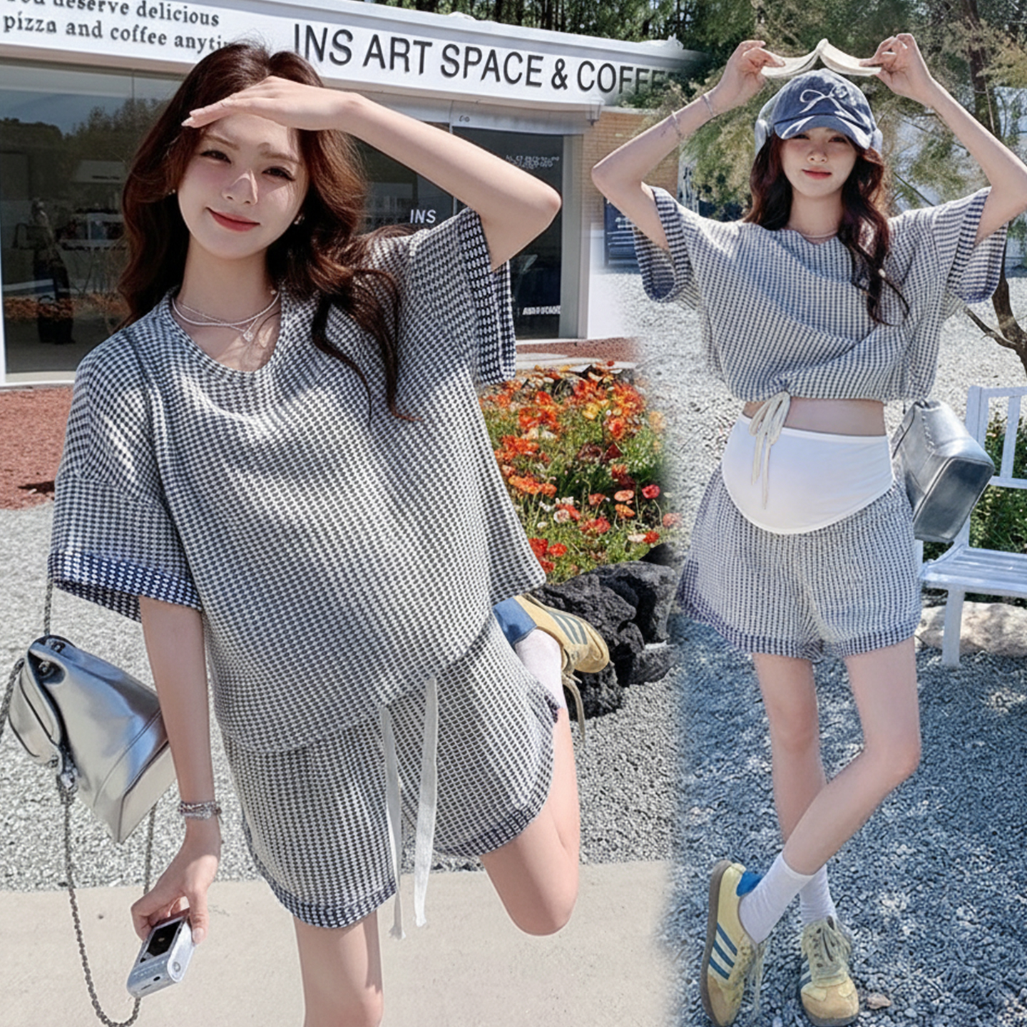 지금 임산부 여름 새로운 패션 체크무늬 반바지 세트 고유 한 펌프 로프 맨위 두 조각 반바지 복부 지지 세트