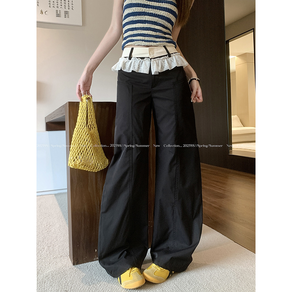 실사 2026 새로운 개성 레이스 조각 워크웨어 팬츠 주머니 스트레이트 캐주얼 바지 여성