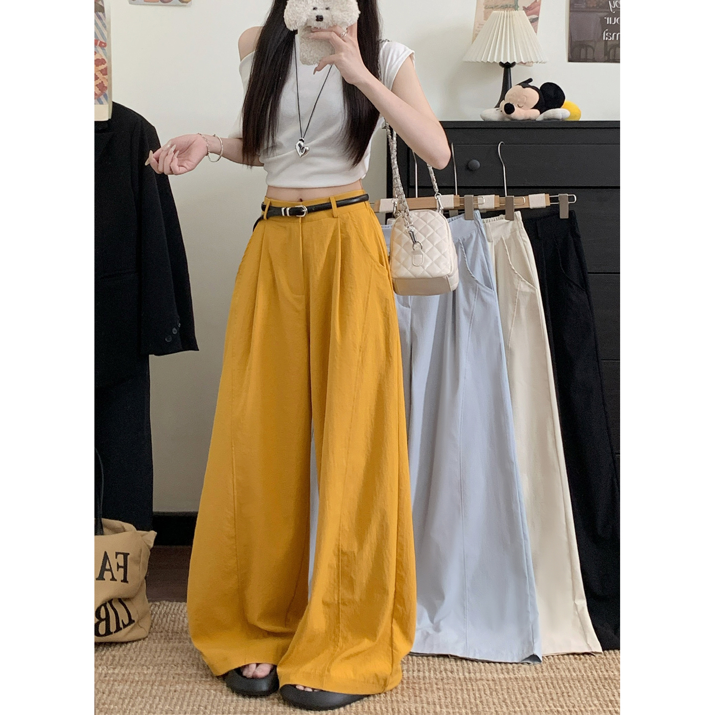 실사 2026 루즈핏 개성 정장 바지 캐주얼 바지 여성 와이드 레그 팬츠 하이웨이스트 도루 센스 바닥 청소 바지