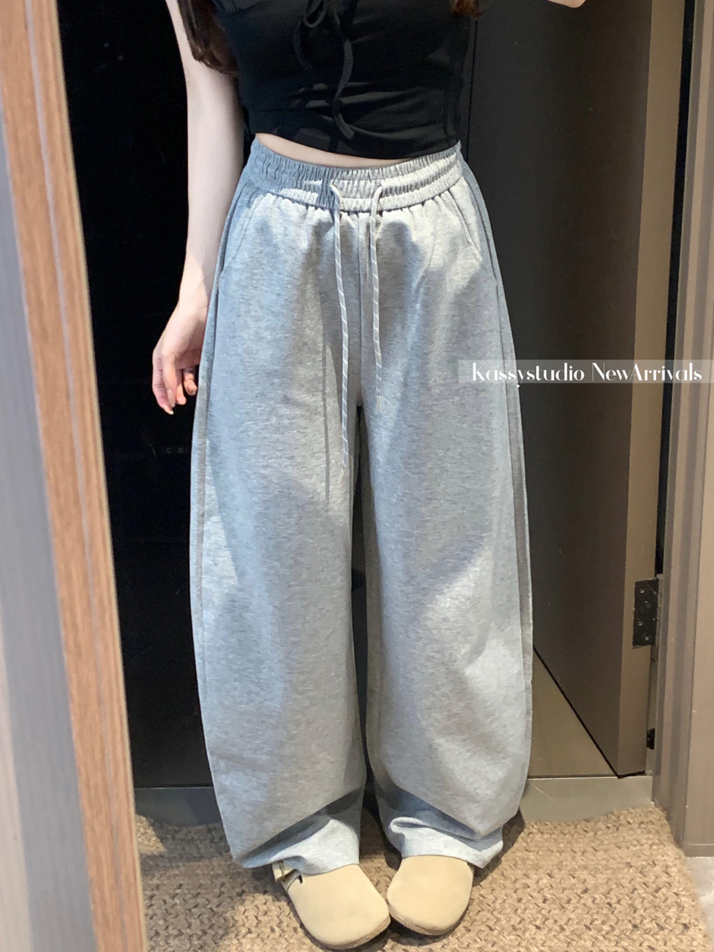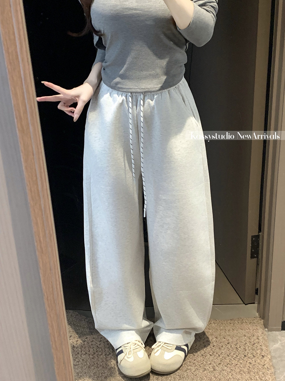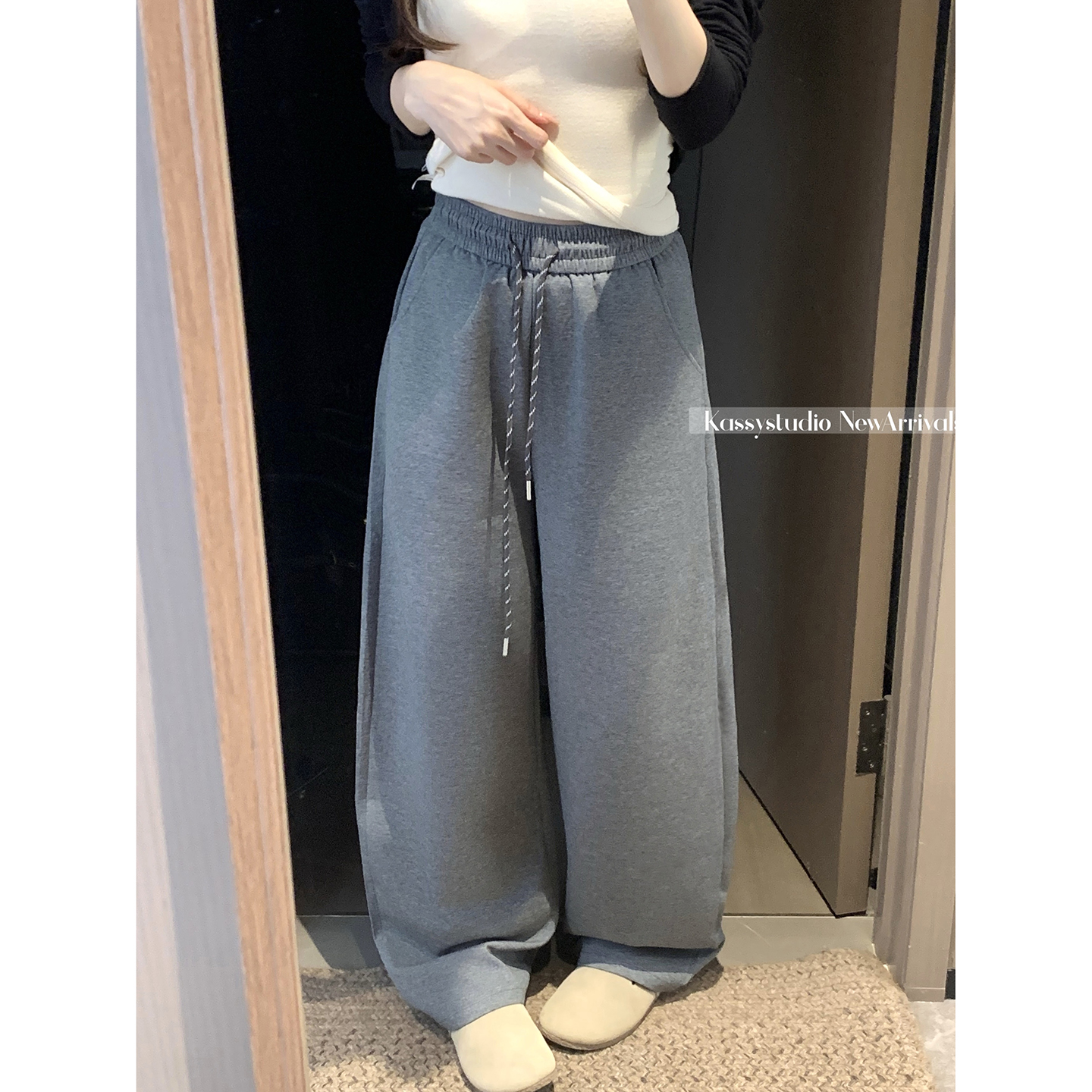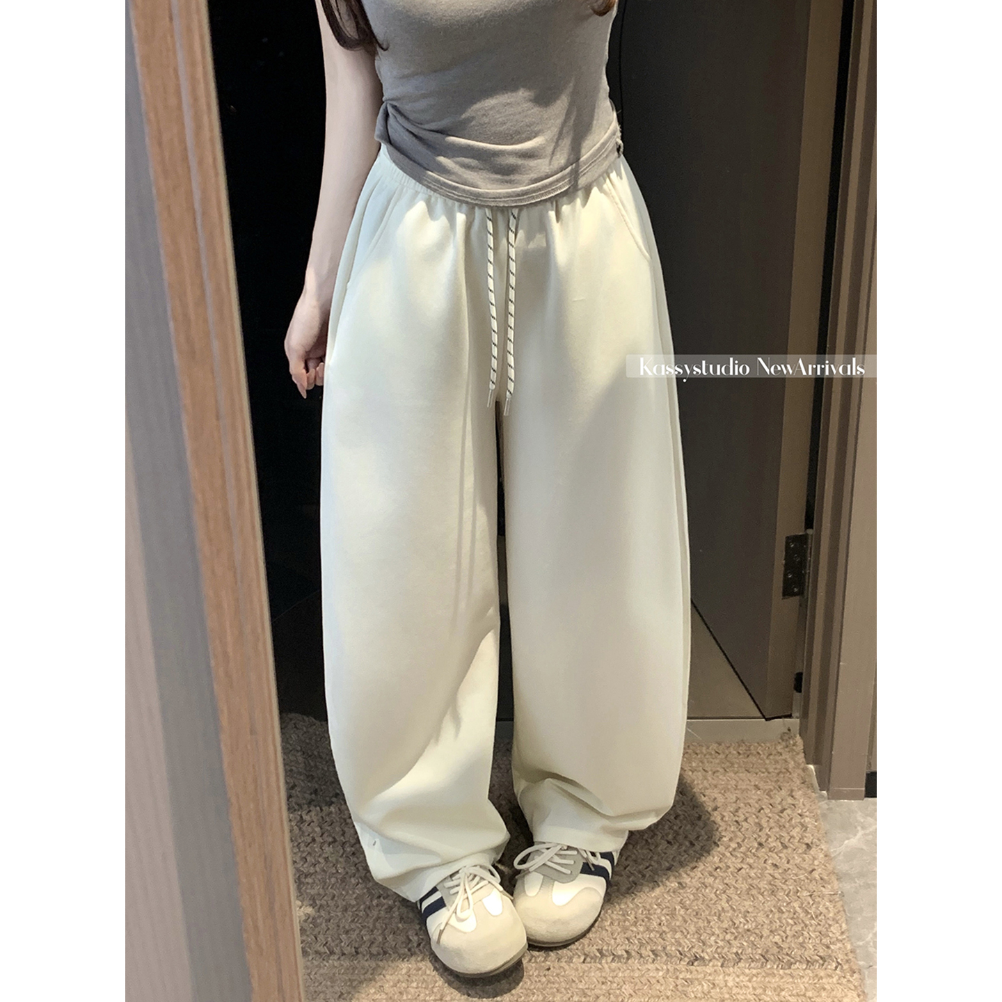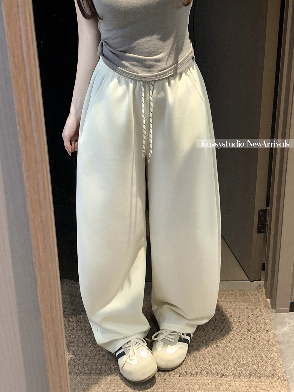 실사 2026 새로운 와이드 레그 팬츠 펌프 로프 레이스업 허리밴드 캐주얼 루즈핏 웨이 바지 여성