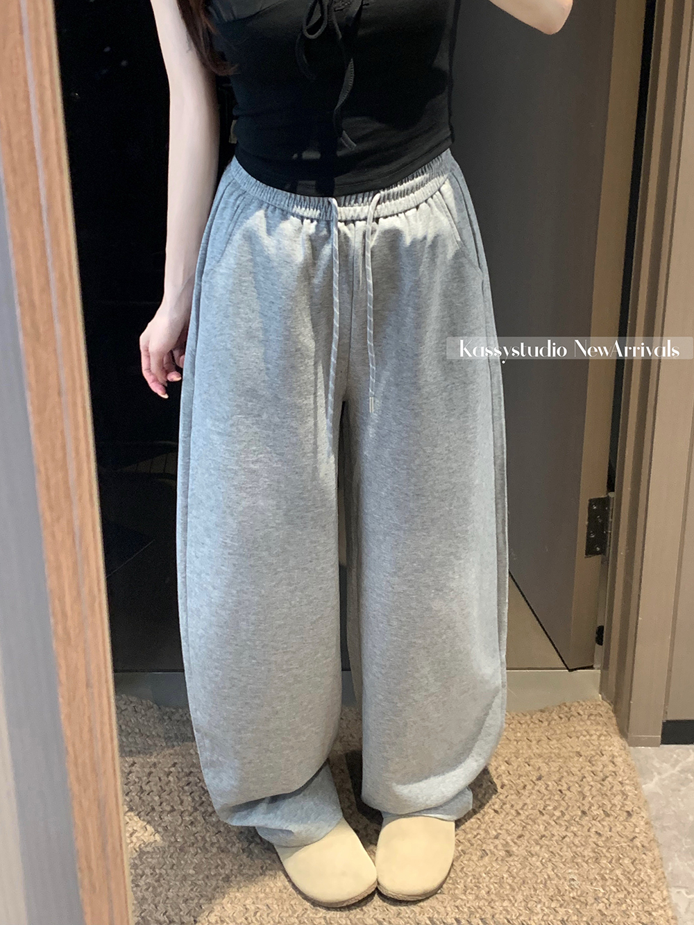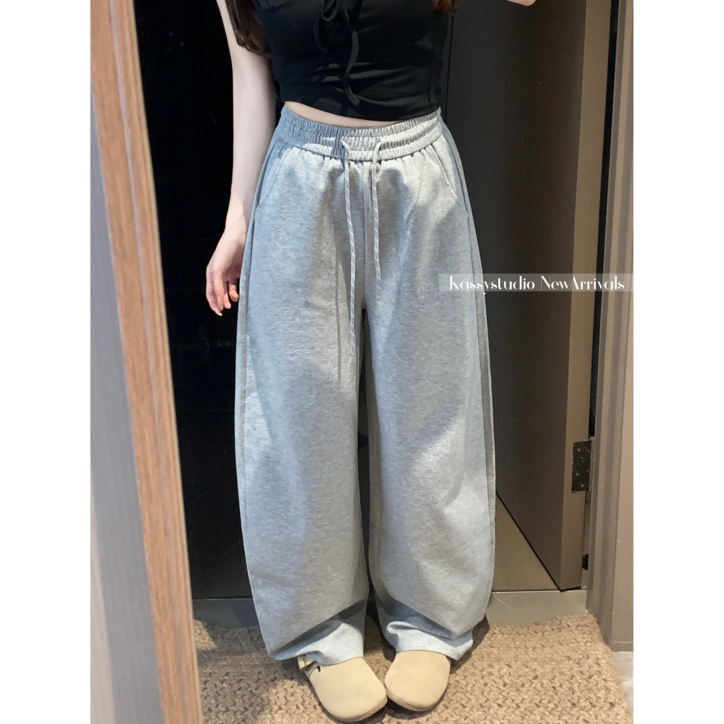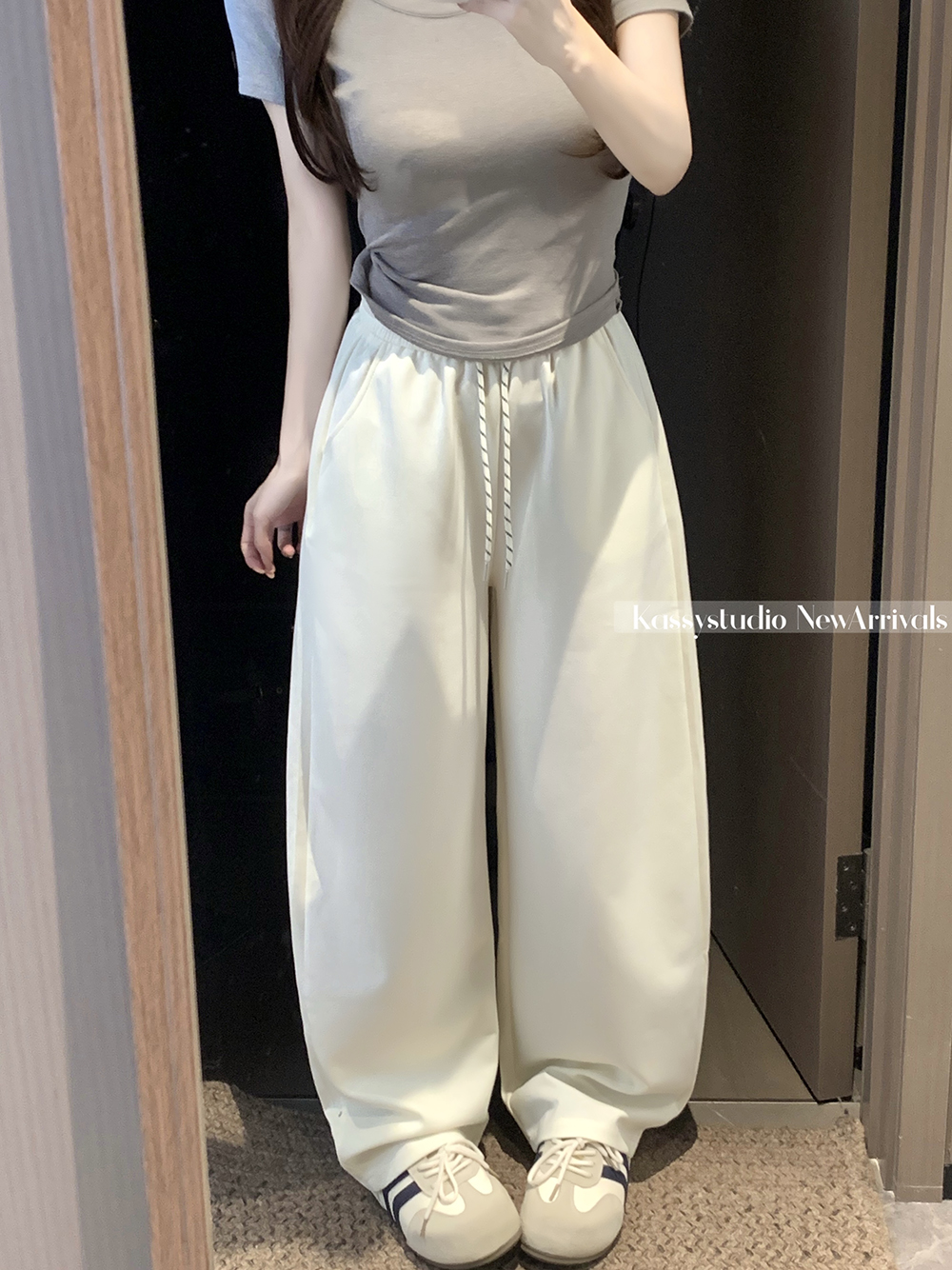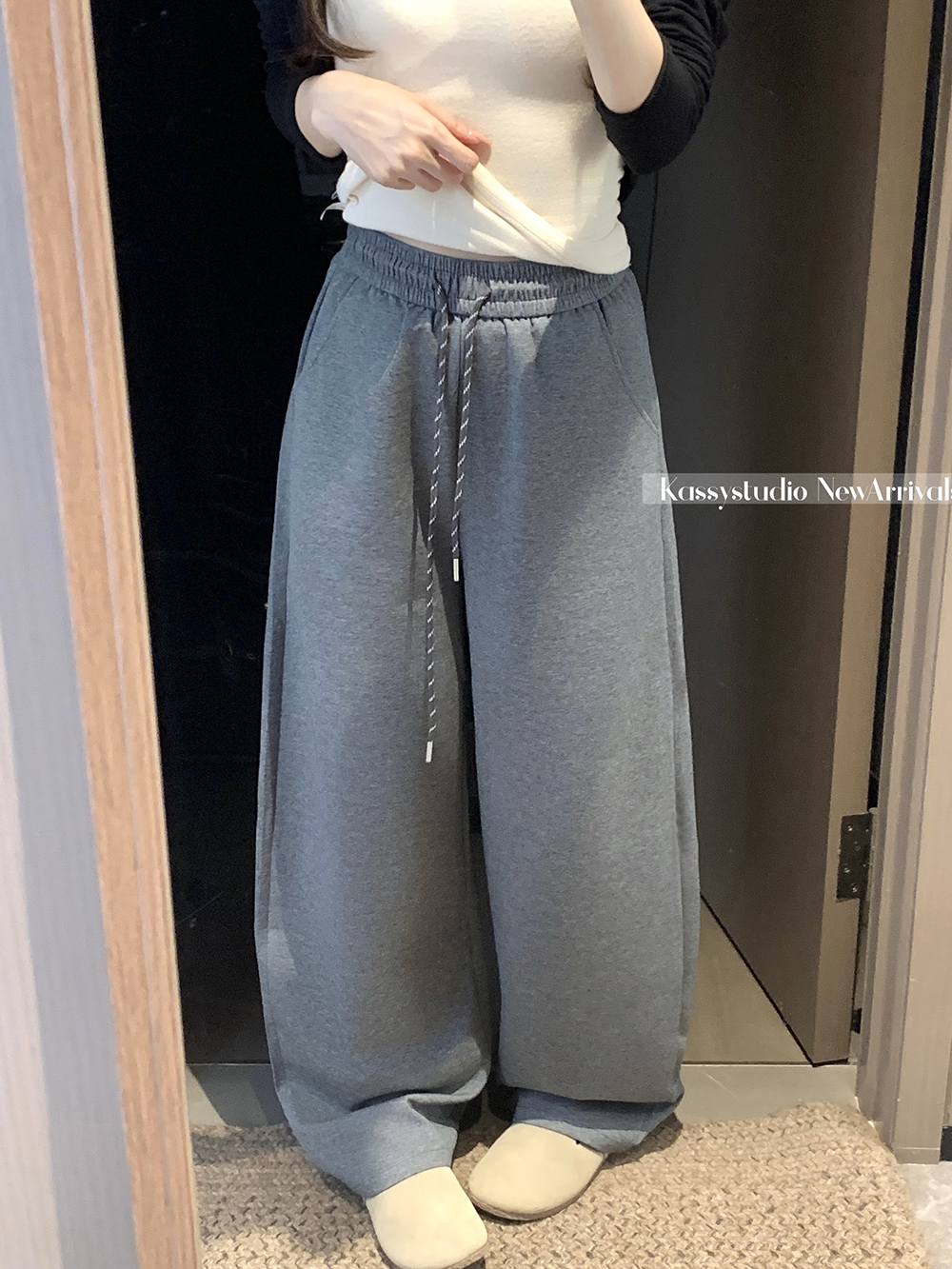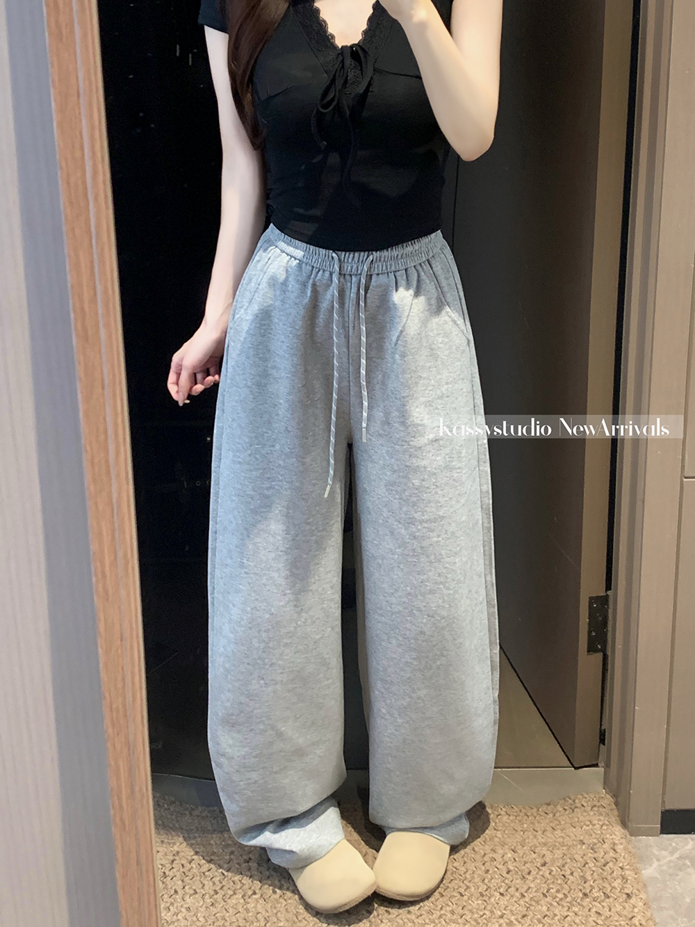 실사 2026 새로운 와이드 레그 팬츠 펌프 로프 레이스업 허리밴드 캐주얼 루즈핏 웨이 바지 여성