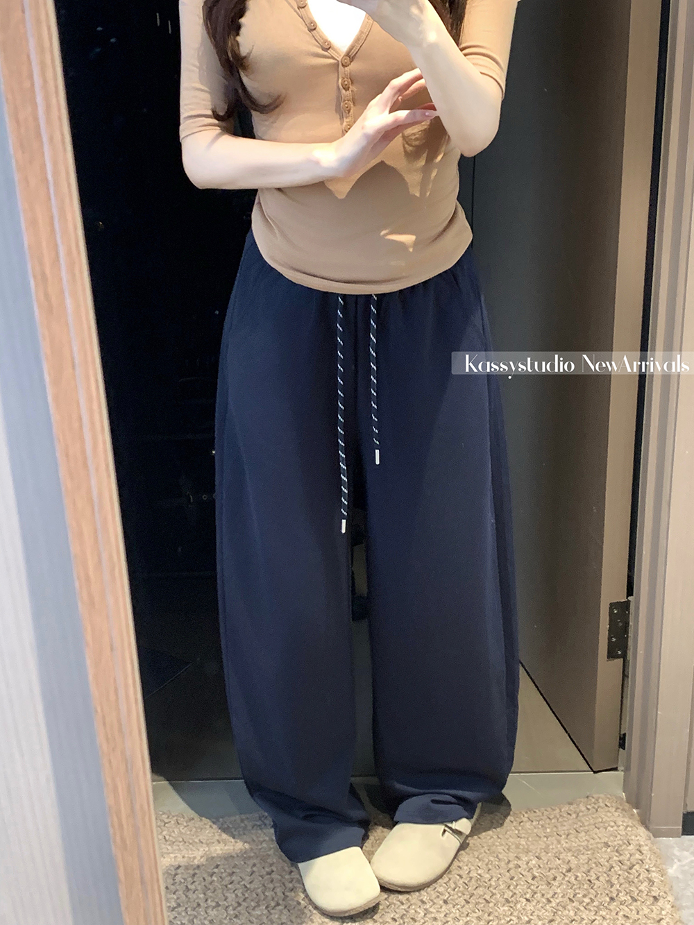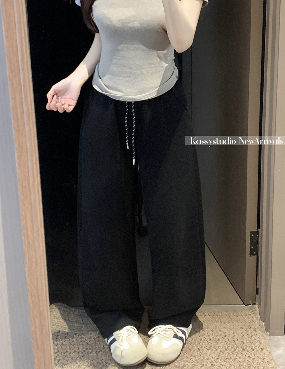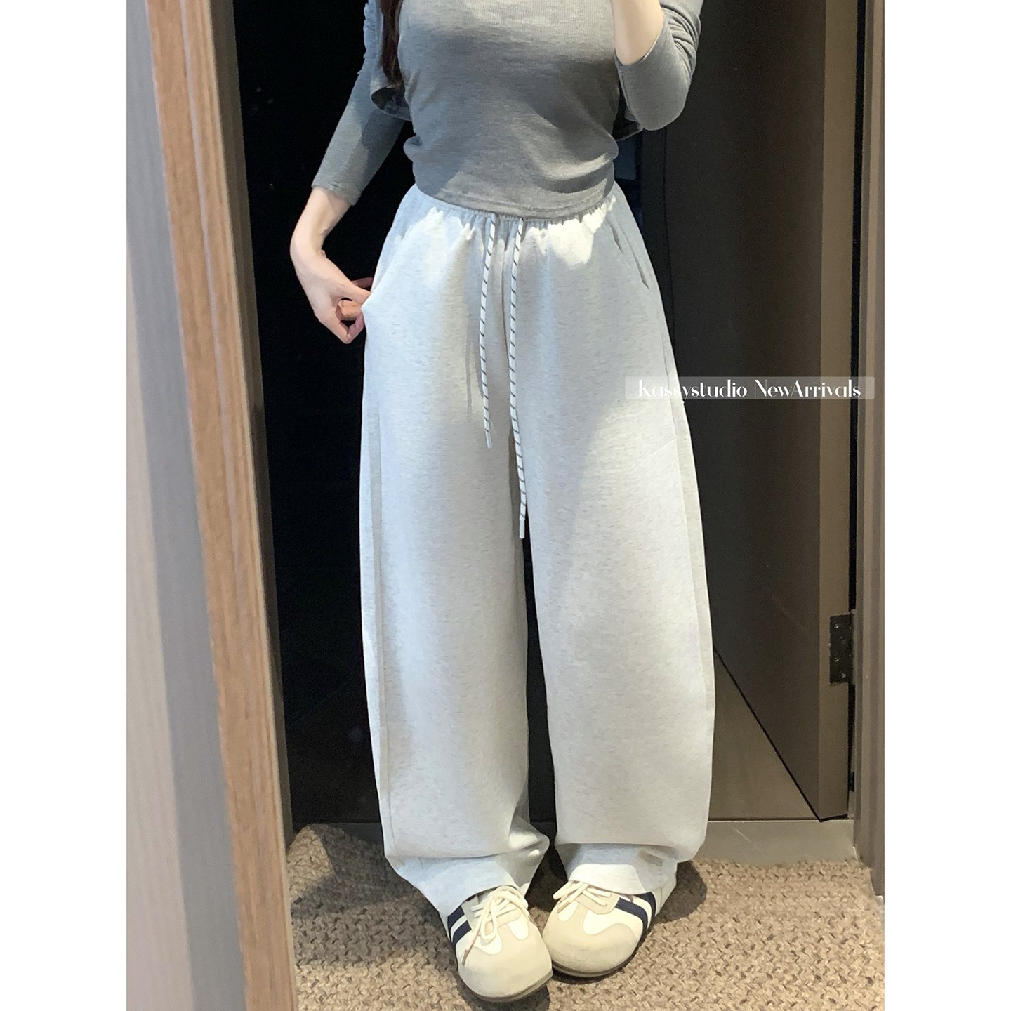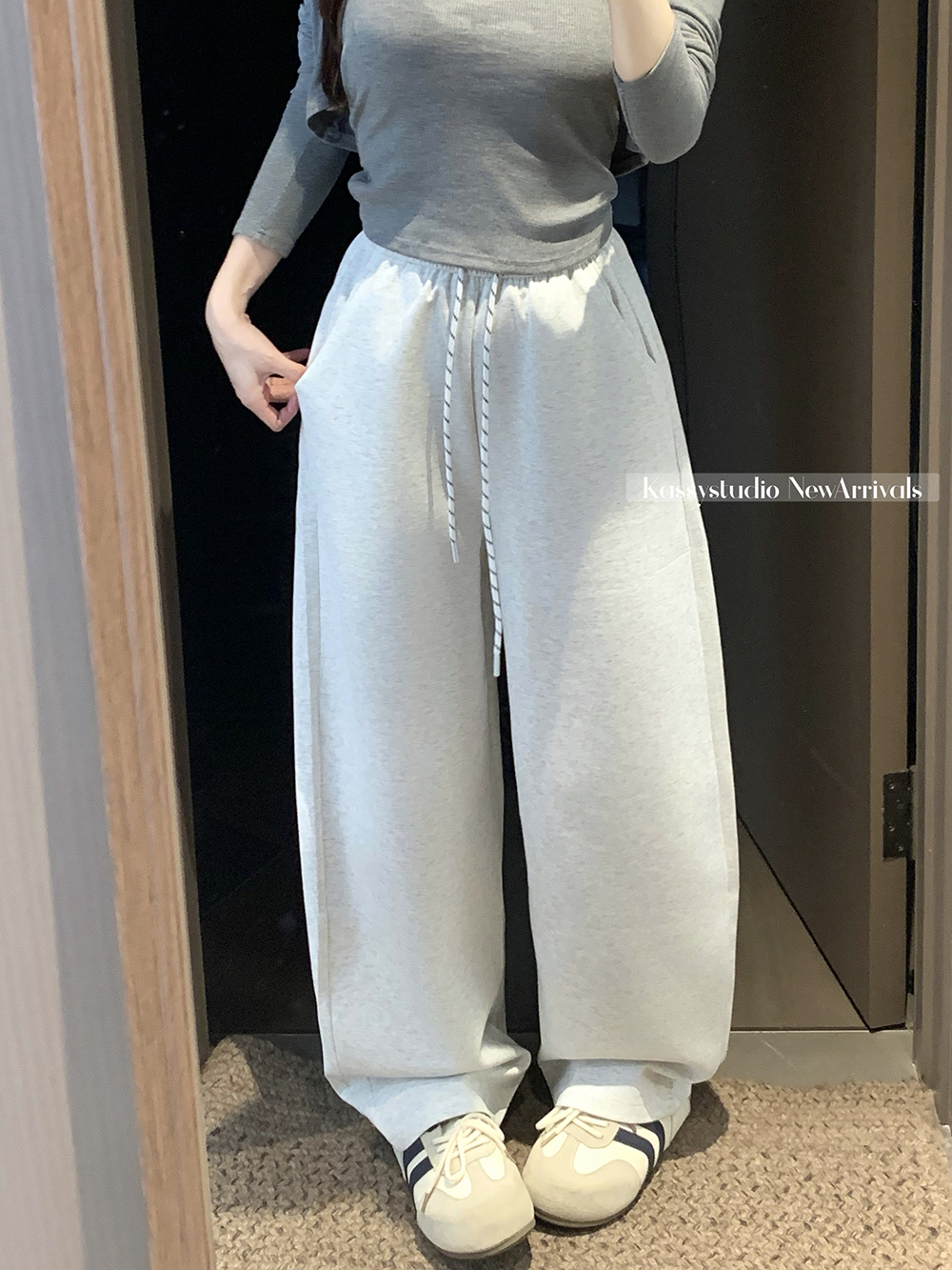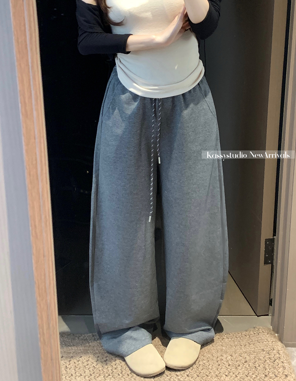 실사 2026 새로운 와이드 레그 팬츠 펌프 로프 레이스업 허리밴드 캐주얼 루즈핏 웨이 바지 여성