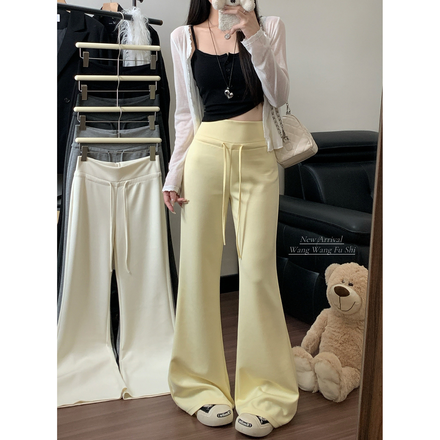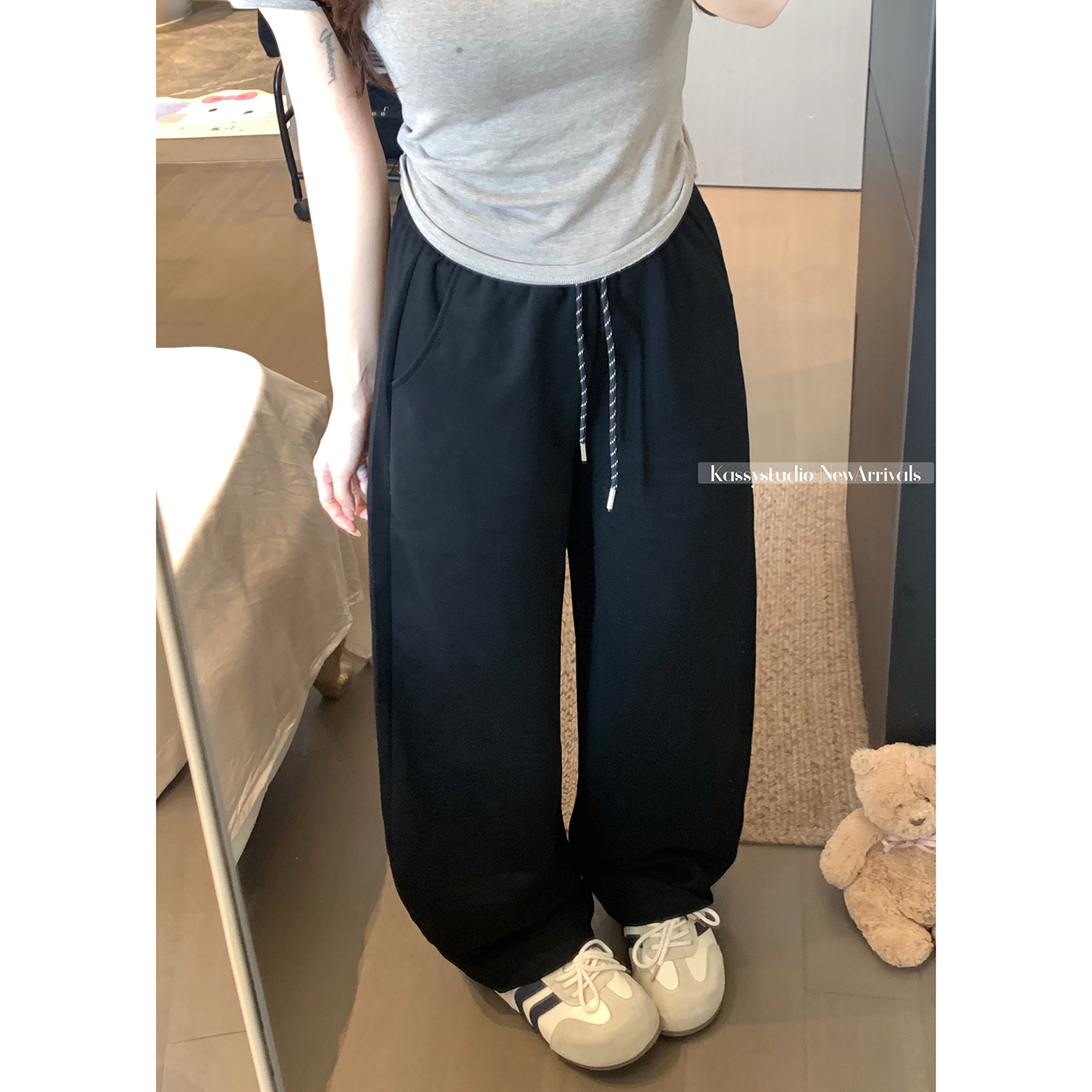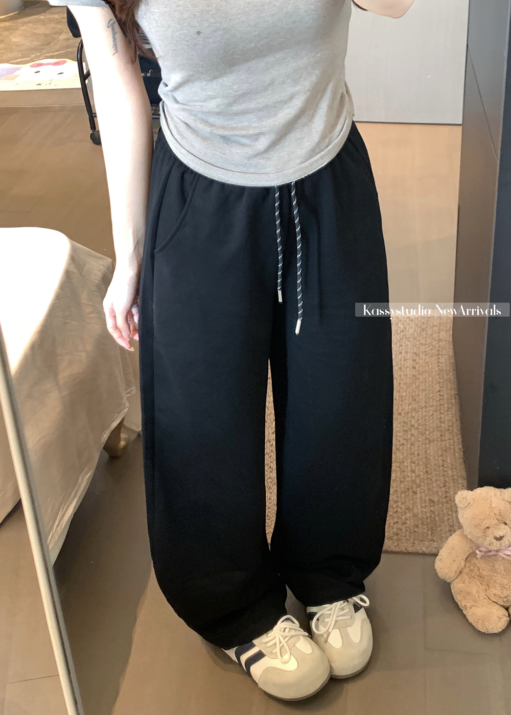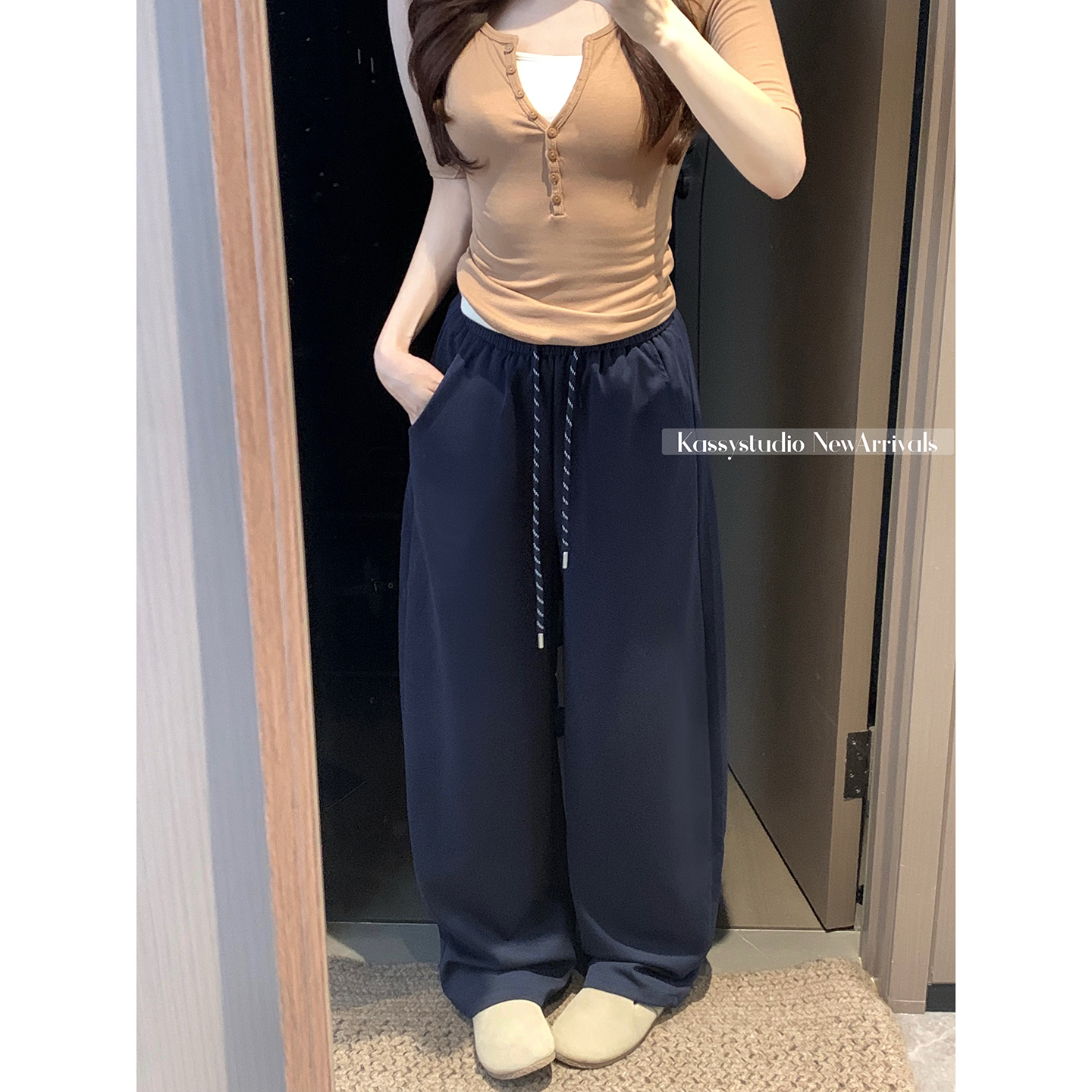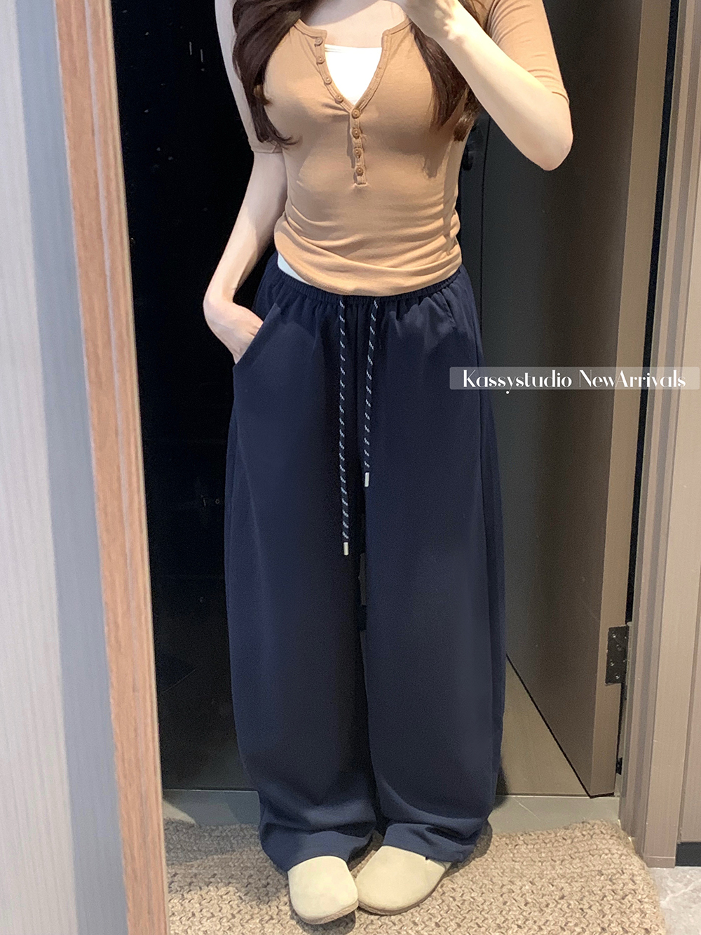 실사 2026 새로운 와이드 레그 팬츠 펌프 로프 레이스업 허리밴드 캐주얼 루즈핏 웨이 바지 여성