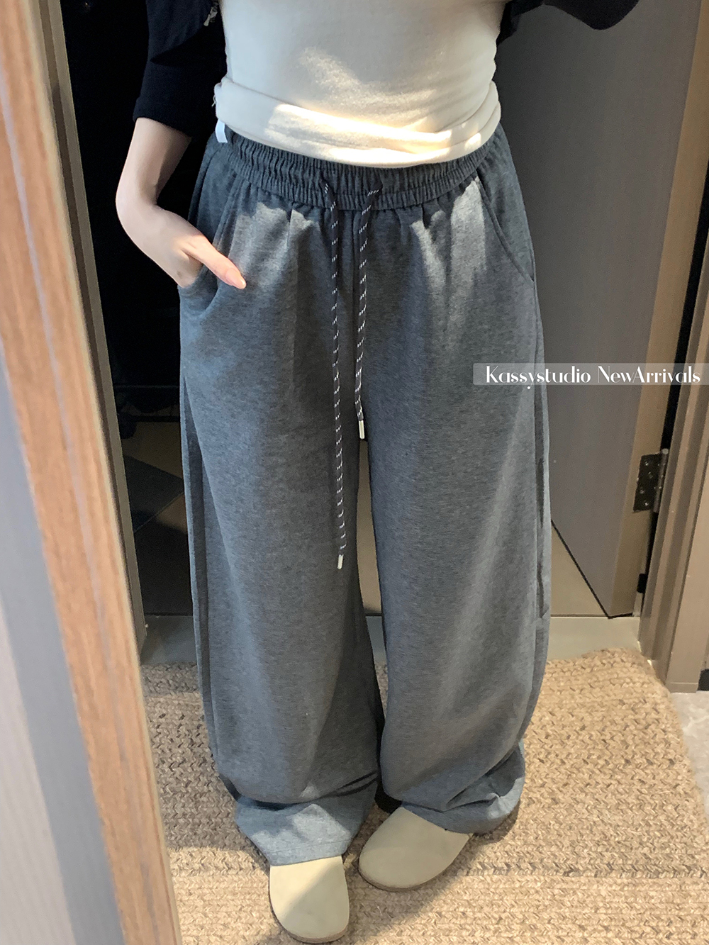 실사 2026 새로운 개성 디자인 센스 와이드 레깅스 바지 도루 센스 루즈핏 캐주얼 바지