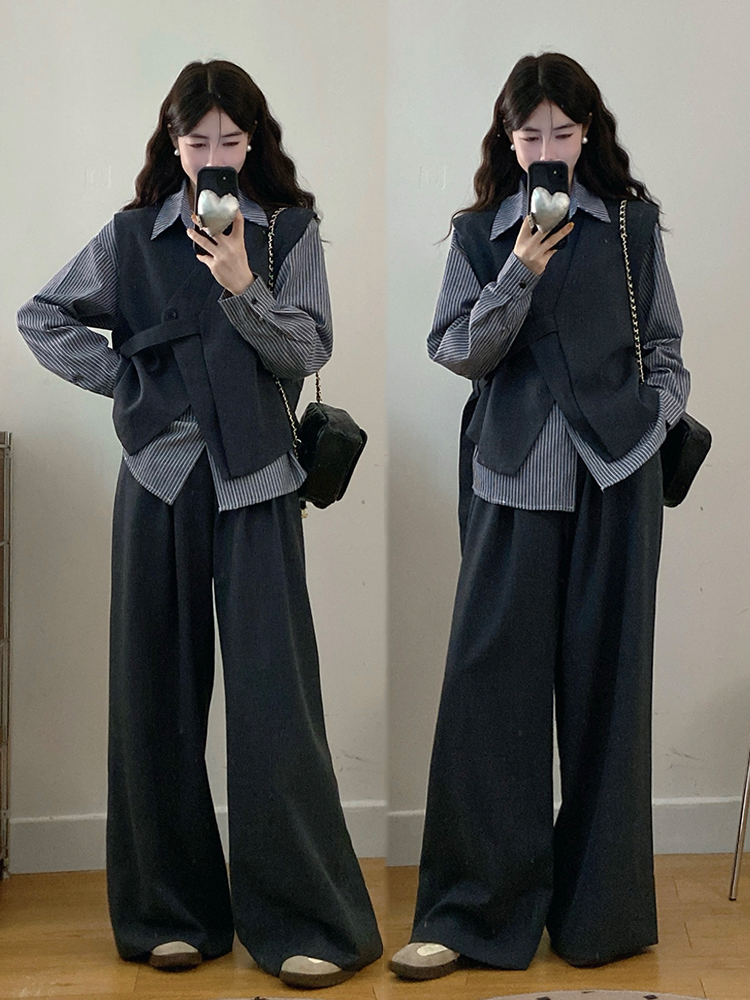 실사 빅 사이즈 여성 의류 2026 봄 새로운 불규칙 베스트 스트라이프 셔츠 와이드 레그 팬츠 3종 세트