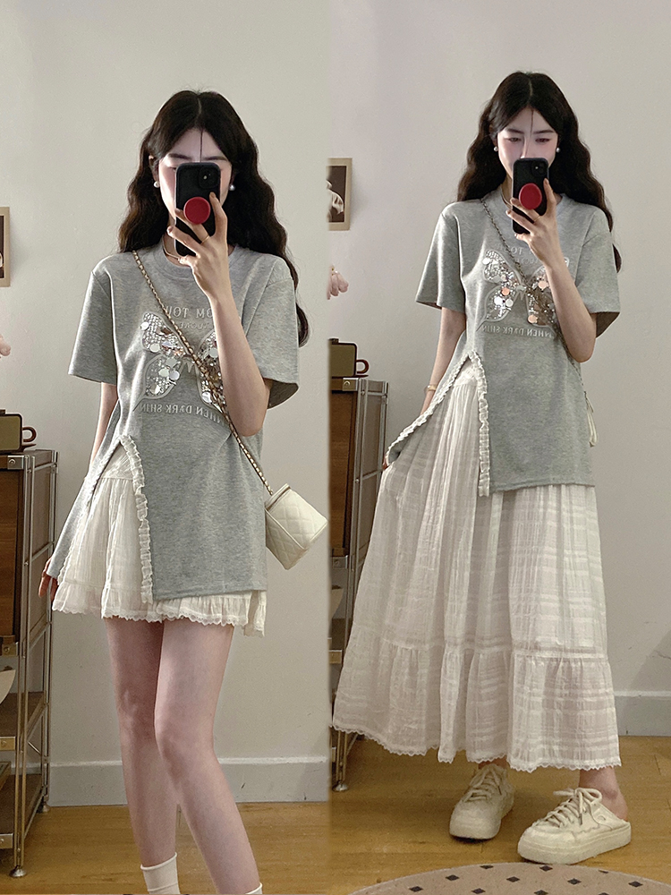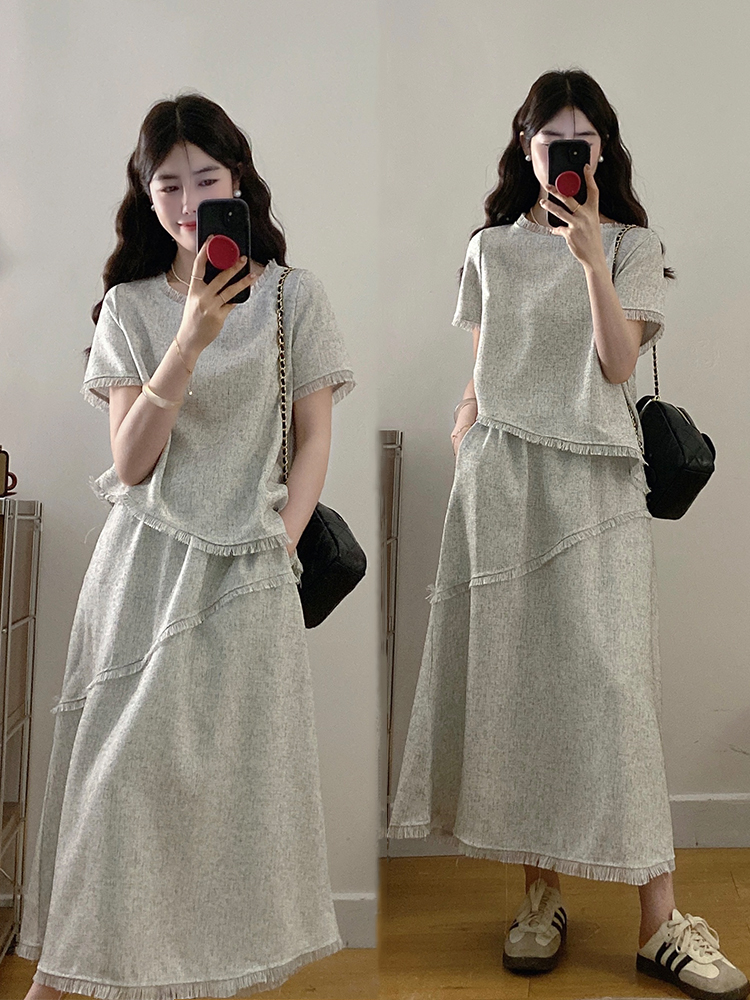 실사 빅 사이즈 여성 의류 2026 여름 새로운 고급 센스 라운드 넥 밝은 회색 색상 반팔 품격 술 치마 세트