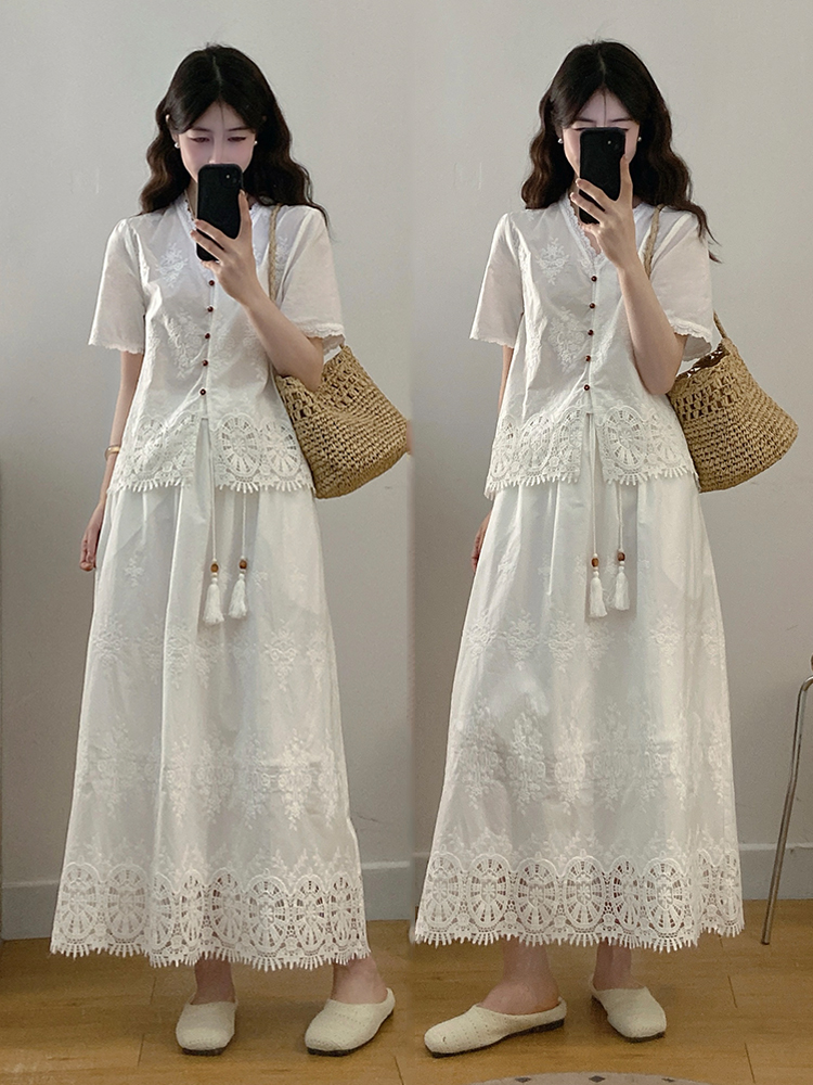 실사 빅 사이즈 여성 의류 2026 여름 새로운 프랑스식 레트로 자수 셔츠 하이웨이스트 반신 스커트 투피스 세트