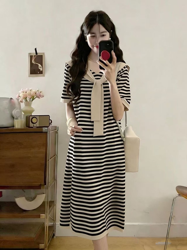 2026 여름 파란색 POLO 칼라 문예 스트라이프 드레스 여성 의류 교 자본금 면접 치마