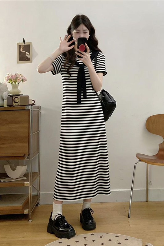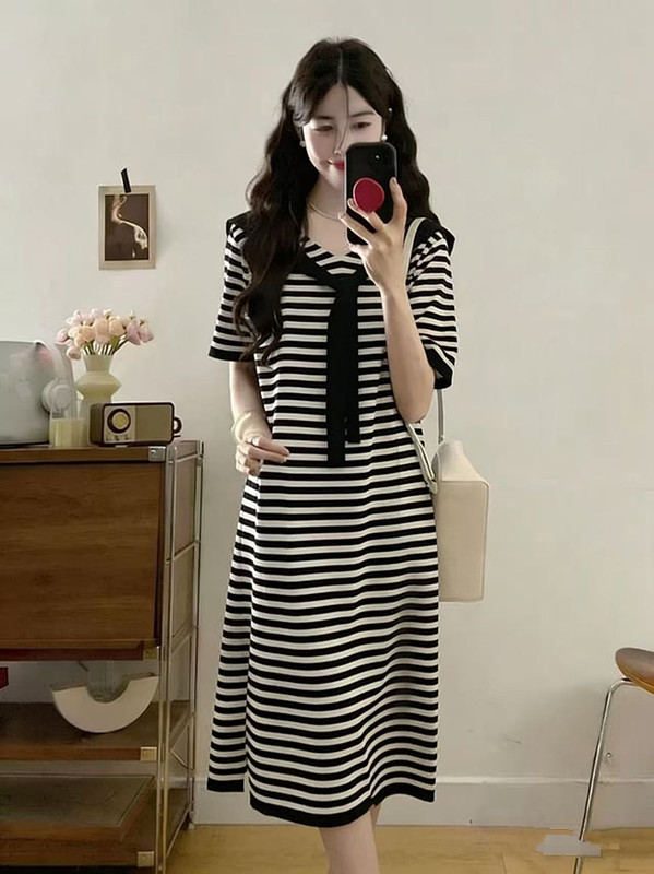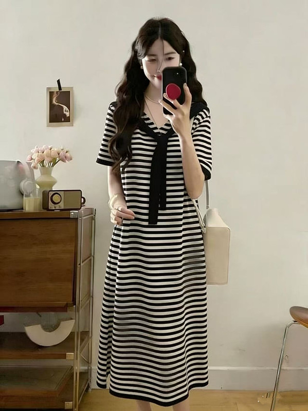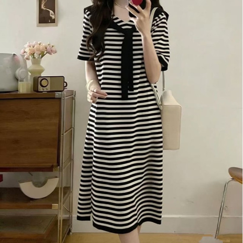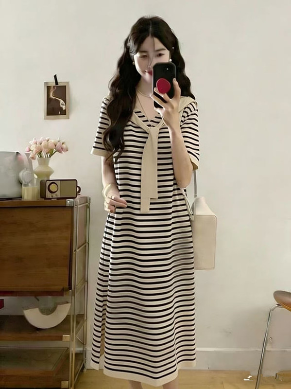 얇은 스타일 얼음 실크 스트라이프 니트 드레스 여성용 짧은 소매 루즈핏 롱 코트 무릎 아래 티셔츠 롱 스커트 후드 외출용