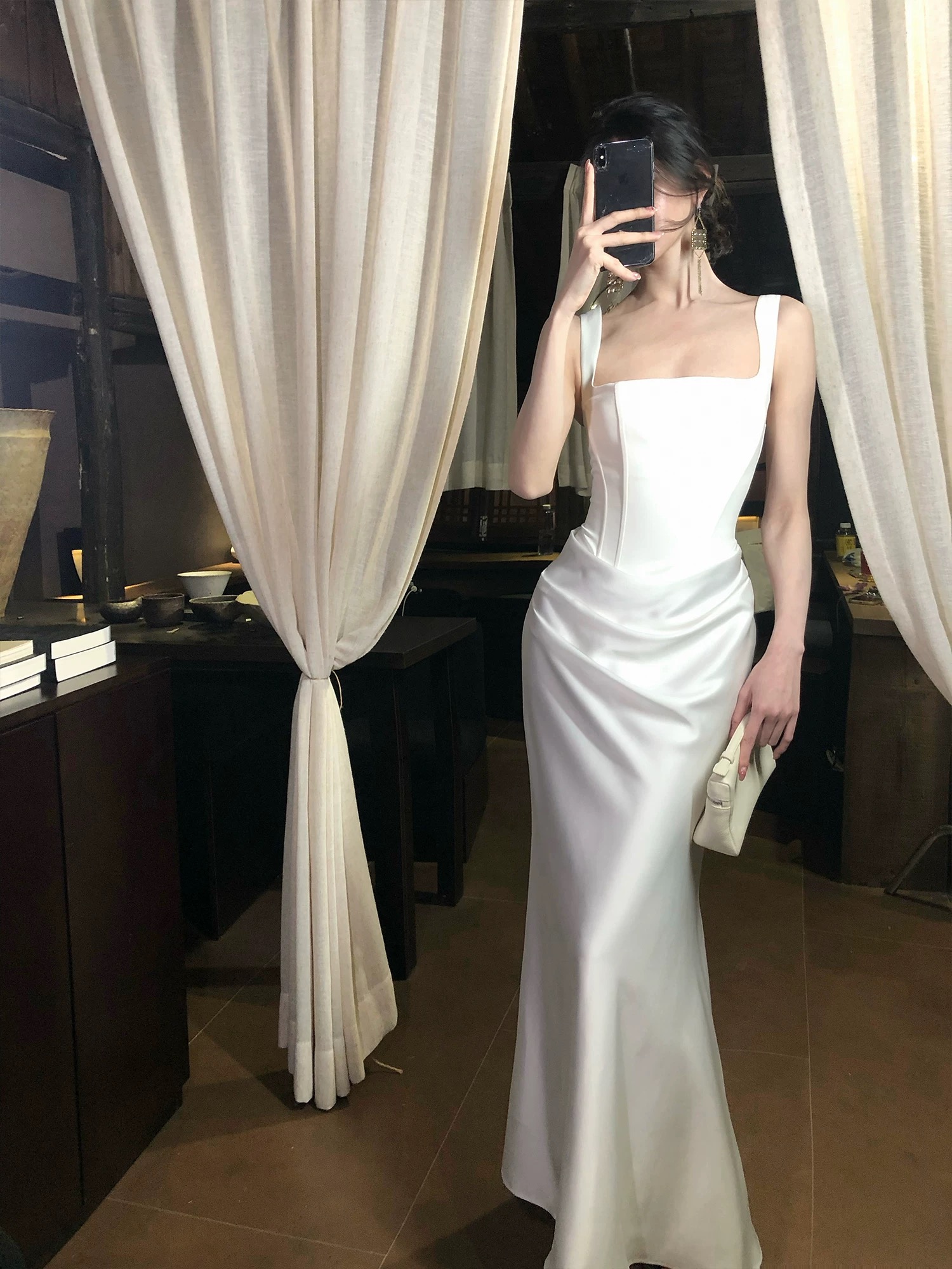 실사 참여 예복 고급 빛 럭셔리 작은 대중 연회 토스트 서비스 신부 슬립 주름 새틴 드레스