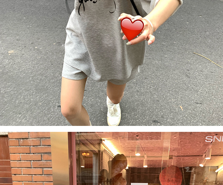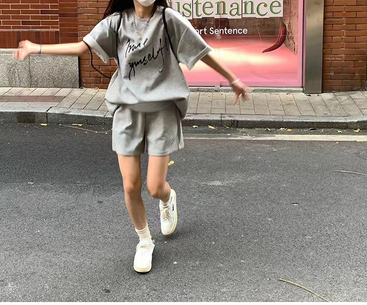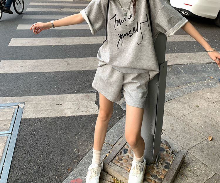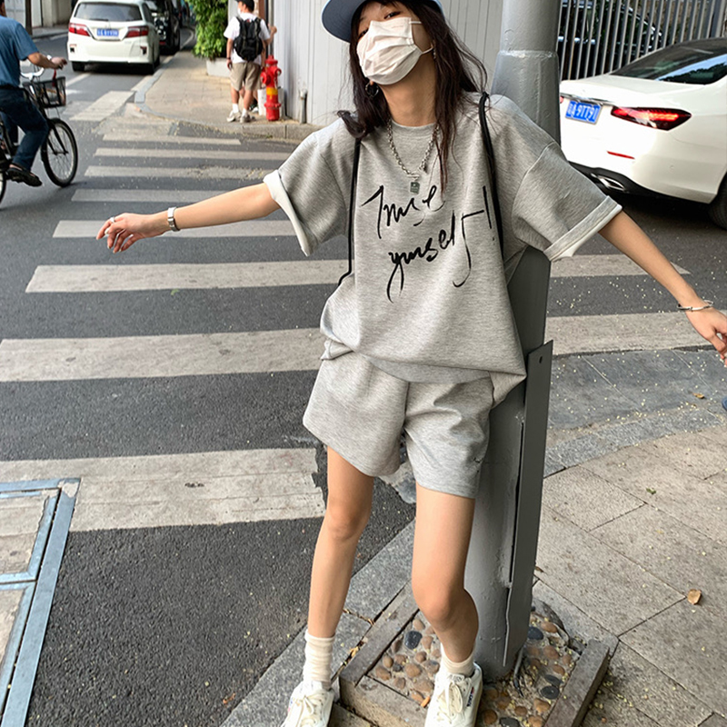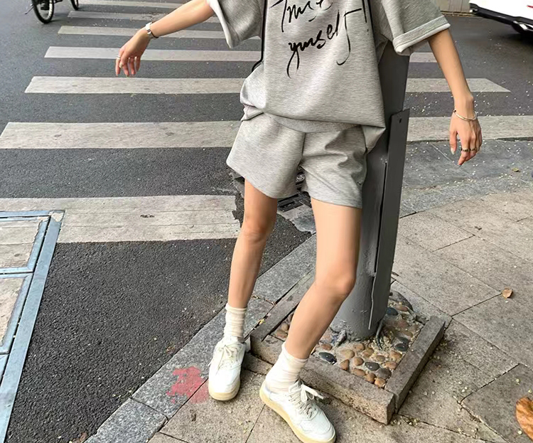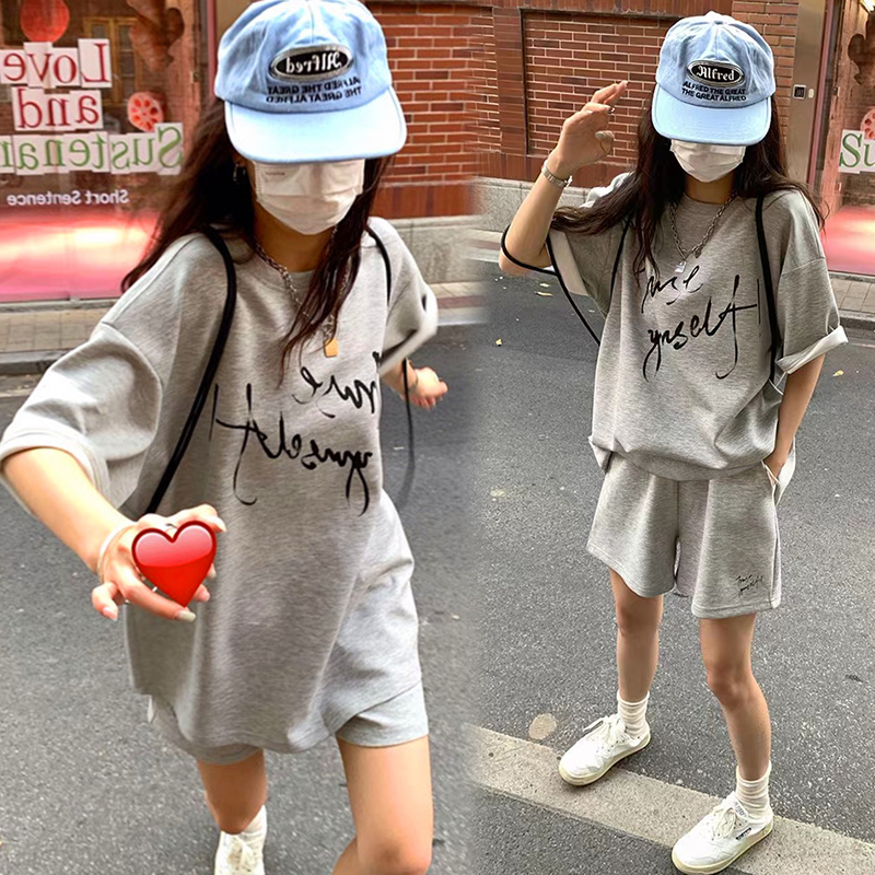 지금 임산부 새로운 회색 느긋한 바람 캐주얼 여름 한 부서 나비 매듭 반팔 반바지 투피스 세트 세트