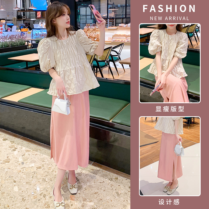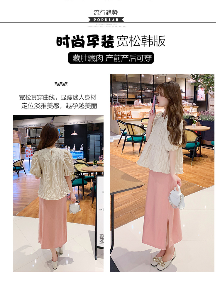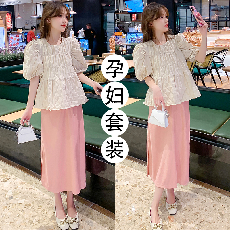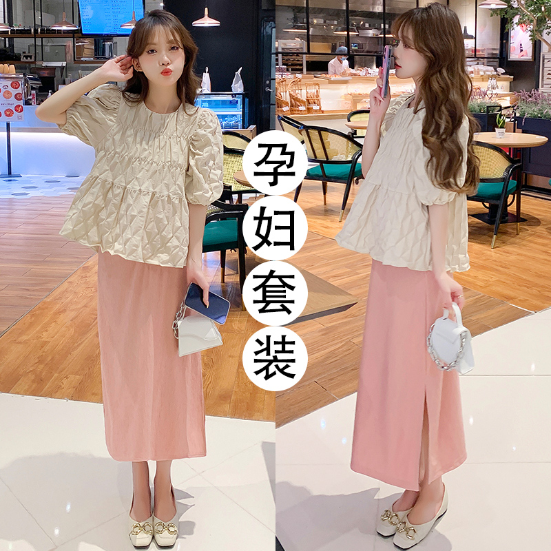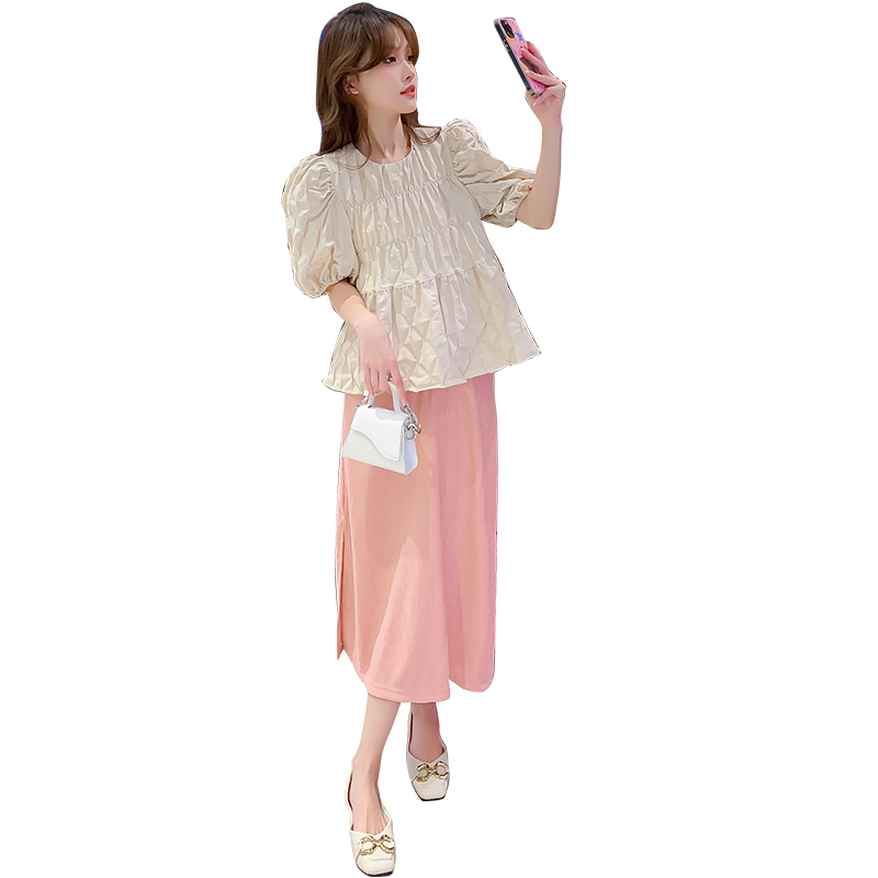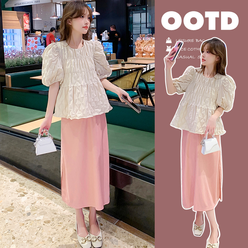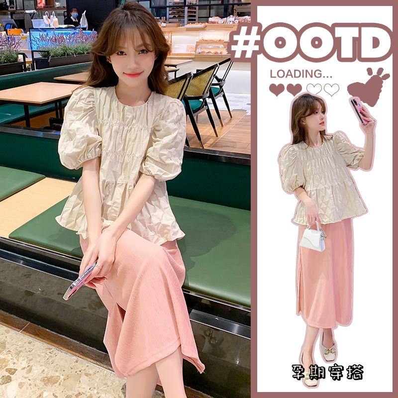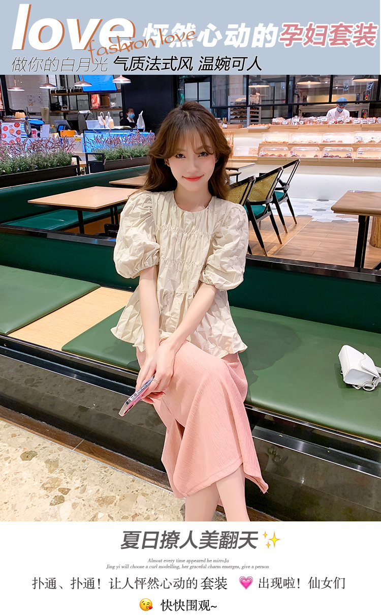 지금 임산부 세트 새로운 패치워크 디자인 루즈핏 맨위 프랑스식 달콤한 다용도 쇼트 스타일 주름 반팔 미니 스커트 세트