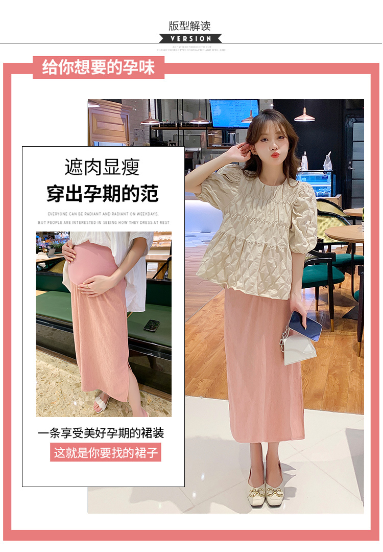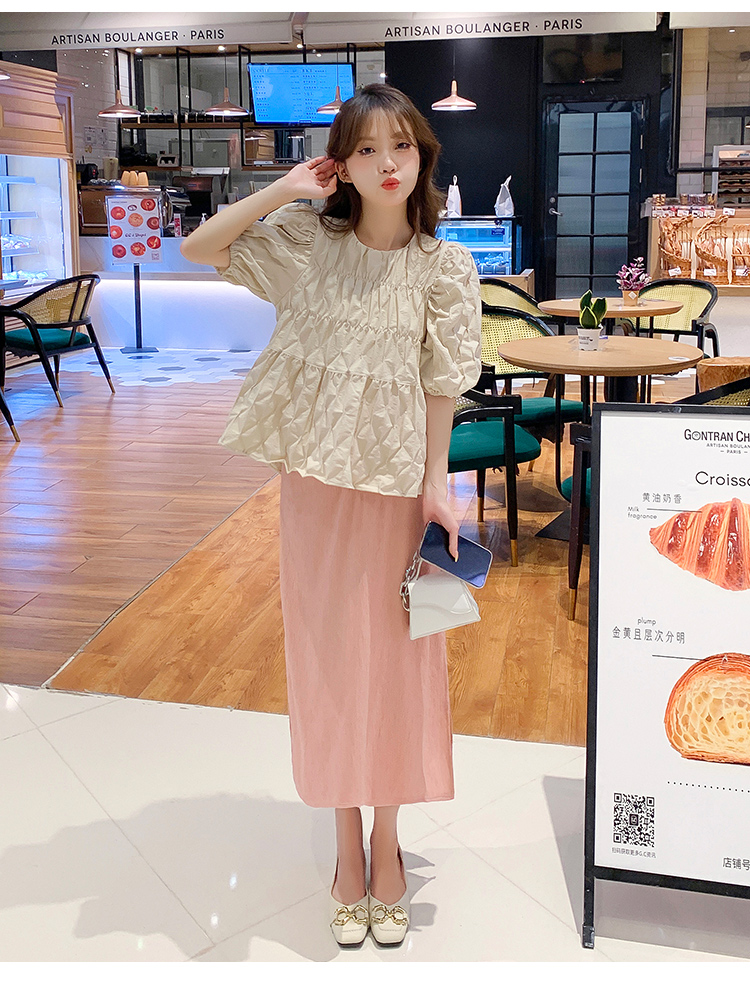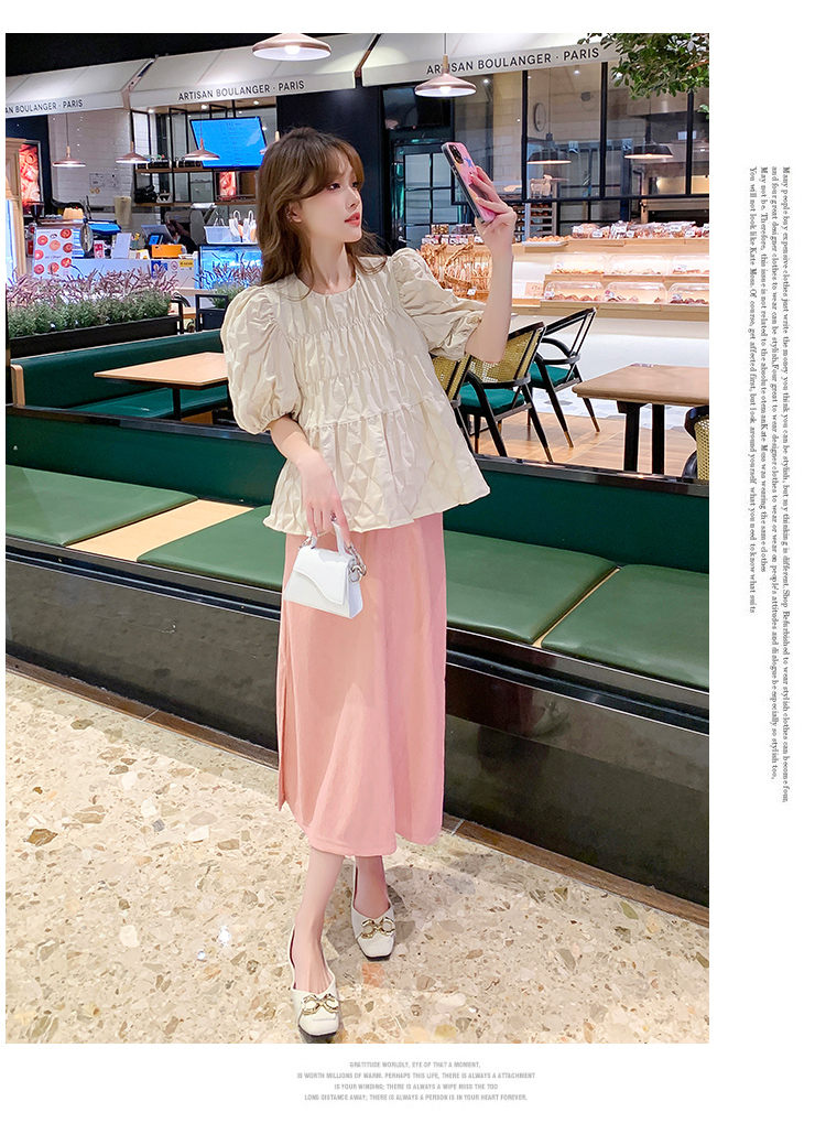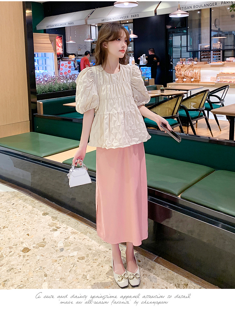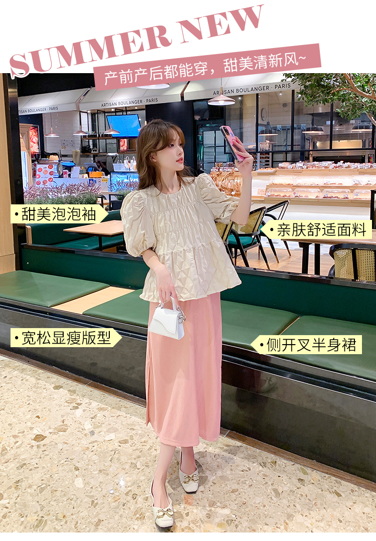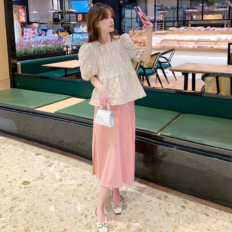 주간 고양이 품질 실사 여름 다용도 임산부 프랑스식 디자인 센스 주름 거품 소매 맨위 분말 트임 롱 스커트