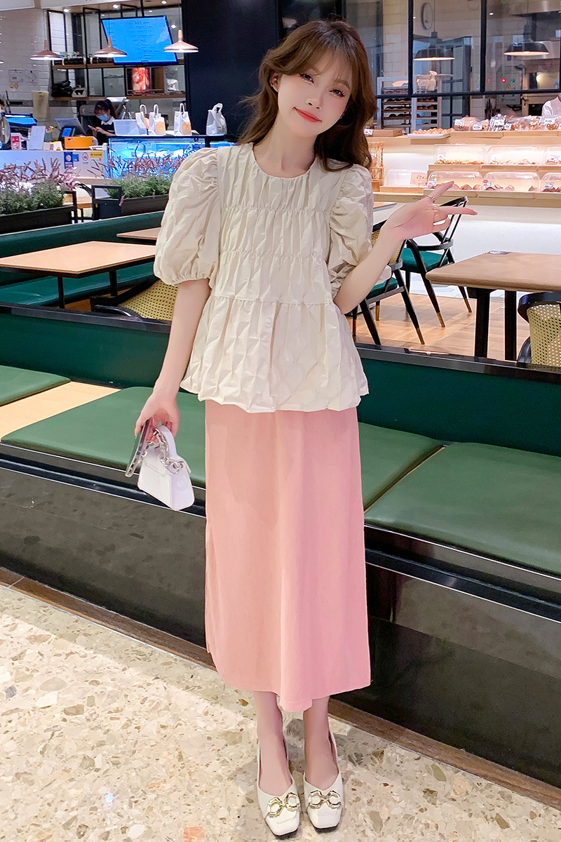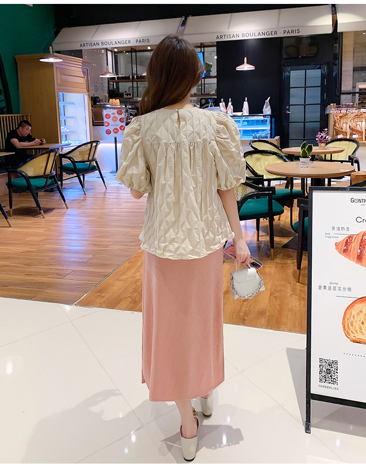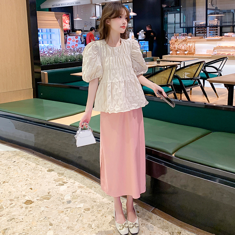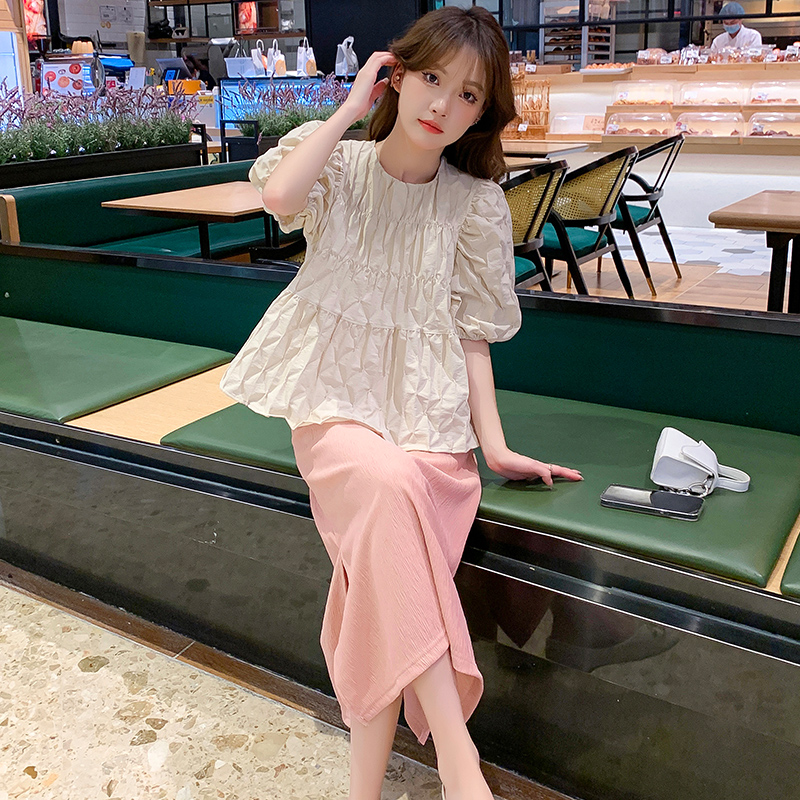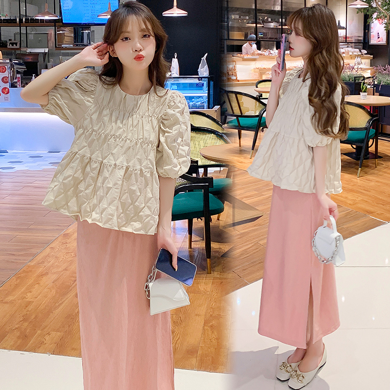 주간 고양이 품질 실사 여름 다용도 임산부 프랑스식 디자인 센스 주름 거품 소매 맨위 분말 트임 롱 스커트