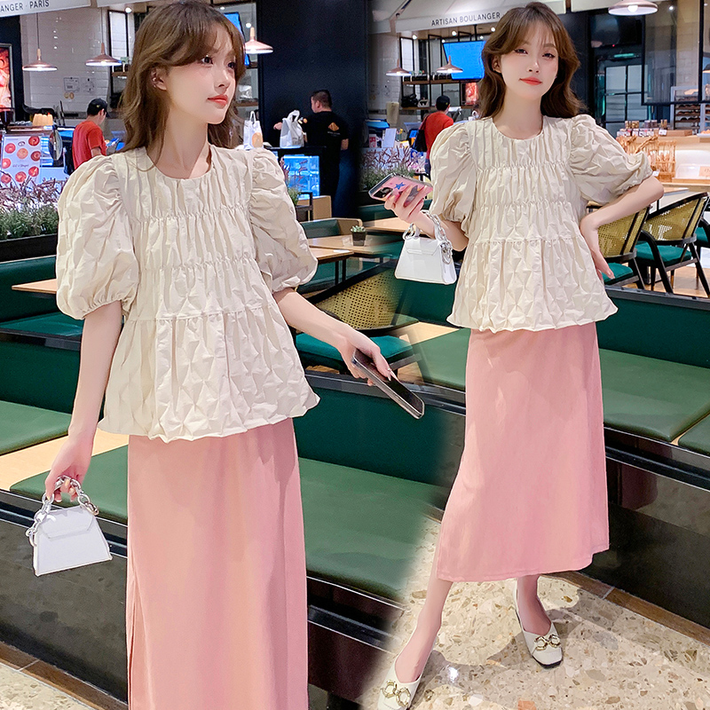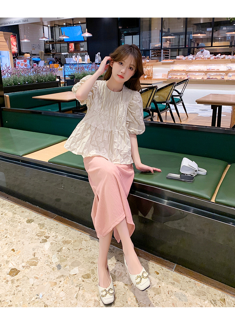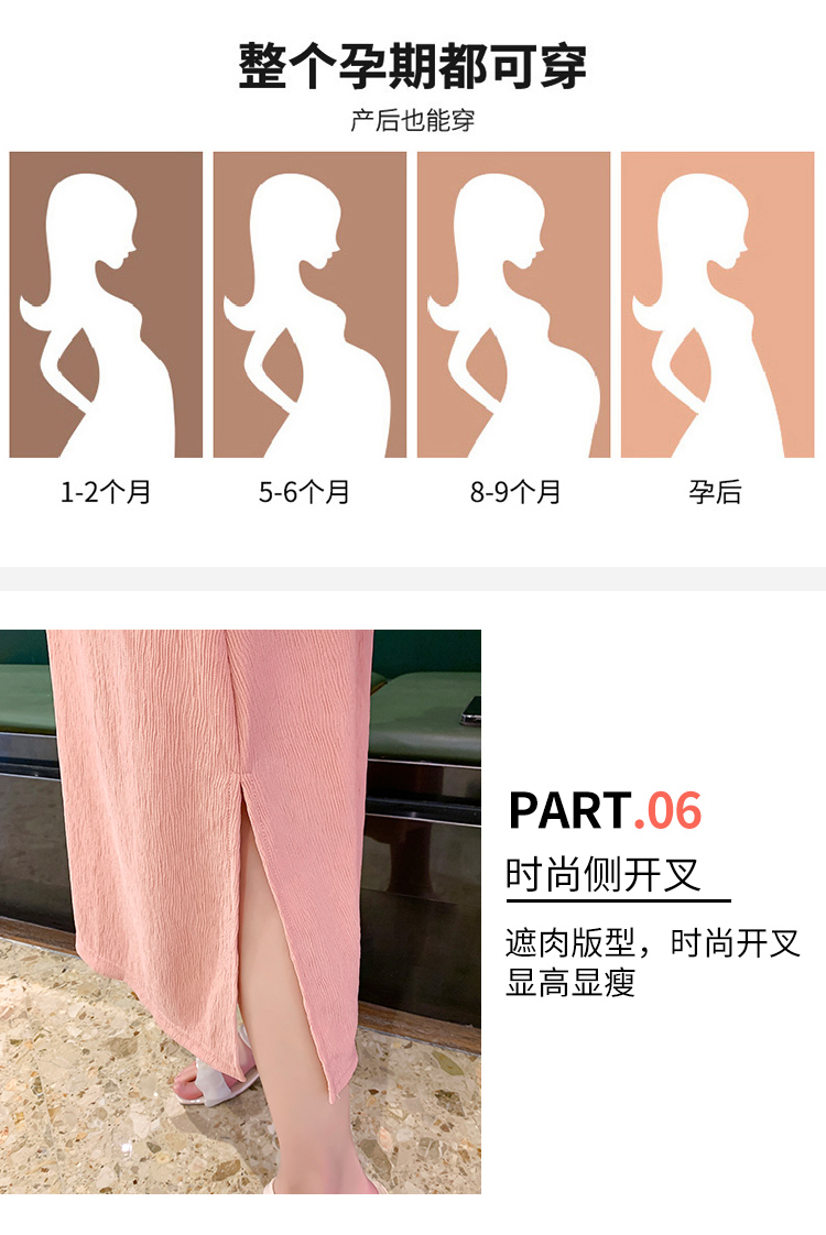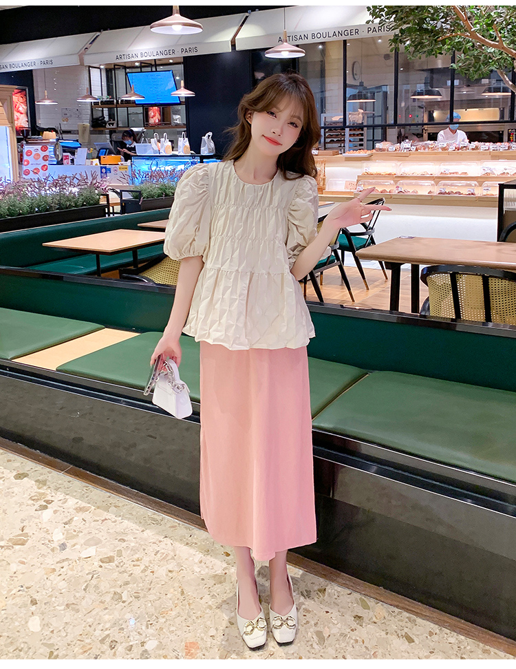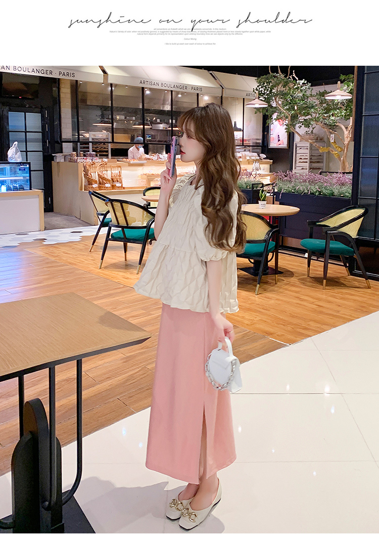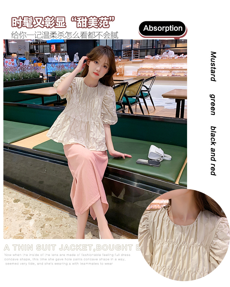 주간 고양이 품질 실사 여름 다용도 임산부 프랑스식 디자인 센스 주름 거품 소매 맨위 분말 트임 롱 스커트